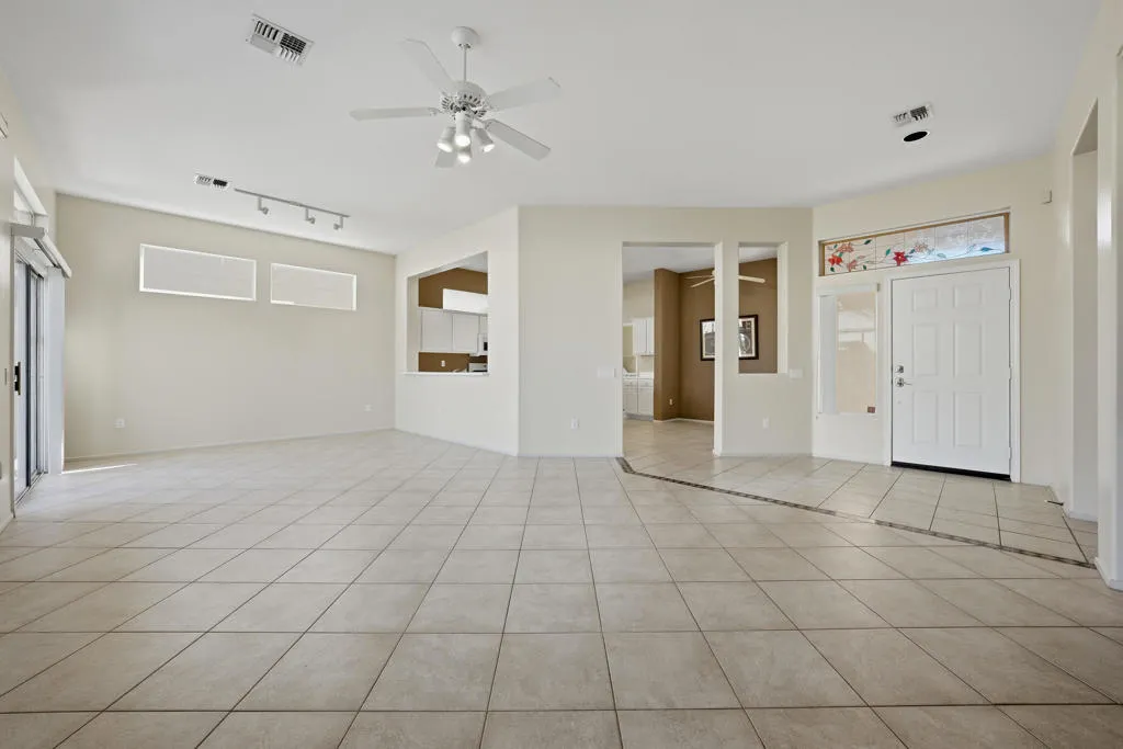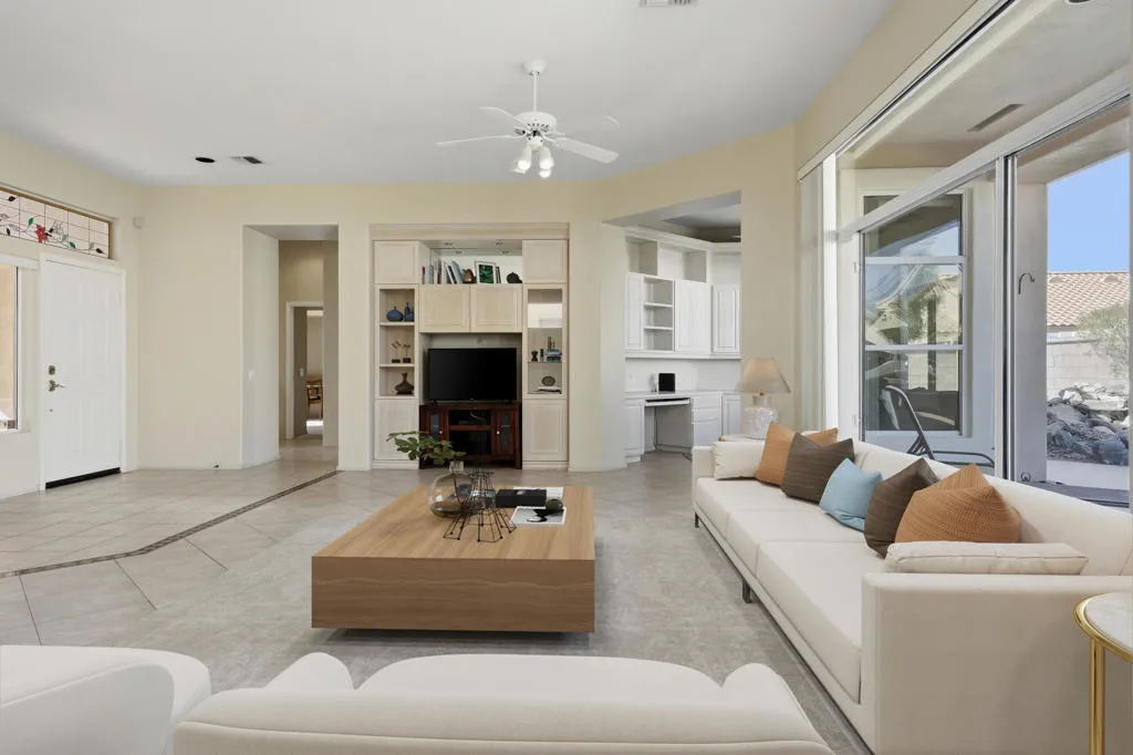 Sun City Palm Desert - Morocco. This popular great room floor plan offers exceptional potential and is attractively priced to allow you to update and personalize to your taste. The spacious north-facing rear yard features an extended patio, low-maintenance desert landscaping, and peekaboo mountain views--ideal for relaxed desert living. A gated front courtyard with patio adds both curb appeal and everyday functionality. Inside, 10-foot ceilings and transom windows create a light, open atmosphere. Tile flooring extends throughout the home except for the guest bedroom. The kitchen is equipped with Corian countertops, raised-panel cabinetry, and a chef's island, and flows seamlessly into the great room. Custom built-ins enhance the great room, den/office, and guest bedroom, adding style and storage. Double doors lead to the primary suite, featuring a bay window and a spacious walk-in closet with built-in organizers. The primary bath includes dual sinks and a glass-enclosed stall shower, while the guest bathroom offers a tub/shower combination. The two-car garage includes an enclosed, air-conditioned workspace that can easily be removed to restore golf cart parking if desired.