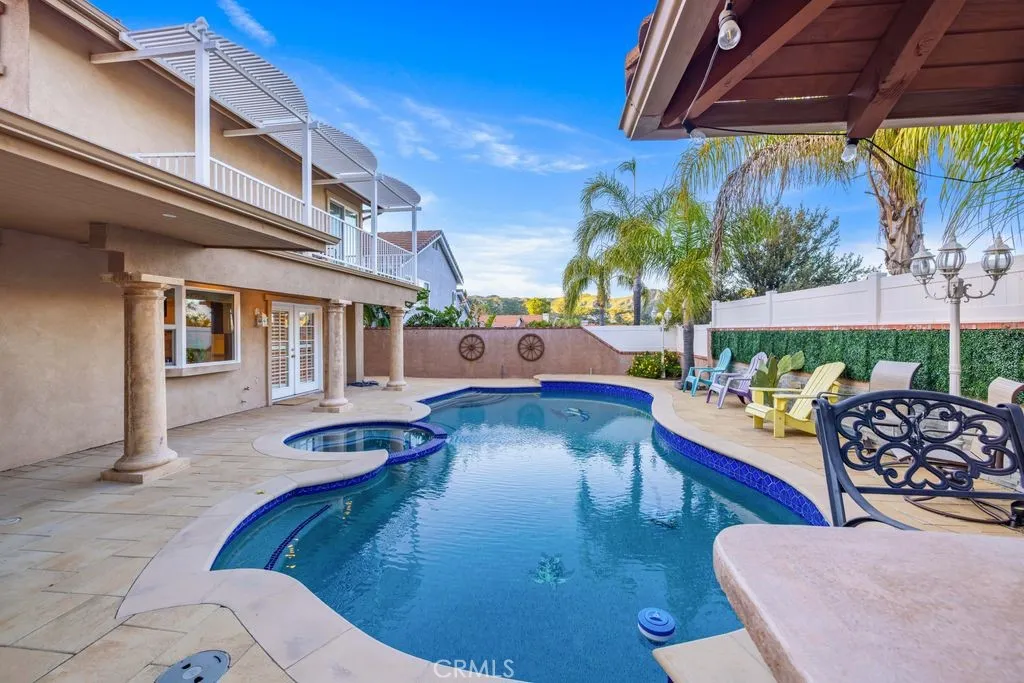 The formal dining room offers French doors that open to the backyard, while the upgraded kitchen is equipped with ceramic tile flooring, abundant cabinetry, granite countertops with high backsplash, breakfast bar, newer stainless steel gas range & microwave, & a large bay window overlooking the sparkling pool. An adjacent casual dining area includes a second set of French doors providing seamless indoor-outdoor flow. The spacious family room features a custom fireplace with built-in entertainment centers & generous storage beneath the staircase. A guest powder room completes the main level. The three-car garage has been professionally converted into two separate rooms while retaining storage space and can easily be restored if desired. Upstairs, the expansive primary suite includes a large retreat area originally offered as a builder’s fourth bedroom option, a walk-in closet, & sliding doors leading to a private balcony with stunning views of the entertainer’s backyard & surrounding mountains. The ensuite bathroom offers a dual-sink vanity, oversized soaking tub with shower, private water closet, & custom closet organizers. Two additional bedrooms & a tastefully updated bathroom complete the second floor. The backyard is a true private oasis featuring a large covered patio with recessed lighting & ceiling fan, concrete hardscape, Pebble Tech pool & spa with extensive upgrades, & a custom gazebo with gas grill, sink, & countertop. Additional highlights include dual-pane windows, whole house fan, tankless water heater, outdoor stone wall paneling, stucco window trim, automatic pool water leveler, plantation shutters throughout, ceiling fans, crown molding, new single unit toilets, oversized A/C unit, newer gutters & downspouts, upgraded pool equipment, new sprinkler system, & no HOA or Mello-Roos. Ideally located near Castaic Lake, shopping, dining, schools, & freeway access.