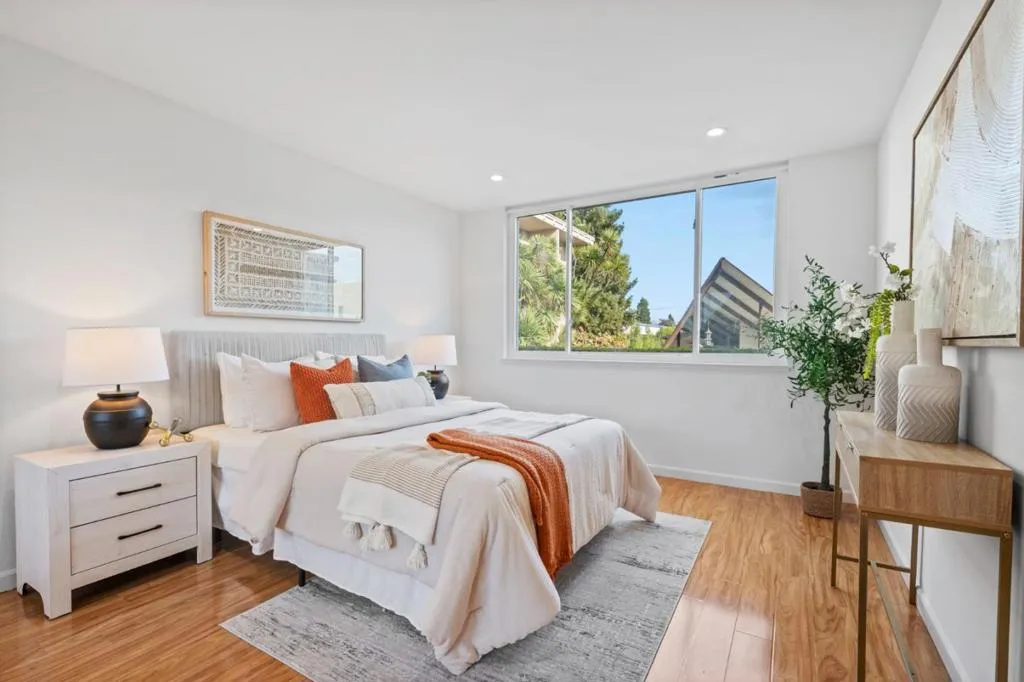 Just one-half mile from downtown San Mateo and one mile from Burlingame Avenue, this rarely available first-floor condominium has 3 bedrooms and 2 baths in a signature mid-century building. Ideal opportunity for downsizing without giving up space or location. Towering porte cochere entry, secure access to an atrium-style lobby, or from the gated underground garage. The updated and thoughtfully arranged floor plan has abundant natural light with expansive tree and clubhouse view windows. Recent updates include gleaming laminate wood floors, refreshed kitchen and baths, updated lighting, and a soft neutral palette. Bedrooms are privately positioned, including a primary suite with extensive closet space and a beautifully finished bath, plus there are two bedrooms and a bath in a separate wing. Same-floor coin laundry with storage unit, and a mid-century clubhouse with pool, spa, sauna, and fitness center. Midway between San Francisco and Silicon Valley and just minutes to SFO.