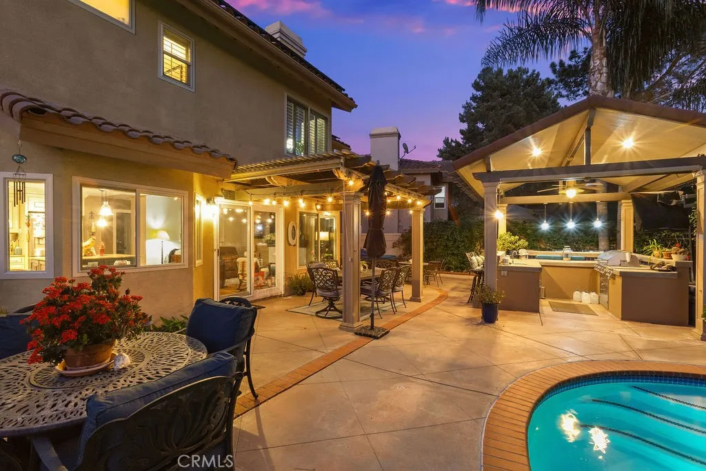 Incredible opportunity for this 3-bedroom, 2.5-bath pool home tucked away at the end of a quiet cul-de-sac in the highly sought-after Bel Air community of Mission Viejo. Upon entering the home the formal living room flows seamlessly into the dining area and onward to the beautifully remodeled kitchen, featuring upgraded custom cabinetry, soft-close drawers, granite countertops, a large center island with built-in wine chiller, high-end Samsung appliances, and a sunny dining nook overlooking the spectacular backyard and pool. The kitchen opens directly to the family room with a fireplace and serene views of the pool and spa. The primary suite is a true retreat, offering a spa-like bathroom with a travertine-lined walk-in shower and bench, granite counters, dual vanities with soft-close drawers, designer lighting, framed mirrors, and a walk-in closet with sleek opaque silhouette glass sliding doors. Both the hallway and downstairs bathrooms have also been upgraded. Designed for indoor-outdoor living, the resort-style backyard is truly an entertainer’s dream. The covered outdoor kitchen is complete with bar seating, a premium five-burner Bull BBQ with two side burners, Flame outdoor refrigerator, and hot/cold water sink. The sparkling pool and attached spa have newer Pentair pool equipment, all conveniently controlled via a phone app--along with outdoor lighting and music in both the front and back yards. Additional highlights include solar system (owned)for both house and pool (our sellers heated pool April thru October & with AC in summer had an electricity cost of approximately $400 over 12 months!), newer dual pane windows throughout, plantation shutters and newer AC and furnace. The oversized 2-car attached garage includes cabinetry. shelving and epoxy floors. As an added bonus, the home includes membership to Lake Mission Viejo, offering boating, fishing, beach access, concerts, and an unforgettable Fourth of July fireworks show.