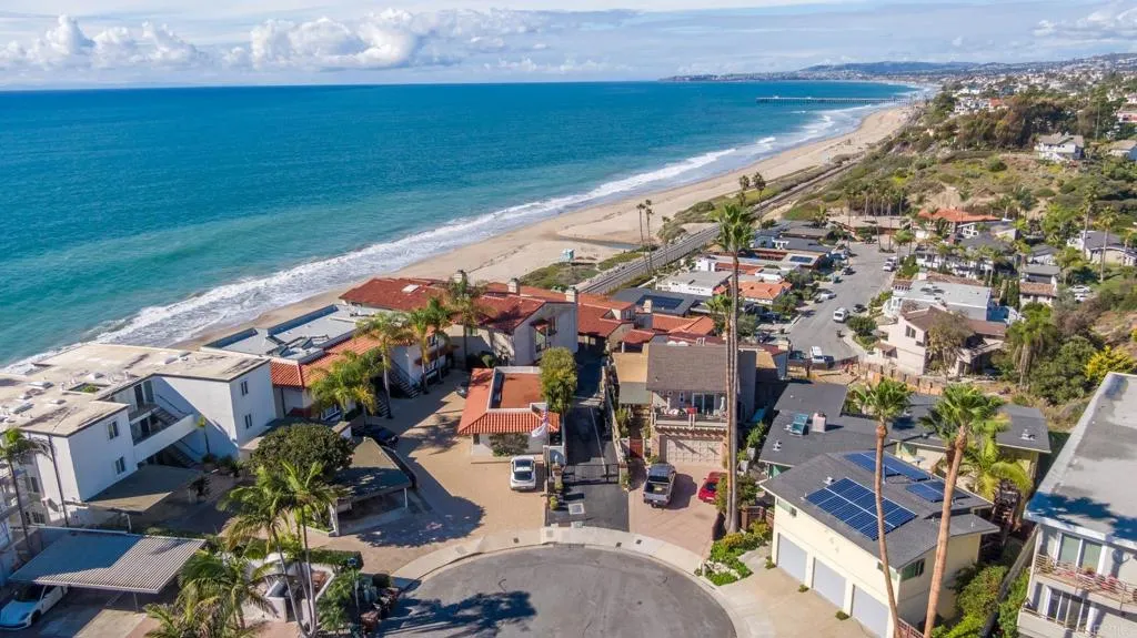 Perched right over the beach with spectacular, unobstructed views of the Pacific Ocean, Catalina Island and San Clemente Pier, this condominium offers access to Calafia Beach and the San Clemente Pedestrian Beach Trail leading to the Pier, restaurants, shops and more. This generously sized two-bedroom condominium is one of just nine residences within the exclusive Sea Point Villas community. Experience stunning sunsets from the living room, by the fireplace, or from the primary bedroom and bathroom on the upper level. The primary bedroom suite features a lovers' balcony with a gorgeous ocean view, walk-in closet and huge bathroom with double sinks. The second upstairs bedroom includes a bathroom with a walk-in shower and two closets. The open floor plan offers flexibility with two options off the bright kitchen for dining, den or office. Laundry hook-up is conveniently located in the upstairs hallway. A large skylight in the stairwell brings in natural light and two balconies maximize enjoyment of the ocean views and breezes. Behind the gate a spacious two-car garage includes a storage closet and work bench. You must see this condo to appreciate its unique location and features.