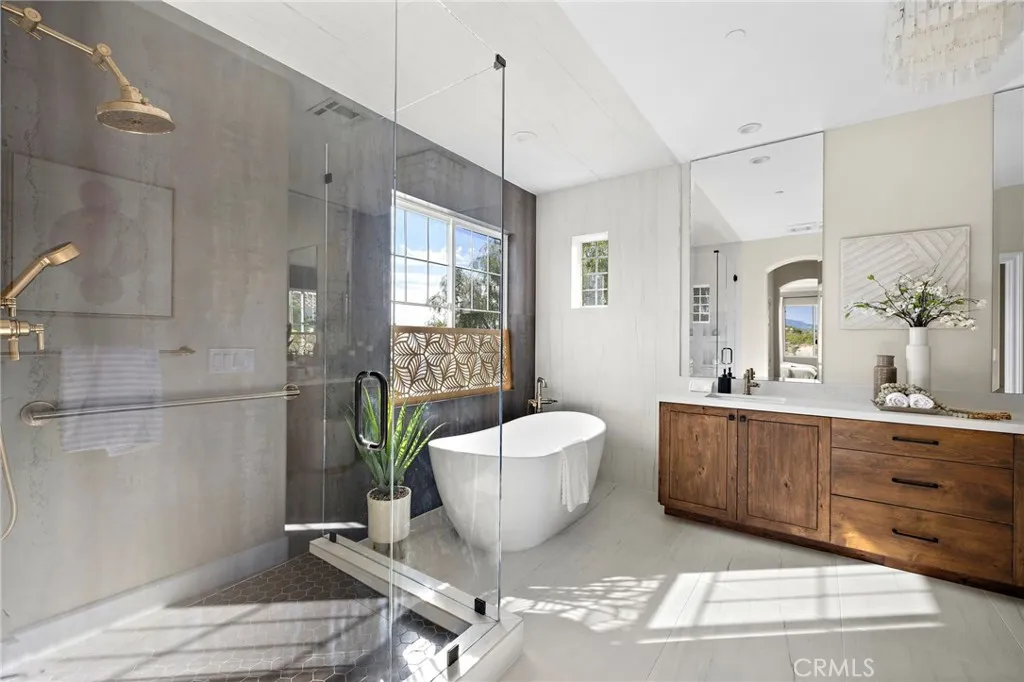 Upstairs, the primary suite is set apart as a private sanctuary. A Dutch door opens to a balcony with open canyon views and soft morning light, offering a peaceful setting to greet the sunrise. The spa inspired bath features dual vanities, a freestanding jetted tub, modern lighting, and two walk-in closets. Three additional bedrooms and a full laundry room with utility sink complete the upper level.