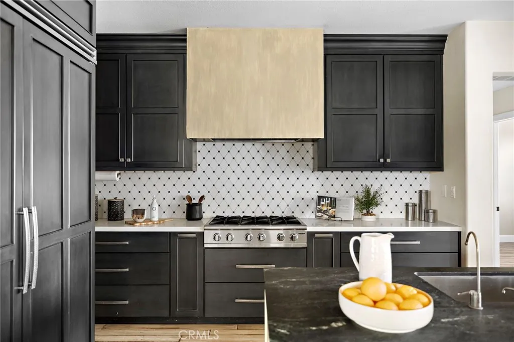 This five bedroom, three bathroom residence is anchored by a beautifully appointed chef’s kitchen designed for both function and flow. Deep 42 inch storage drawers, discreet electrical outlets, and a custom pull-out system for pots and pans support everyday use, while a professional grade appliance suite including a 35 inch Capital range with hood, 48 inch Viking refrigerator, Bosch dishwasher, and JennAir Noir double ovens grounds the space with understated capability. A marble backsplash pairs seamlessly with quartz and soapstone countertops, complemented by a spacious walk-in pantry. Appliance garages at the breakfast bar keep coffee and kitchen essentials neatly tucked away, preserving clean lines and visual calm.