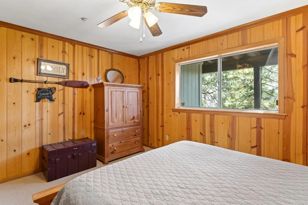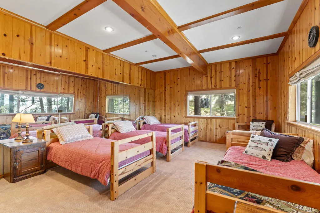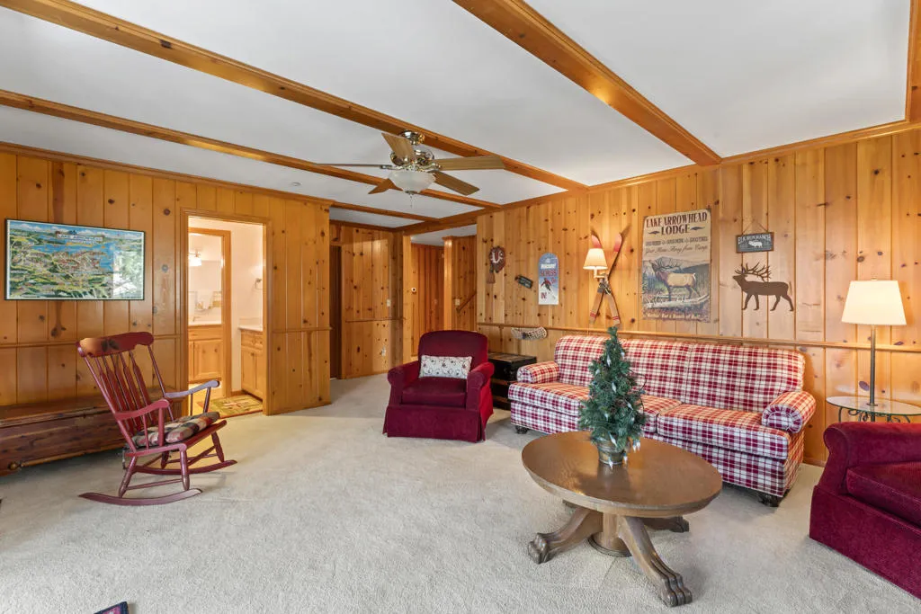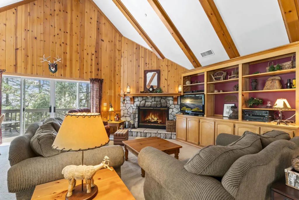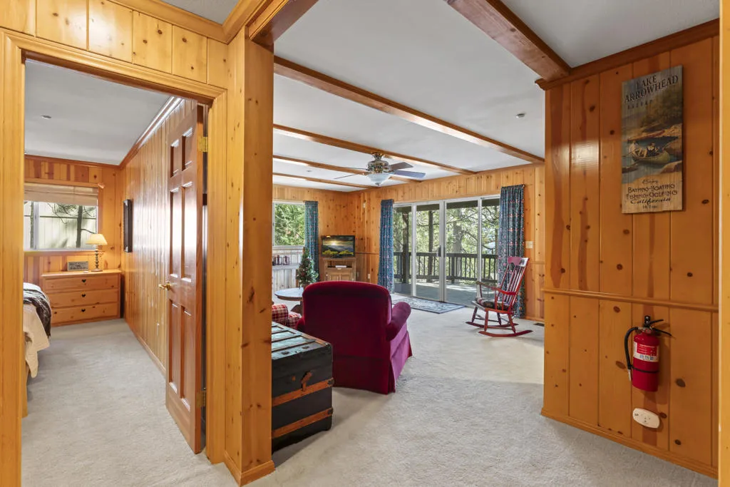 Experience mountain living in this beautifully remodeled Lake Arrowhead retreat with lake rights. Designed to blend luxury, comfort, and natural beauty, this lodge-style home offers five bedrooms--including an impressive bunk room--and four bathrooms. Offered fully furnished and move-in ready, it's an exceptional turnkey opportunity for full-time living, second-home enjoyment, or investment. Level entry provides easy year-round access with an oversized two-car garage and generous driveway, on an paved and maintained county road. Inside, soaring cathedral ceilings and an open-concept great room create a dramatic yet inviting atmosphere, anchored by a striking river rock fireplace. The chef's kitchen features granite countertops, a center island, and breakfast bar seating for five, flowing into a dining area that comfortably seats ten--ideal for entertaining and gatherings. A spacious Trex deck extends the living space outdoors for relaxing or hosting under the pines. The main level includes a well-appointed bedroom with deck access and a full bath. Downstairs, two separate family rooms offer flexible living spaces, along with a luxurious primary suite with its own fireplace and three additional bedrooms. The expansive bunk room features beds, ample storage, and a newly remodeled bath, with potential for alternative use as a gym, studio, or maybe even a separate apartment to help offset your mortgage payments. Multiple decks provide private outdoor retreats, while a fire suppression system adds peace of mind. Previously celebrity-owned and located just minutes from The Village, this home offers convenient access to dining, shopping, and year-round recreation. Only 1.5 hours from Los Angeles, Newport Beach, or Palm Springs--this is a rare opportunity to own a refined mountain getaway in the heart of Lake Arrowhead.