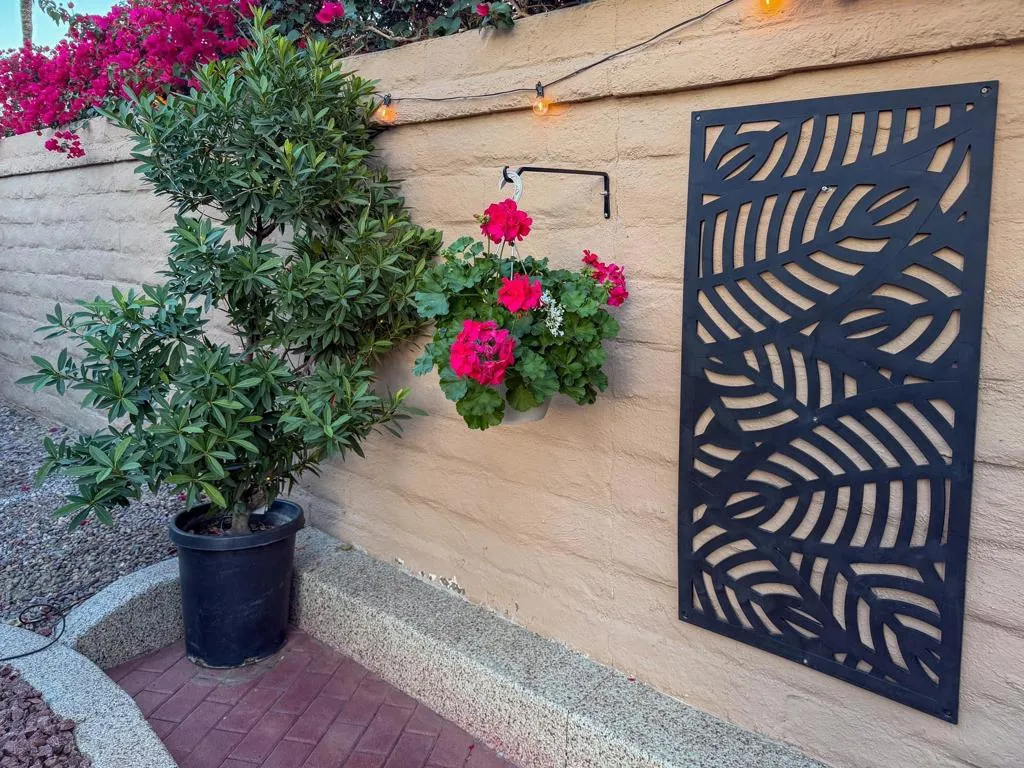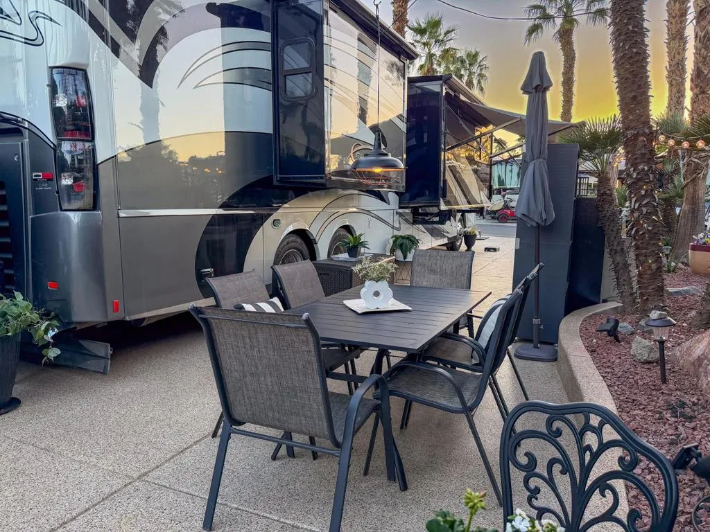 RV Lot #101 at Outdoor Resort Indio is a well-maintained, private luxury RV lot designed for comfortable outdoor living and relaxed entertaining. This desirable privacy lot features an epoxy flake-coated RV pad in excellent condition and a thoughtfully laid-out medium-size outdoor kitchen with two under-counter refrigerators, built-in barbecue, generous storage, and a new hot water heater.The outdoor living space is enhanced by a raised brick living area, accented with two metal art privacy fences that add both character and seclusion. Furnishings include a comfortable sofa, two chairs, two end tables, and a fire table, along with multiple dining options--an outdoor table with six chairs and an additional table with four chairs--perfect for hosting friends. Two hanging dining lights add warmth and ambiance in the evenings.Additional highlights include a tall rolling storage pantry, TV and stand positioned behind the coach, a mushroom heater, and lush, well-executed landscaping with extra palm trees that create a true oasis feel. This inviting, private lot is ideal for buyers seeking a move-in-ready setting with space to relax, entertain, and enjoy the ORI lifestyle--stop by and take a look anytime.‍Outdoor Resort Indio is a Class A only RV resort