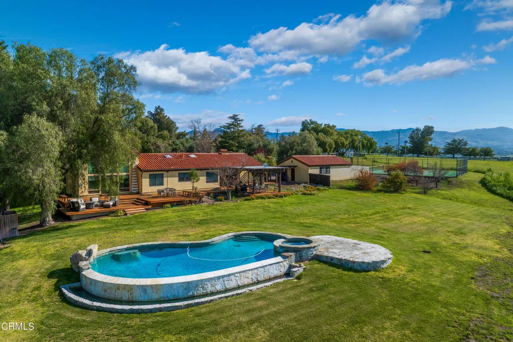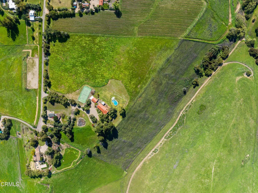 Set within Walking M Ranches along Ballard Canyon, 2851 Tapadero Road captures a peaceful setting framed by sweeping valley and mountain views. Offering 4 bedrooms and 3 bathrooms across approximately 2,499+/- square feet, the home blends comfort, character, and a front-row seat to the surrounding landscape.The living room sets the tone with wood-beamed ceilings, a striking stone fireplace, and oversized picture windows that showcase the scenery beyond. An inviting formal dining room provides an ideal space for entertaining, while the kitchen pairs classic farmhouse charm,complete with a farmhouse sink and stainless steel appliances, with a breakfast area positioned to take in panoramic views.A relaxed family room features built-in cabinetry and wine storage, perfect for casual evenings, while a charming loft accessed by ladder offers a cozy retreat or creative hideaway. The primary suite feels serene and private, highlighted by a skylight and wood-beamed ceiling.Outdoor living shines here. An expansive deck overlooks the pool and spa, creating an effortless setting for entertaining or unwinding against the valley backdrop. A lighted tennis/basketball court invites recreation day or night, while a petite guest house and barn overlook the boutique Petite Syrah vineyard, adding to the property's authentic ranch ambiance.Located within the Los Olivos Elementary and Santa Ynez Valley Union High School Districts, this Ballard Canyon property offers a rare blend of views, versatility, and classic Santa Ynez Valley charm.