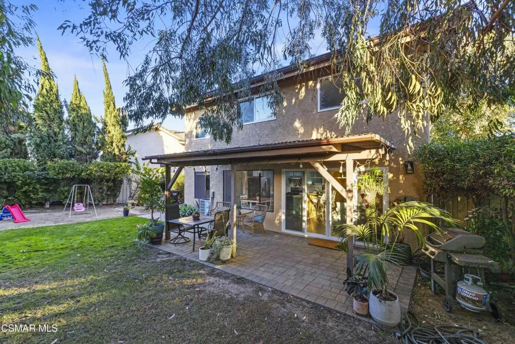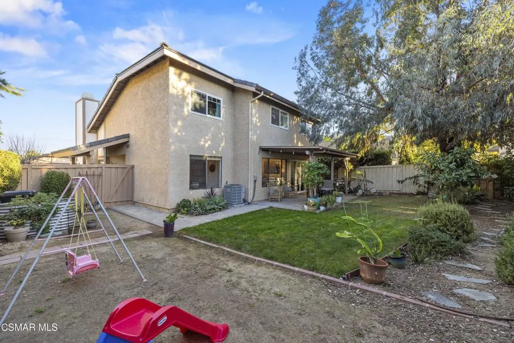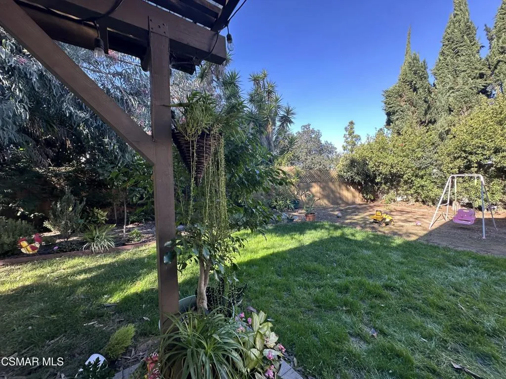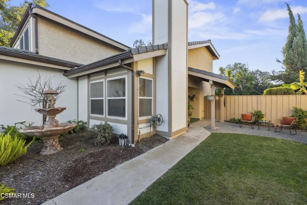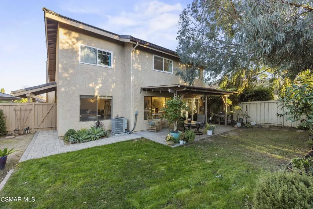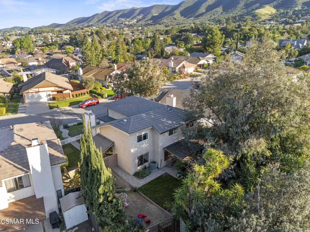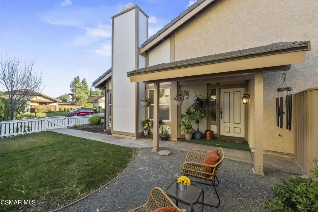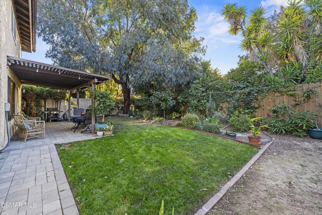 Your white picket fence dream home awaits! Enjoy 4 Bedrooms, 2.5 Baths with nearly 2100 square feet of living space all in a serene location on a quiet cul de sac. This floorplan boasts so much natural light with a spacious formal living room featuring vaulted ceiling and fireplace, a formal dining room, plus an eat in kitchen-great room with den. Wonderful recent updates (approximately 2022) have been done including new roof, new HVAC system (AC, Furnace and Ducting), new interlocking pavers in front and back and brand new french sliding doors. Additional upgrades include wood-like laminate flooring throughout the downstairs and dual paned windows. The Primary Suite boasts laminate flooring, a walk in closet, dual sink vanity and spacious shower. The 4th bedroom features a princess balcony open to the living room below. Both the front and back yards of this beautiful home are enchanting. The back yard has a lovely covered patio, lush trees and greenery including a grassy space, vegetable garden and bonus space ready for your imagination. This property has a VA loan that is assumable to VA approved Buyers at 2.5%. Enjoy award winning Conejo Valley USD schools and close proximity to the library, highway 101, dining, shopping, parks and hiking.