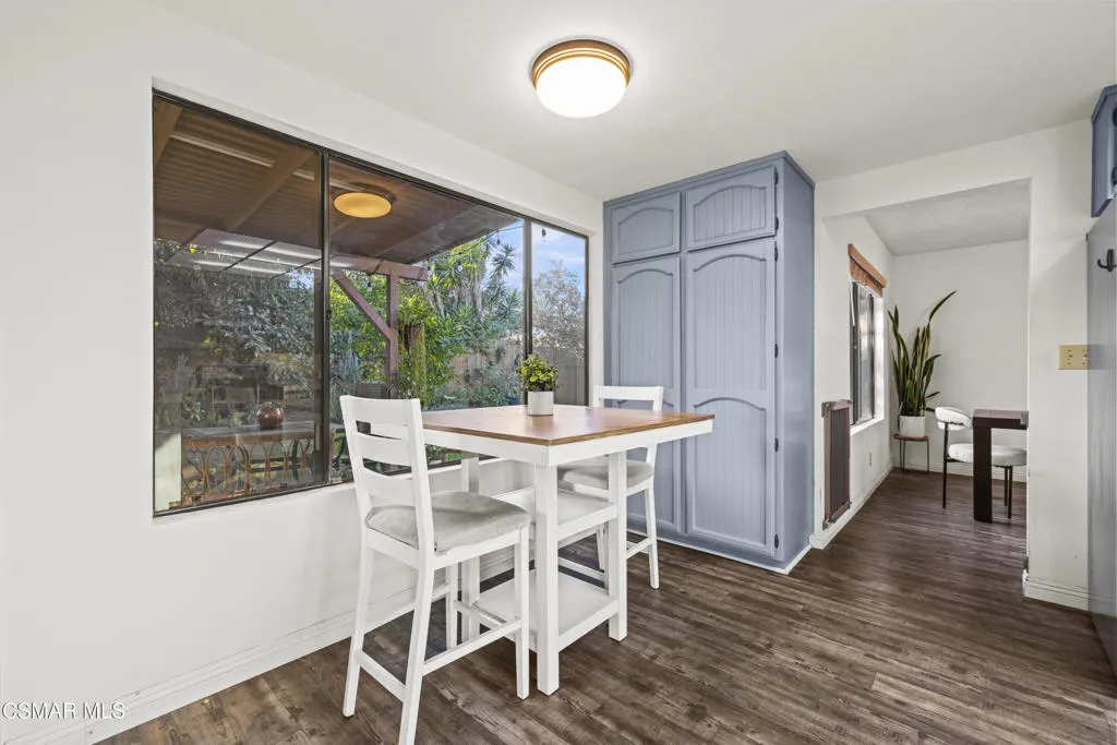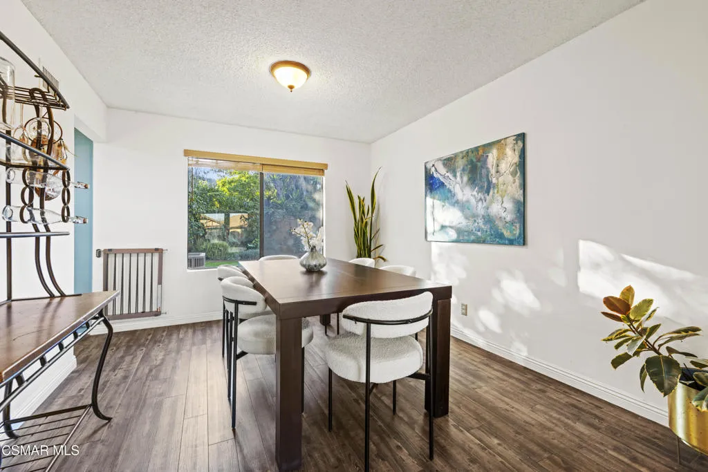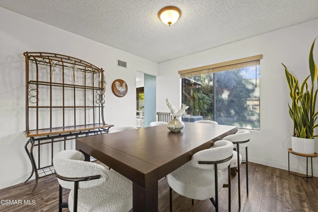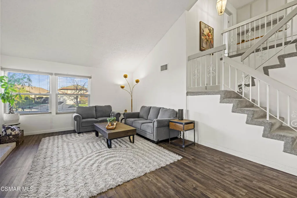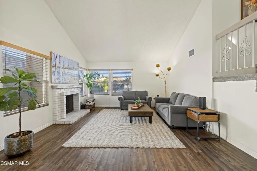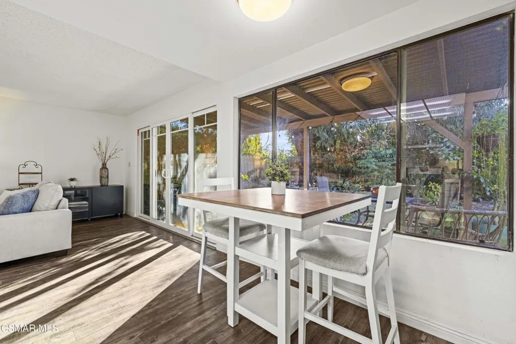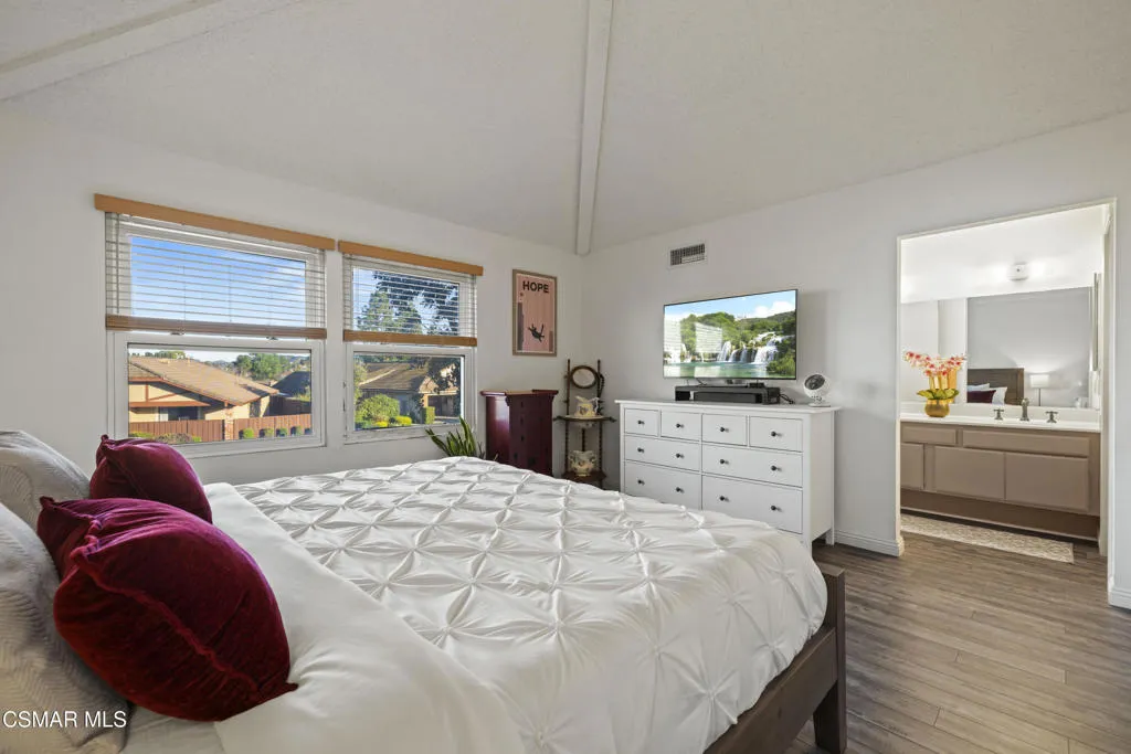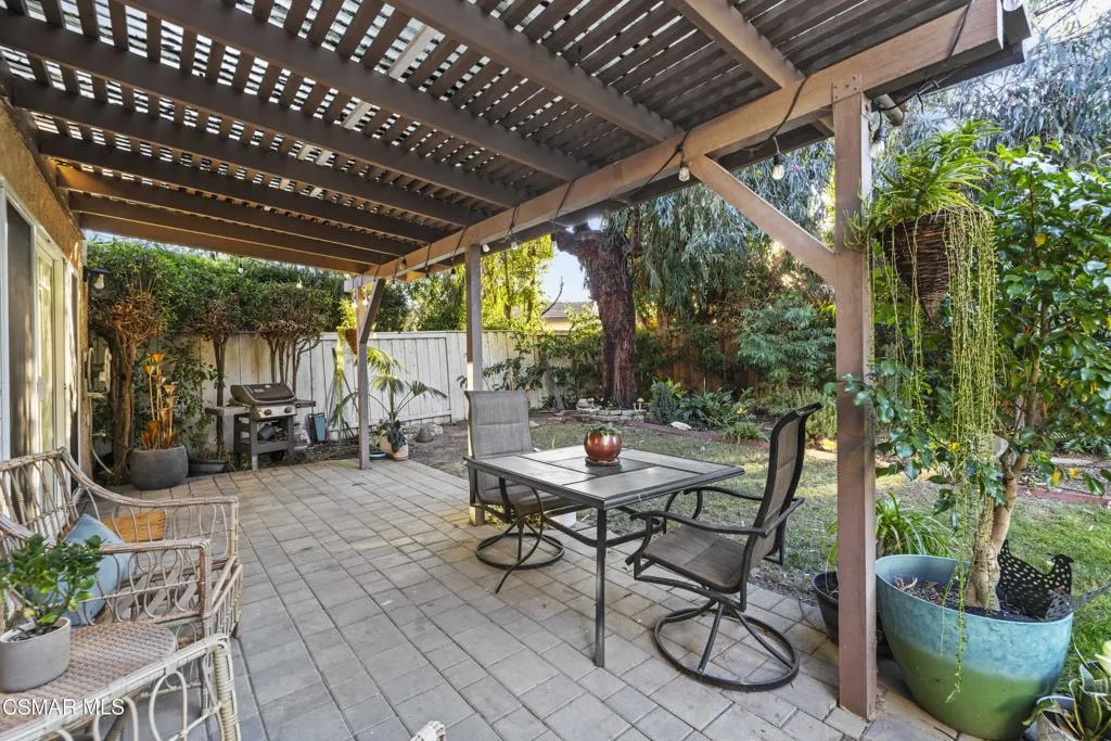 Your white picket fence dream home awaits! Enjoy 4 Bedrooms, 2.5 Baths with nearly 2100 square feet of living space all in a serene location on a quiet cul de sac. This floorplan boasts so much natural light with a spacious formal living room featuring vaulted ceiling and fireplace, a formal dining room, plus an eat in kitchen-great room with den. Wonderful recent updates (approximately 2022) have been done including new roof, new HVAC system (AC, Furnace and Ducting), new interlocking pavers in front and back and brand new french sliding doors. Additional upgrades include wood-like laminate flooring throughout the downstairs and dual paned windows. The Primary Suite boasts laminate flooring, a walk in closet, dual sink vanity and spacious shower. The 4th bedroom features a princess balcony open to the living room below. Both the front and back yards of this beautiful home are enchanting. The back yard has a lovely covered patio, lush trees and greenery including a grassy space, vegetable garden and bonus space ready for your imagination. This property has a VA loan that is assumable to VA approved Buyers at 2.5%. Enjoy award winning Conejo Valley USD schools and close proximity to the library, highway 101, dining, shopping, parks and hiking.