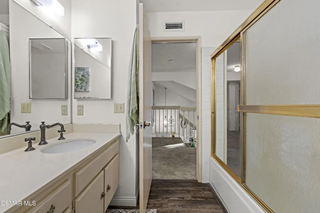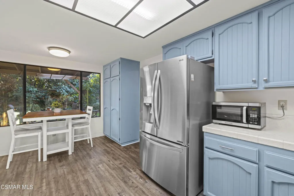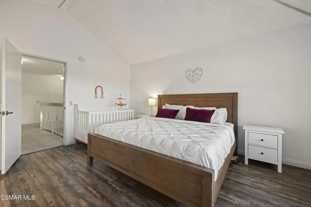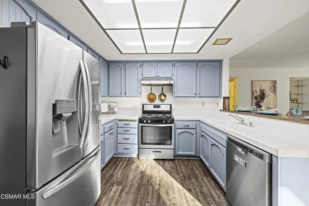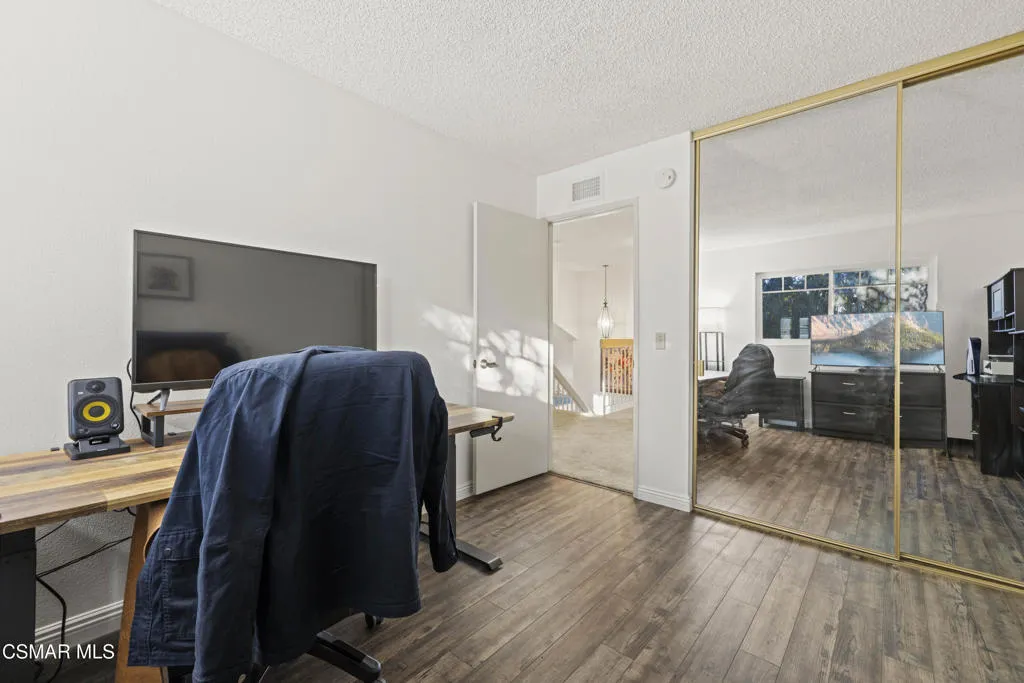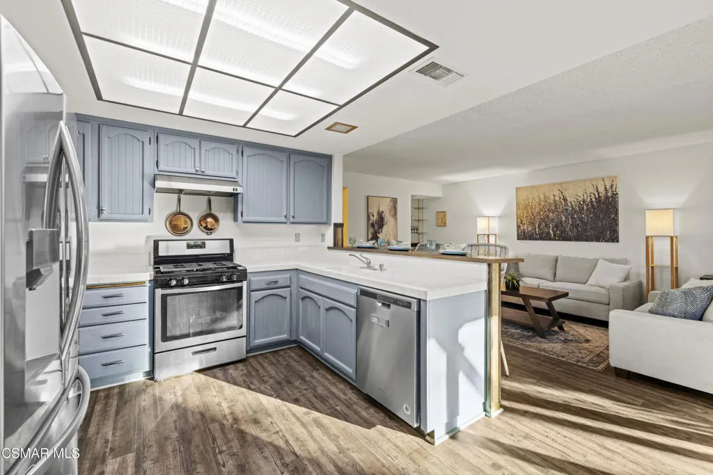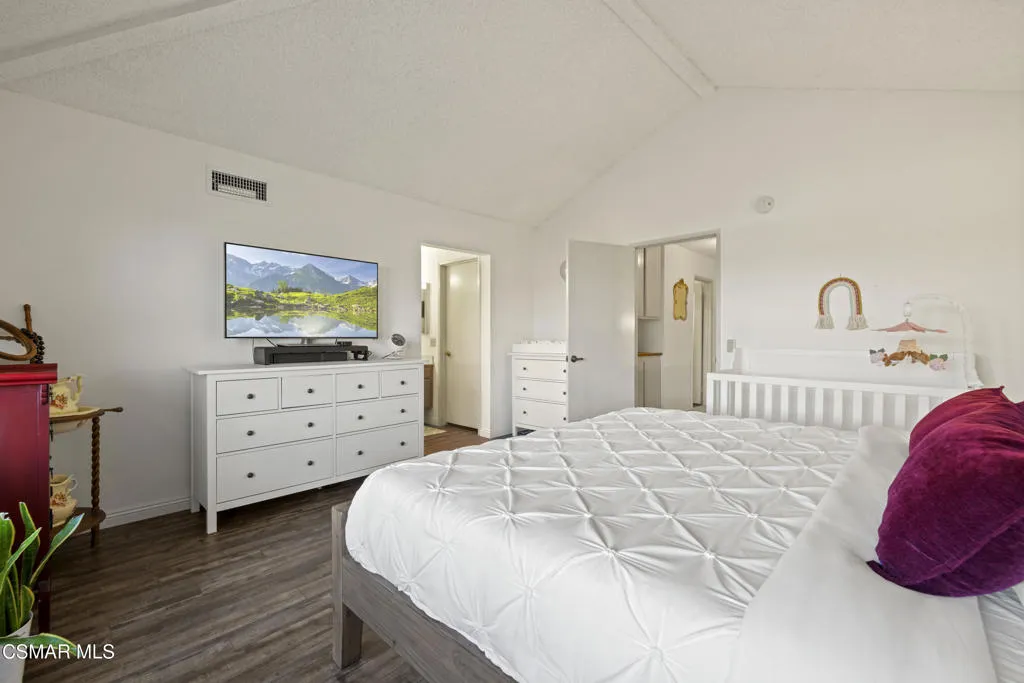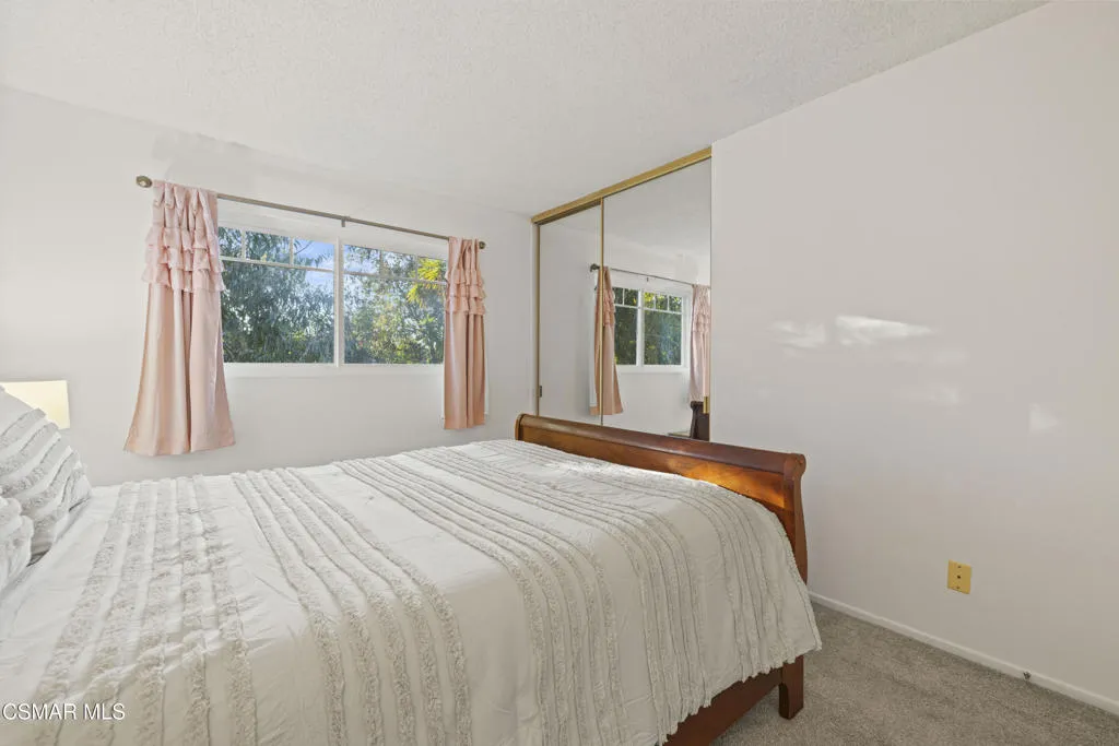 Your white picket fence dream home awaits! Enjoy 4 Bedrooms, 2.5 Baths with nearly 2100 square feet of living space all in a serene location on a quiet cul de sac. This floorplan boasts so much natural light with a spacious formal living room featuring vaulted ceiling and fireplace, a formal dining room, plus an eat in kitchen-great room with den. Wonderful recent updates (approximately 2022) have been done including new roof, new HVAC system (AC, Furnace and Ducting), new interlocking pavers in front and back and brand new french sliding doors. Additional upgrades include wood-like laminate flooring throughout the downstairs and dual paned windows. The Primary Suite boasts laminate flooring, a walk in closet, dual sink vanity and spacious shower. The 4th bedroom features a princess balcony open to the living room below. Both the front and back yards of this beautiful home are enchanting. The back yard has a lovely covered patio, lush trees and greenery including a grassy space, vegetable garden and bonus space ready for your imagination. This property has a VA loan that is assumable to VA approved Buyers at 2.5%. Enjoy award winning Conejo Valley USD schools and close proximity to the library, highway 101, dining, shopping, parks and hiking.