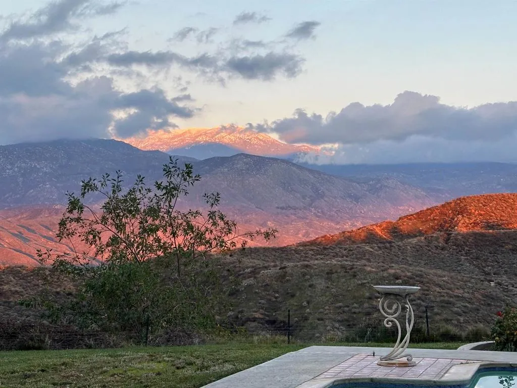 21 acres behind the house also for sale. Offered for the first time ever, this one-of-a-kind custom home captures sweeping, unobstructed mountain and valley views from its privately situated hillside setting. The approach alone is unforgettable—you drive through beautiful orange groves, a true nod to classic California living, before arriving at this serene and private retreat. Enjoy breathtaking panoramas of the San Jacinto Mountains, San Bernardino Mountains, and the San Gabriel and Santa Susana ranges—along with rolling hills, orchards, and the natural beauty of the valley floor below. The orientation of the home provides spectacular sunrises and glowing sunsets, creating an ever-changing landscape of color and light. Lovingly cared for by its original owner, the home has been meticulously maintained and thoughtfully designed with both comfort and functionality in mind. Abundant storage, new carpet, and a beautifully flowing layout make it instantly inviting. At the center of the home, a dramatic atrium floods the interior with natural light and creates a seamless connection between the living spaces. A striking formal living room showcases exposed wood-beam ceilings, a wall of arched windows, warm natural light, and a built-in wet bar with sink—perfect for entertaining. The formal dining room captures incredible mountain views, elevating every meal. The spacious kitchen features a large center island, warm wood cabinetry, generous storage, walk in pantry, desk area, abundant light, and a cheery breakfast nook ideal for morning coffee or casual meals while enjoying the views. The large family room, anchored by a cozy fireplace, offers an inviting space to unwind, while a charming library provides a quiet retreat for reading, work, or reflection. Each room feels distinct yet cohesive, balancing openness with intimacy. Step outside to your own private oasis. The sparkling pool and expansive patio overlook some of the most dramatic scenery in the region—mountains, orchards, and untouched natural landscapes that shift beautifully with the seasons. Beyond the patio, a spacious grassy area offers even more possibilities—perfect for yard games, outdoor gatherings, or as an ideal location to add an ADU. For garden lovers, the property is a dream, featuring dedicated potting areas and an abundant collection of mature fruit trees including Meyer lemon, Navel orange, Valencia orange, and Eureka lemon—bringing color, fragrance, and fresh citrus year-round. Adding even more versatility is a bonus space located downstairs in the garage area, complete with a large room with closet, a convenient half bath, an office or workspace, and additional storage rooms. Ideal for a home office, gym, hobby studio, or guest overflow, this flexible space expands how the home can live and function. With its custom design, thoughtful functionality, meticulous care, exceptional outdoor spaces, and extraordinary sweeping views—this cherished property presents a rare opportunity to own a truly special home making its market debut.