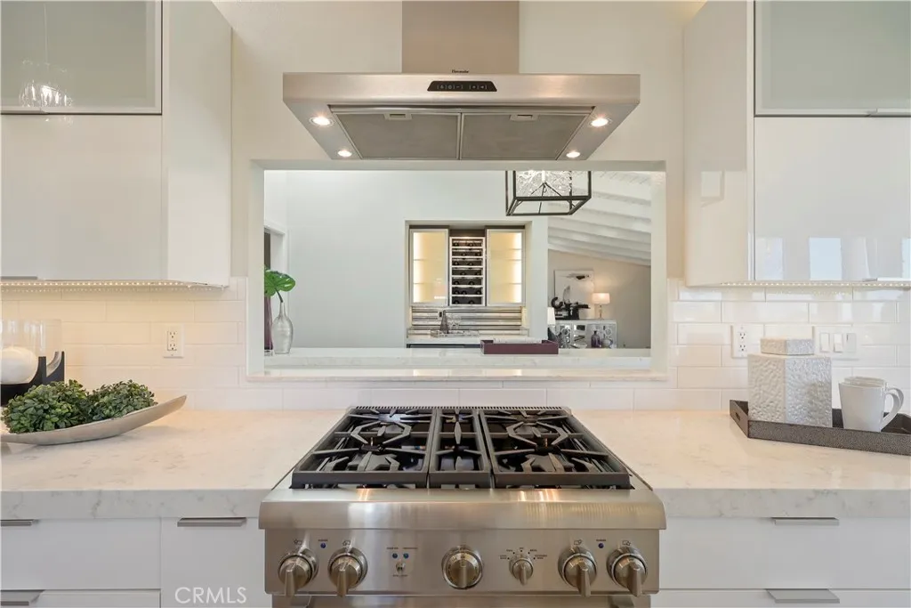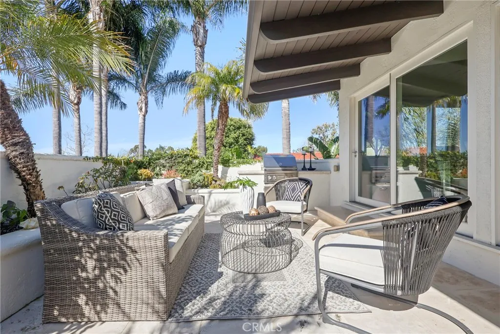 It has just been totally remodeled with top-of-the-line counters tops and cabinets, beautiful living room and dining area which are full of light, upgraded kitchen with Thermador appliances, a bar with a drinks fridge and wine rack, one-piece Italian marble fireplace, skylights throughout the house, upgraded bathrooms/showers and wide-open patio with panoramic sunset views. This is one of the best rear patios in the Bluffs which opens to a beautiful green area as a private extension of the home. Enjoy the built-in Lynx BBQ as well.