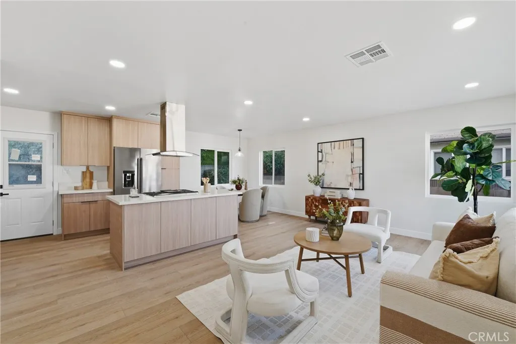 Bright and inviting, the open-concept layout seamlessly connects the living, dining, and kitchen areas, creating a welcoming environment ideal for everyday living and entertaining. The fully reimagined kitchen showcases European-style cabinetry, quartz countertops, Samsung appliances, and a functional layout designed for both style and practicality.
