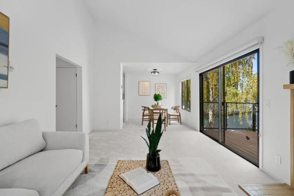 NEW PRICE! This fabulous 2-bedroom, 2-bathroom condominium is located in the heart of Mountain View. Situated on the upper level, this end unit is part of The Waters complex and offers stunning views of the water from the beautiful waterfront balcony, perfect for relaxation under the shade of large, mature trees. The open floor plan is bright and airy, featuring a living room with a vaulted ceiling and cozy fireplace. The master bedroom has an ensuite bathroom, while the large guest room includes a spacious walk-in closet with a mirrored door. The unit also boasts in-unit laundry with a new washer and dryer, and dual pane windows. Recently, the interior has been repainted, and a new carpet.. Additional amenities include a detached one-car garage and an extra parking permit. The complex itself offers a swimming pool, hot tub, tennis courts, and a community garden. Conveniently located near Cal Train, restaurants, shops, and parks, with easy access to highways 101 and 85, this condominium is just a short stroll to Google, Shoreline Amphitheatre, and downtown Mountain View's array of amenities. This is A+. Don't Miss.