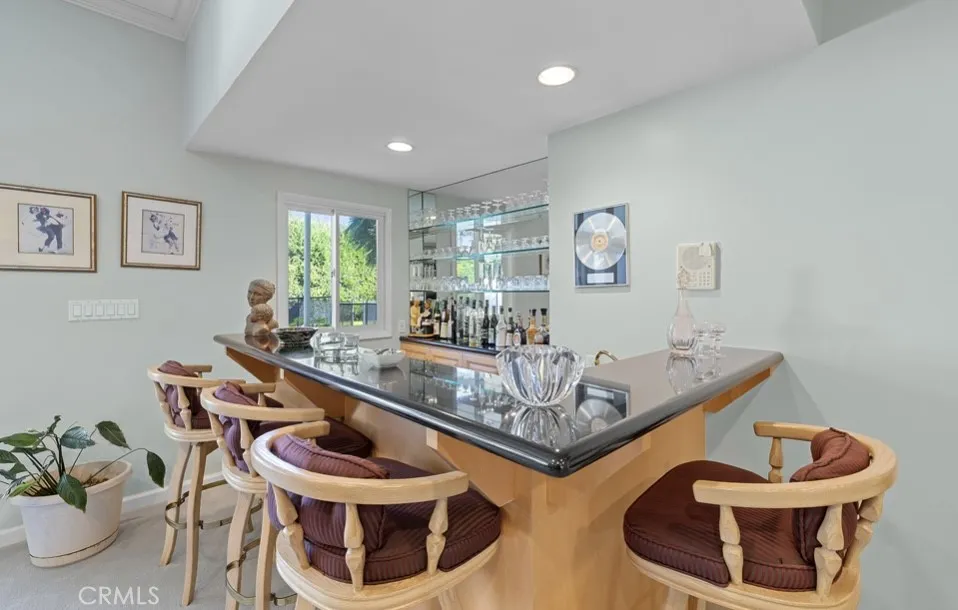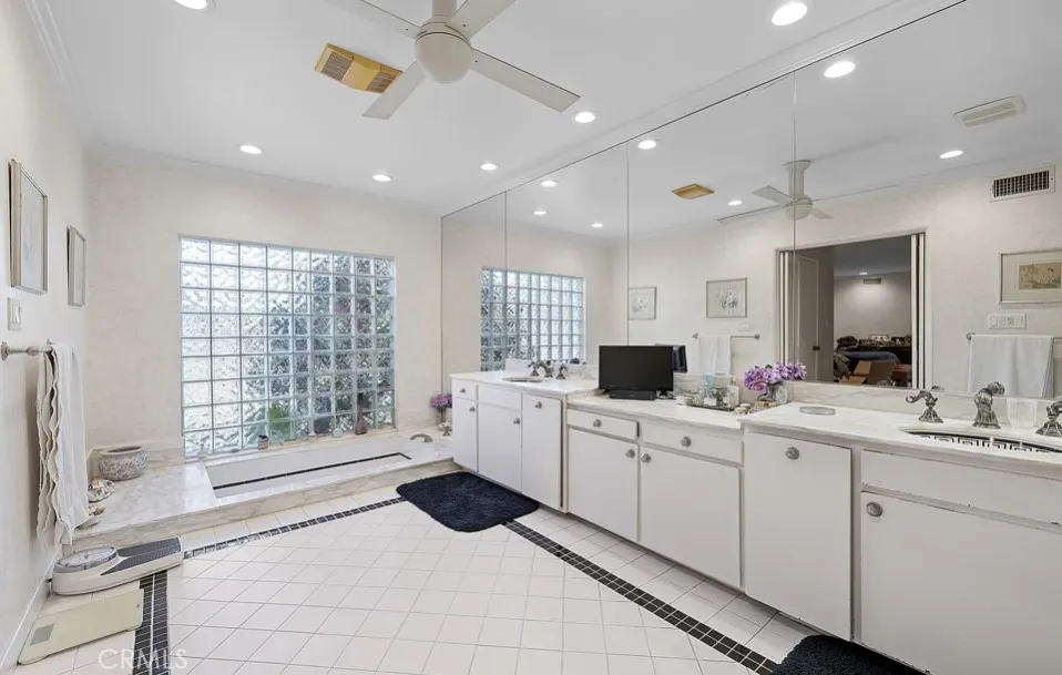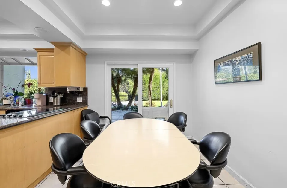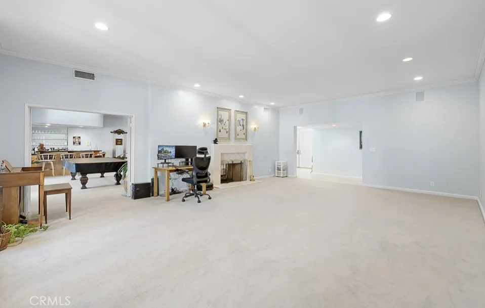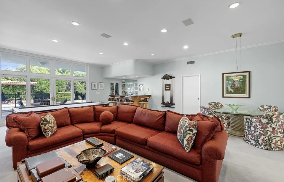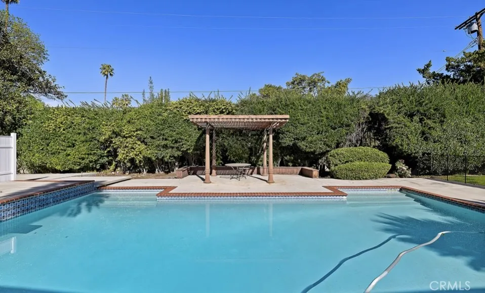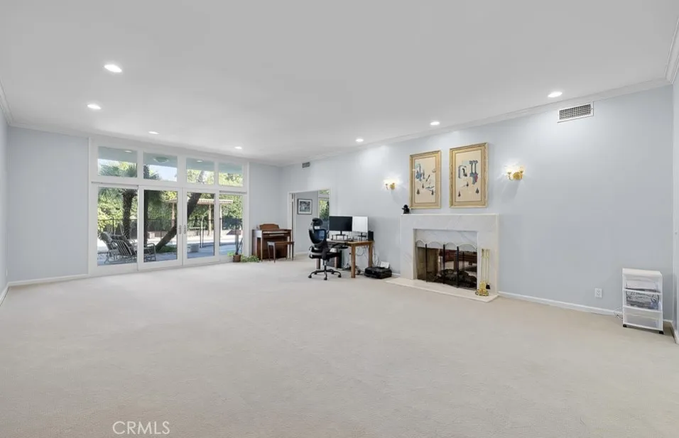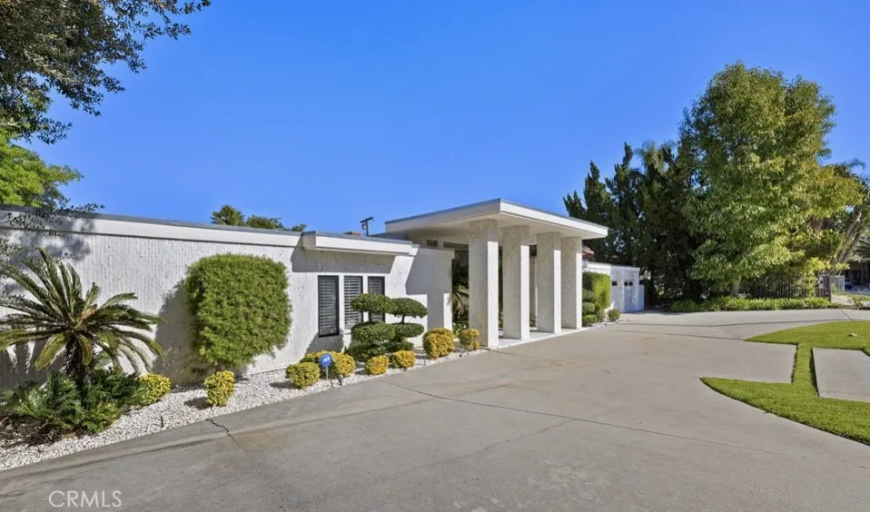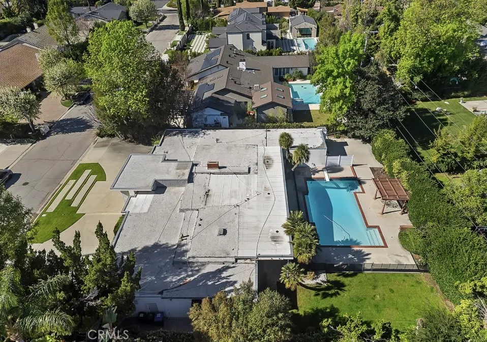 This single-story midcentury modern residence offers approximately 4,400 square feet of living space on an expansive .38-acre cul-de-sac lot, ideally located south of Ventura Boulevard in Woodland Hills. The functional floor plan includes five bedrooms and five bathrooms, spacious living and family rooms with fireplaces, and a formal dining room suitable for entertaining. The kitchen features custom cabinetry, built in refrigerator, a walk-in pantry, tile flooring, and a breakfast area with direct access to the family room. The backyard offers a pool, grassy area, basketball half court, and a large, covered patio, providing multiple options for outdoor use. Additional features include a primary suite with fireplace, sitting area, and dual walk-in closets, a laundry room with sink and cabinetry, recessed lighting, copper plumbing, and a three-car attached garage. Conveniently located near shopping, dining, and local amenities, this property provides the benefit of single-level living on a generous lot.