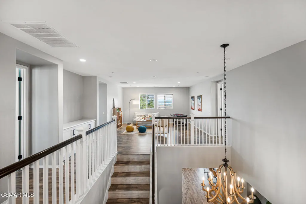 An exceptional opportunity within the gated Meridians of Moorpark. Built in 2017, this impressive cul-de-sac residence offers five bedrooms, five bathrooms, and nearly 3,800 square feet of open, thoughtfully designed living space. The home feels expansive yet inviting, with wood-like flooring, recessed lighting throughout, and generously sized rooms that flow effortlessly from one to the next.The designer kitchen serves as the heart of the home, showcasing a large center island with breakfast bar and pendant lighting, custom tile accents, quartz countertops, bright white cabinetry, and stainless steel appliances. A pot filler at the range adds both convenience and style, while the casual dining area creates an ideal setting for everyday living or intimate gatherings.A grand staircase leads upstairs to a versatile loft and well-appointed bedrooms, many enjoying scenic views of the surrounding hills. The primary suite offers a peaceful retreat, complete with dual sinks, tile flooring, a separate shower, and a sunken soaking tub designed for true relaxation.The backyard is designed for effortless entertaining and quiet moments alike, featuring a spacious paver patio, built-in fire pit with bench seating, custom decking, and a covered patio, all set against sweeping panoramic mountain and hillside views. Located within a secure gated community, this newer home combines space, comfort, and elevated design--creating a setting that feels as impressive as it is easy to enjoy.
