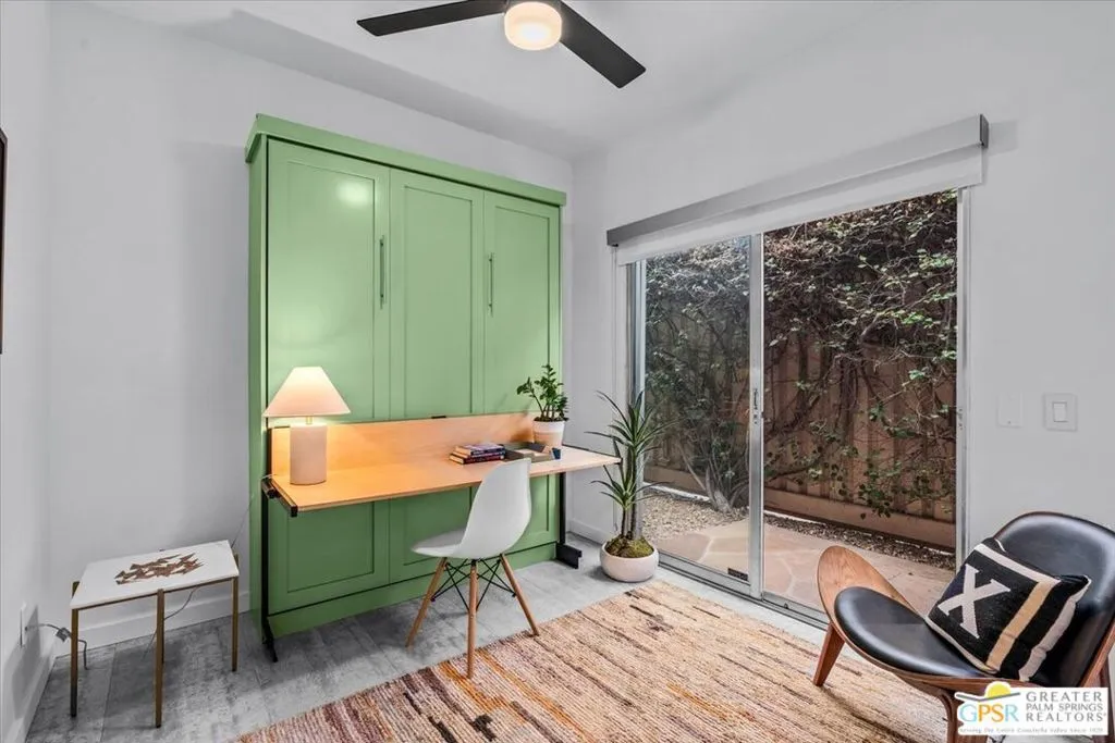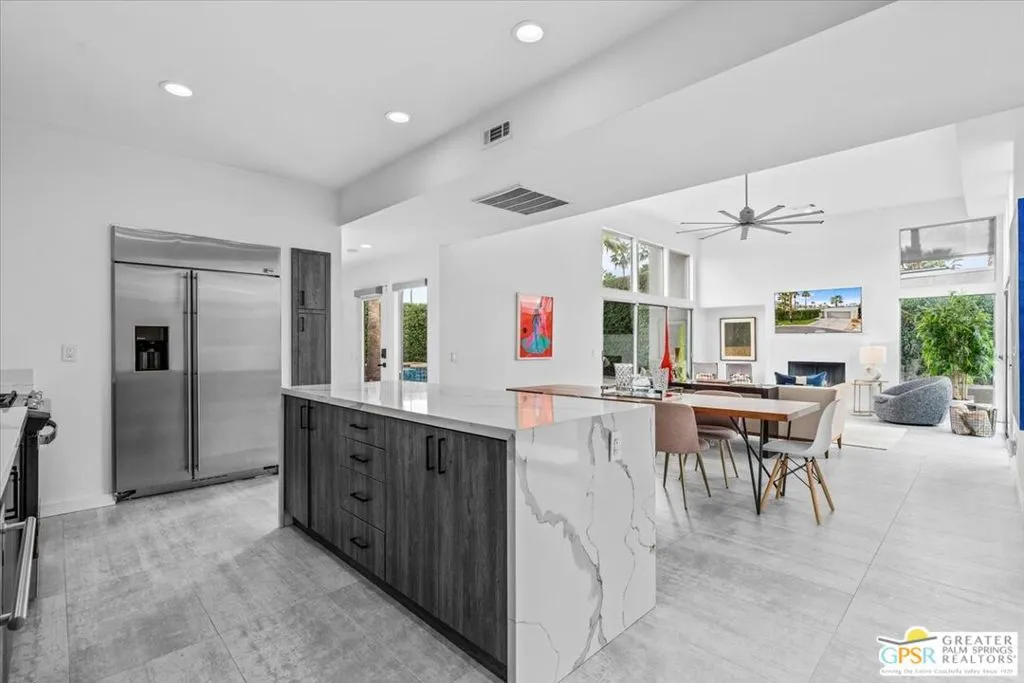 Set behind gates on a quiet cul-de-sac, the coveted Dunes Court enclave is home to just twelve residences, offering an uncommon sense of privacy and ease. Within this intimate setting, 641 Dunes Court presents a thoughtfully reimagined modern retreat, positioned to capture sweeping south and west mountain views while embracing refined desert living. Clean architectural lines and curated finishes create interiors that feel polished yet comfortable. The great room is defined by soaring 14-foot ceilings and expansive walls of glass that open seamlessly to the pool and private backyard, establishing a natural connection between indoor and outdoor spaces. Designed for both entertaining and everyday living, the open kitchen is appointed with high-end appliances, custom cabinetry, and finishes that extend gracefully into the dining and living areas. The primary suite serves as a private sanctuary, complete with a spa-inspired bath, mountain-view shower, generous walk-in closet, and direct access to a secluded outdoor retreat. A south-facing guest bedroom is filled with natural light, offers a substantial walk-in closet, and opens directly to the pool. A third flexible room easily functions as a bedroom, den, or home office.Outdoor living is elevated with multiple gathering areas, complete privacy, and an outdoor shower. The pool decking was redone in 2025, and the pool was resurfaced with PebbleTec in 2025, complemented by a new pool pump for enhanced efficiency. A water softener and a leased solar system with 37 panels further support a more energy-conscious Palm Springs lifestyle.Ideally located in South Palm Springs, Dunes Court provides peaceful seclusion while remaining just moments from downtown dining, shopping, and entertainment. A quintessential Palm Springs residence offering location, comfort, and understated luxury within an exclusive gated setting.