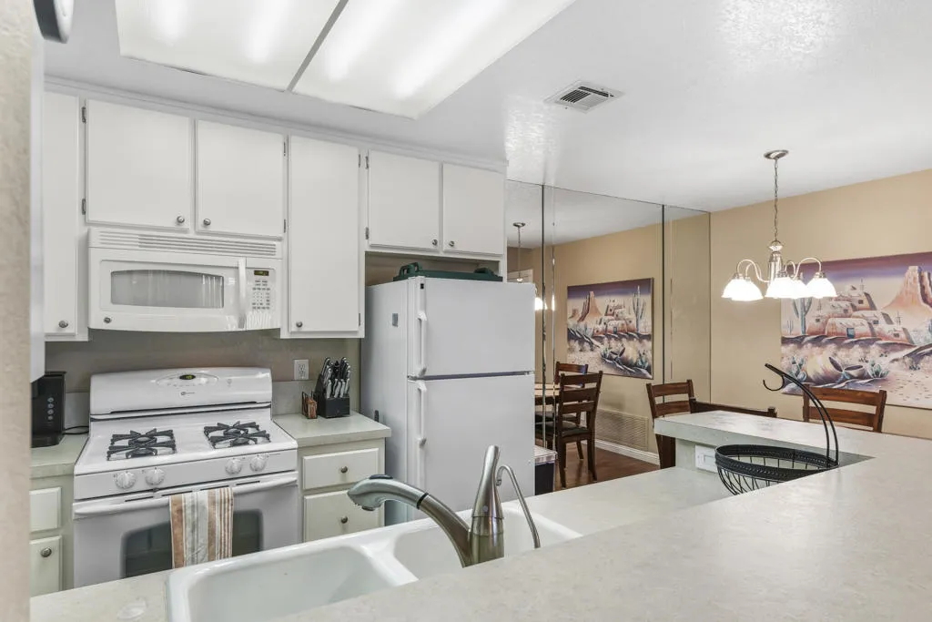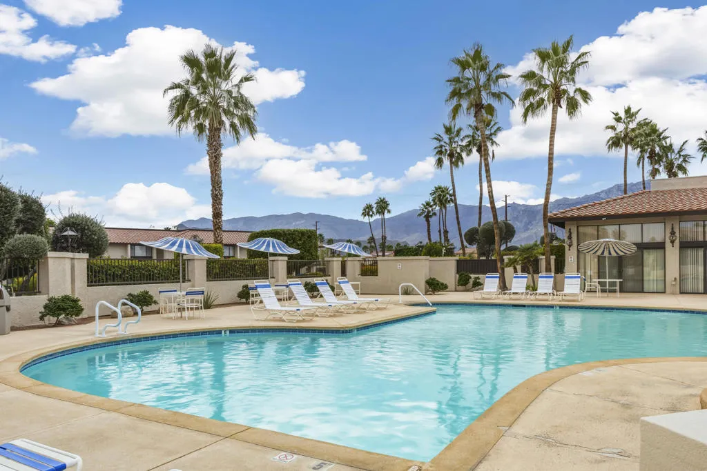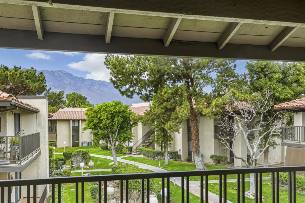You are going to Fall In Love with this beautifully updated 2 bedroom 2 bath home with vaulted ceilings. Enjoy gorgeous mountain & greenbelt views from your private upstairs balcony. This home has been extremely well maintained and has tastefully updated features including laminate flooring, updated kitchen countertops and a custom tiled shower enclosure in the primary bathroom. This home is offered turnkey furnished. Cathedral Springs is a gated community conveniently located less than 10 minutes from Downtown Palm Springs. Amenities include a fitness center as well as multiple pools and spas. Affordable Luxury Lifestyle Living!