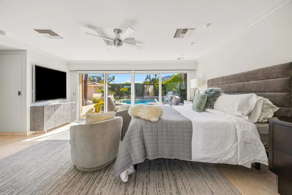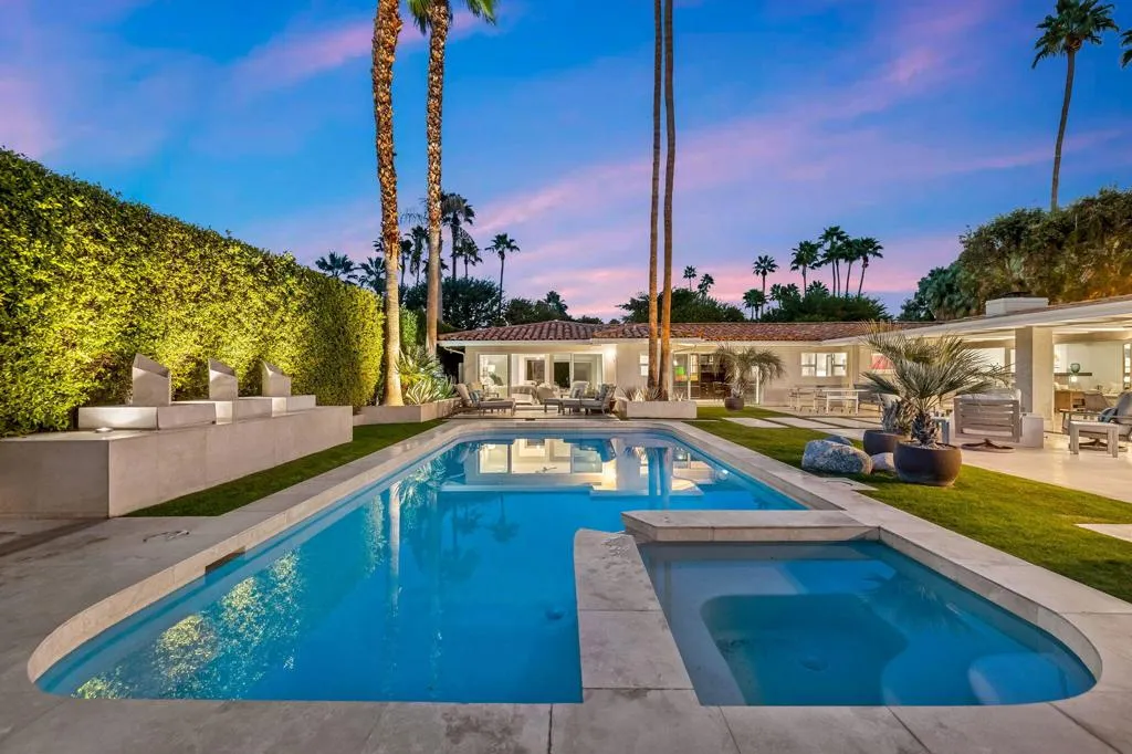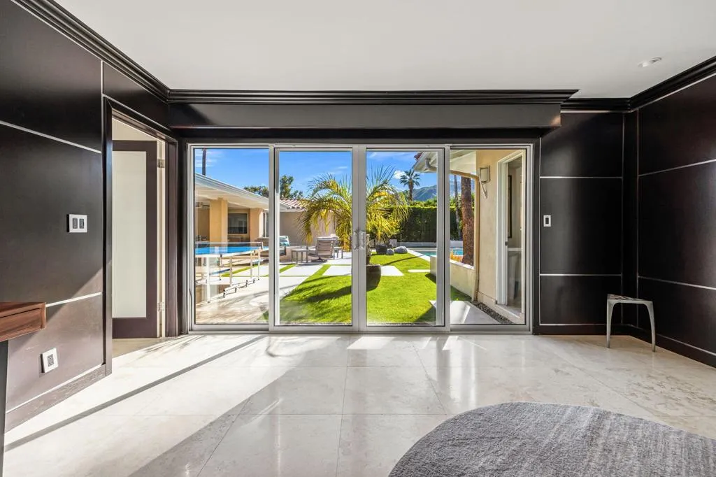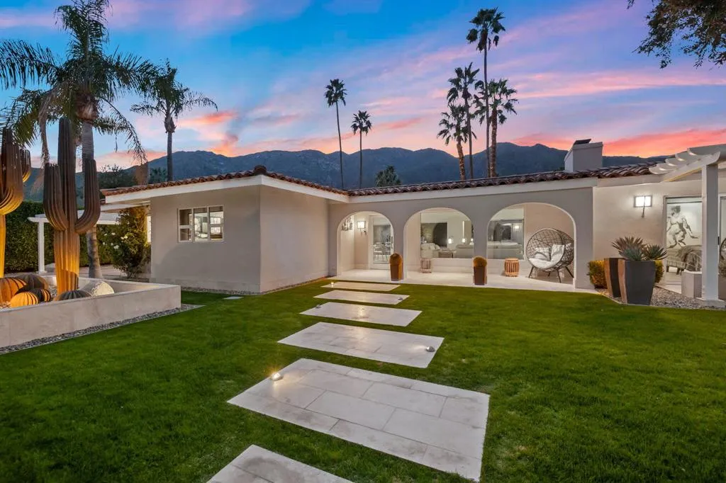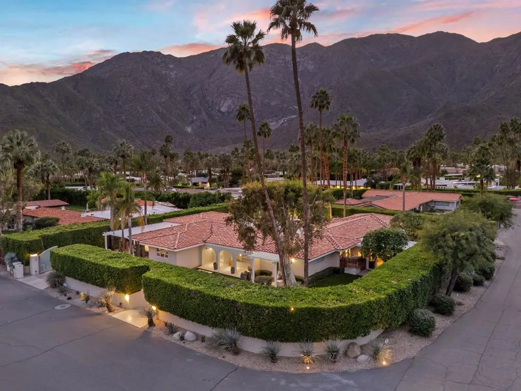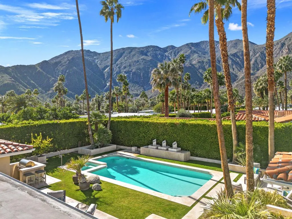 Set behind private gates on a coveted corner lot in Old Las Palmas, 1255 Camino Mirasol is a rare contemporary estate once owned by Claudette Colbert, offering sweeping mountain views and exceptional privacy. Thoughtfully remodeled, the home blends refined design with effortless indoor outdoor living, featuring travertine flooring throughout the interior and exterior and expansive windows and doors that fill the home with natural light. The residence includes four ensuite bedrooms and four and a half baths, highlighted by a serene primary suite with an attached office or library, a spacious walk in closet, and a well appointed bath featuring an outdoor shower and tranquil water feature. A guest bedroom with an attached gym offers dramatic walls of glass and an open outdoor inspired feel, paired with a complete spa bath featuring a steam shower, deep soaking tub, and waterfall shower creating a true private retreat. A dedicated media and theater room is complemented by Bang and Olufsen surround sound throughout the home, delivering an immersive entertainment experience both indoors and out. The kitchen is designed for both serious cooking and entertaining, featuring brand new cabinetry, stainless steel countertops, and a generously sized butler pantry that functions as a full prep kitchen ideal for catering with matching stainless counters, ice machine, wine refrigerator, and built in beer keg. A temperature controlled wine fridge is also located in the finished garage, which includes epoxy flooring, a Tesla car charger, and a dedicated mini split air conditioning system. Outdoor spaces are framed by a lush ficus hedge and sweeping mountain views, creating a private setting ideal for relaxation and entertaining with an outdoor television, firepit, Fire Magic grill, multiple seating areas, soothing water features, and mature citrus trees producing lemon, lime, pink grapefruit, and white grapefruit. This is a sophisticated and private desert retreat offering historic provenance, modern luxury, and exceptional attention to detail.