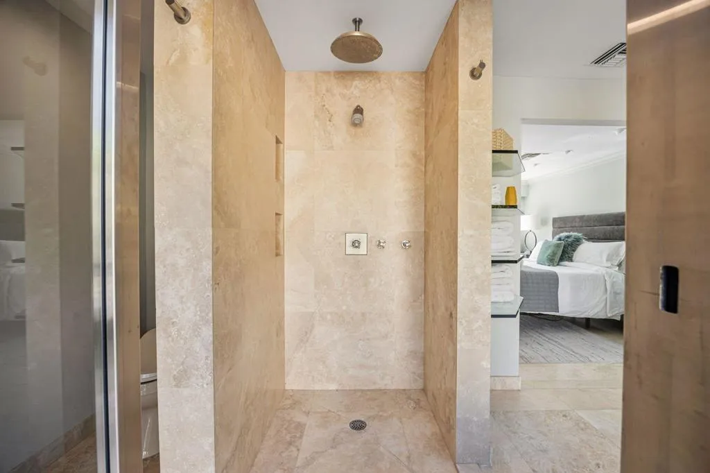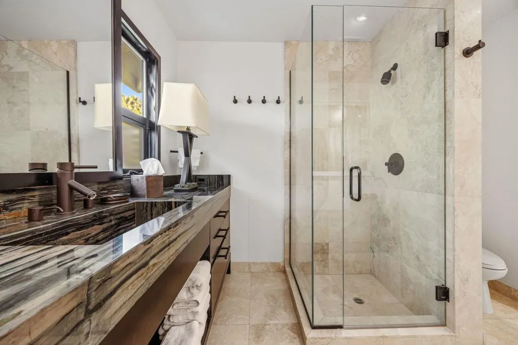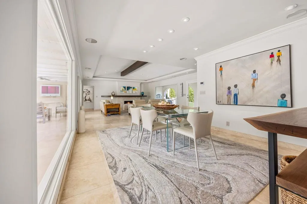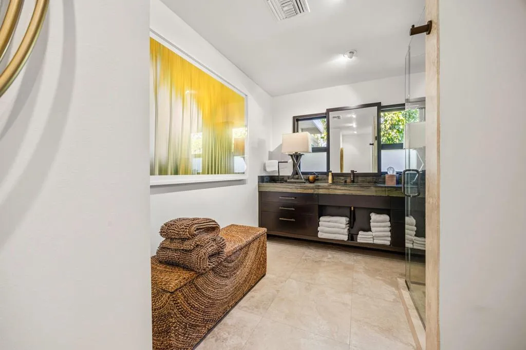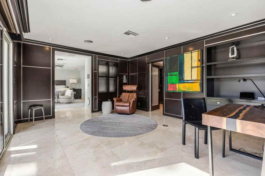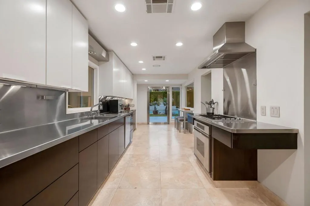 Set behind private gates on a coveted corner lot in Old Las Palmas, 1255 Camino Mirasol is a rare contemporary estate once owned by Claudette Colbert, offering sweeping mountain views and exceptional privacy. Thoughtfully remodeled, the home blends refined design with effortless indoor outdoor living, featuring travertine flooring throughout the interior and exterior and expansive windows and doors that fill the home with natural light. The residence includes four ensuite bedrooms and four and a half baths, highlighted by a serene primary suite with an attached office or library, a spacious walk in closet, and a well appointed bath featuring an outdoor shower and tranquil water feature. A guest bedroom with an attached gym offers dramatic walls of glass and an open outdoor inspired feel, paired with a complete spa bath featuring a steam shower, deep soaking tub, and waterfall shower creating a true private retreat. A dedicated media and theater room is complemented by Bang and Olufsen surround sound throughout the home, delivering an immersive entertainment experience both indoors and out. The kitchen is designed for both serious cooking and entertaining, featuring brand new cabinetry, stainless steel countertops, and a generously sized butler pantry that functions as a full prep kitchen ideal for catering with matching stainless counters, ice machine, wine refrigerator, and built in beer keg. A temperature controlled wine fridge is also located in the finished garage, which includes epoxy flooring, a Tesla car charger, and a dedicated mini split air conditioning system. Outdoor spaces are framed by a lush ficus hedge and sweeping mountain views, creating a private setting ideal for relaxation and entertaining with an outdoor television, firepit, Fire Magic grill, multiple seating areas, soothing water features, and mature citrus trees producing lemon, lime, pink grapefruit, and white grapefruit. This is a sophisticated and private desert retreat offering historic provenance, modern luxury, and exceptional attention to detail.