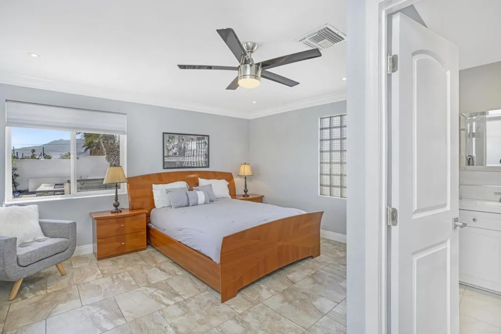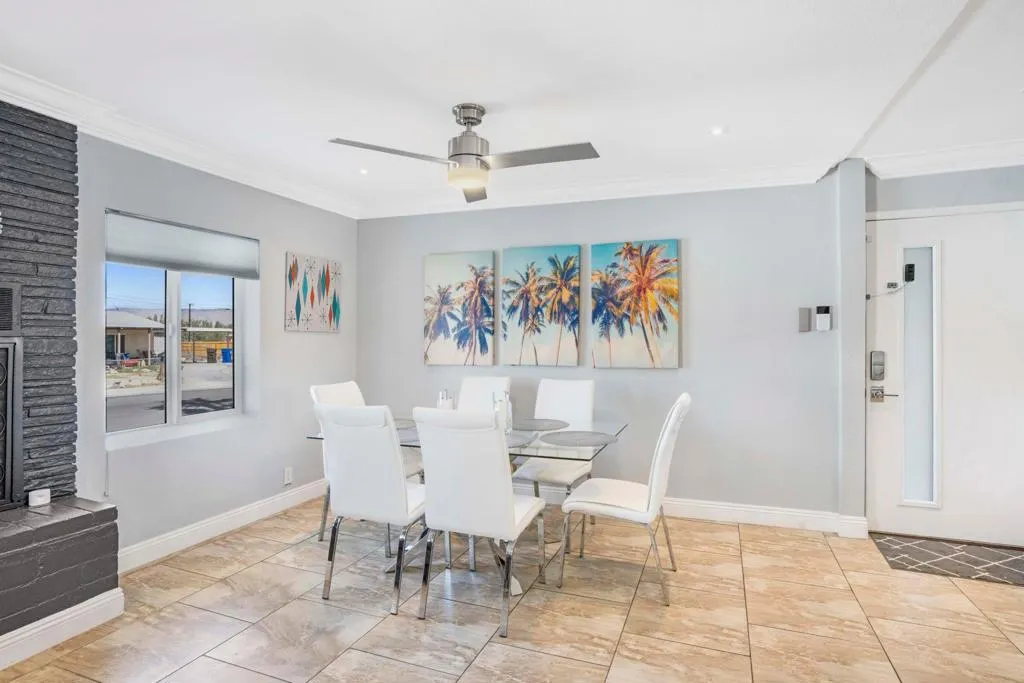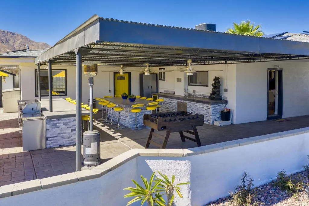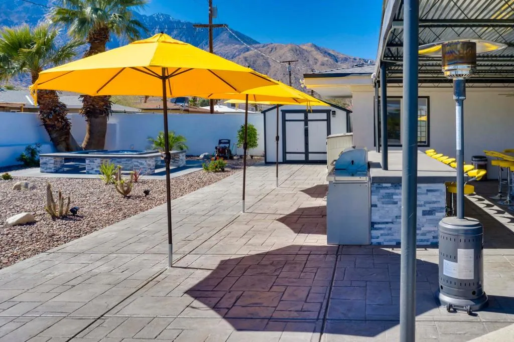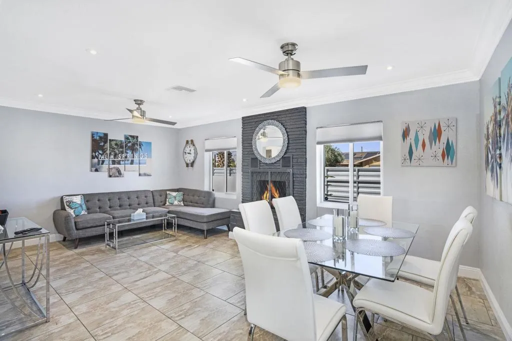 REDUCED $46,000! Welcome to desert living in this exquisitely reimagined Mid Century modern residence, where timeless Palm Springs architecture meets sophisticated contemporary design. Ideally situated just moments from the vibrant dining, boutique shopping, and world class entertainment of downtown, this three bedroom, two bath retreat offers 1,309 square feet of beautifully curated interiors on an expansive 9,583 square foot lot. Crafted for both serene relaxation and effortless entertaining, the home's open concept layout flows seamlessly into a private outdoor oasis. A resort caliber saltwater pool and spa custom designed and built by Tessera anchor the breathtaking backyard, framed by sweeping mountain views. Evenings are elevated around the impressive oversized fire feature, while the outdoor kitchen, with abundant counter space and seating for more than 20 guests, creates the perfect setting for unforgettable gatherings under the desert sky. Every detail has been thoughtfully refined, including a newer roof, energy efficient solar system, tankless water heater, and premium appliances. Offered turnkey fully furnished, this residence reflects a harmonious blend of comfort and sophistication, ready to enjoy from the moment you arrive. Whether envisioned as a lucrative short-term rental opportunity or an exceptional personal getaway, this home captures the very essence of the Palm Springs lifestyle luxurious, effortless, and endlessly inviting.