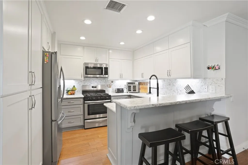 UPLAND KNOLLS ONE STORY PATIO HOME. Perfect END UNIT locale in the interior section of community and adjacent to greenbelt. This totally renovated 1 level PUD has 3 bedrooms (3rd bedroom currently used as Den without closet and bedroom doors) and 2 remodeled bathrooms. Living room, Dining Room and gorgeous Kitchen with newer appliances all open into each other. Separate indoor laundry room. Attached 2-car garage. Picturesque views to private patio and park-like grounds. Convenient to pool, spa and club house area. Convenient distance to coveted retail stores, shops, and a variety of restaurants. Propertys Owner covers HOA & Water!