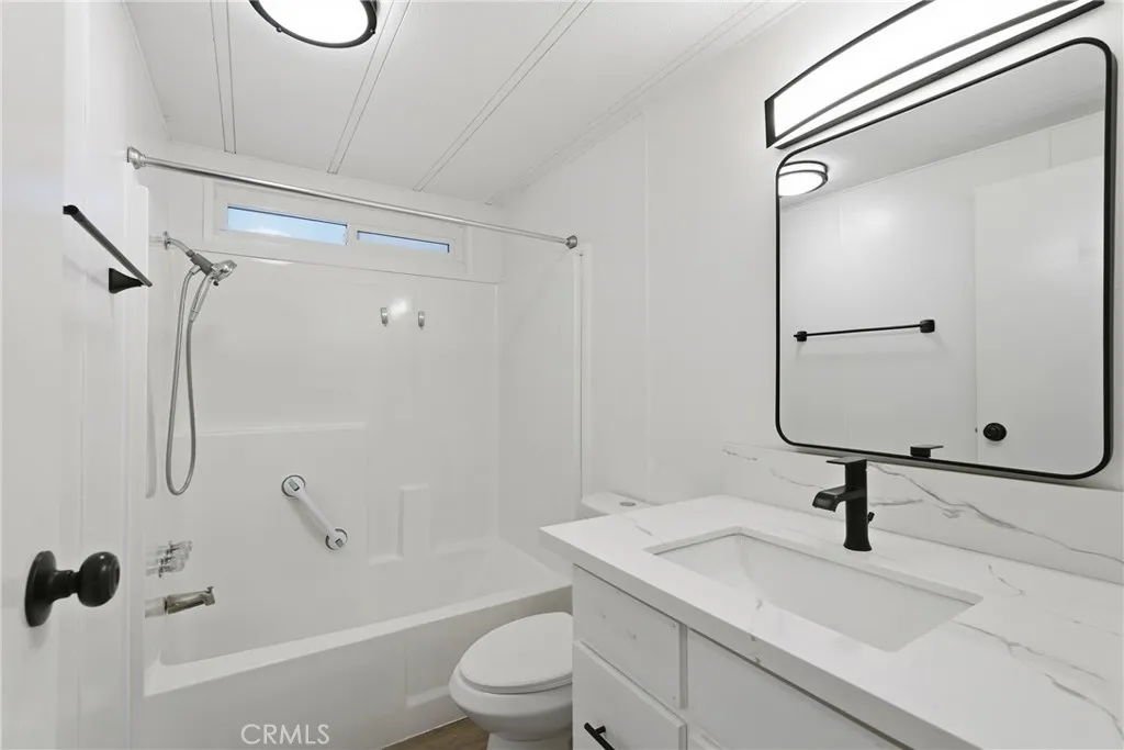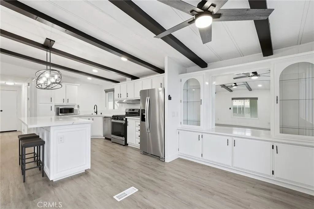 Welcome to your new home in the well-loved Rancho Ontario 55+ community, where comfort, style, and affordability meet low-stress living. This beautifully remodeled home checks all the boxes with nearly brand-new appliances including the refrigerator and microwave, gorgeous ceiling beams, newer flooring, and an open kitchen/great room. The primary bedroom ensuite features a walk-in tub, separate stand-up shower, and great closet space, with large closets in both bedrooms. You’ll appreciate the spacious laundry room with plenty of storage, that can double as an office and even fit an extra refrigerator! Walk up to a private enclosed front patio, fresh new landscaping, and tinted front panoramic view windows for added comfort and privacy. A brand-new roof, 55 inch smart tv, and portable fireplace tv stand are included. Just one home down from the newly renovated clubhouse brings the fun with a fitness center, year-round pool, billiards room, banquet hall, pickleball, bocce ball, and a dog park.. because retirement should be anything but boring. Conveniently located less than a mile from Kaiser Ontario. A fantastic opportunity at a very affordable price. Park qualification required.