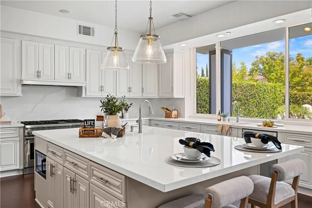 Tucked away at the end of a private cul-de-sac, this French Chateau inspired trophy estate offers timeless elegance, grand scale, and a rare detached ADU guest house. A dramatic double height foyer sets the tone, highlighted by a sweeping wraparound staircase and striking custom chandelier. The formal living room impresses with soaring ceilings, a statement fireplace, and towering bay windows that fill the space with natural light. Designed for both everyday living and entertaining, the chefs kitchen features custom cabinetry, a generous center island, high end stainless steel appliances, and an expansive walk in pantry. The kitchen opens seamlessly to the family room with fireplace and French doors, creating exceptional indoor outdoor flow. All five bedrooms are oversized, each offering ensuite bathrooms and walk in closets. The romantic primary suite is a true retreat, complete with a private foyer, sitting room, dual walk in closets, a spa inspired bath with custom shower and soaking tub, and a private balcony. The entertainers backyard provides a resort style setting with pool, spa, covered patio, and low maintenance turf, ideal for gatherings or quiet relaxation. The detached guest house includes a spacious living area, full kitchen and bath, and a large bedroom, perfect for guests, multigenerational living, or additional income potential. An extraordinary custom estate that blends sophistication, comfort, and versatility. This is a must see home.