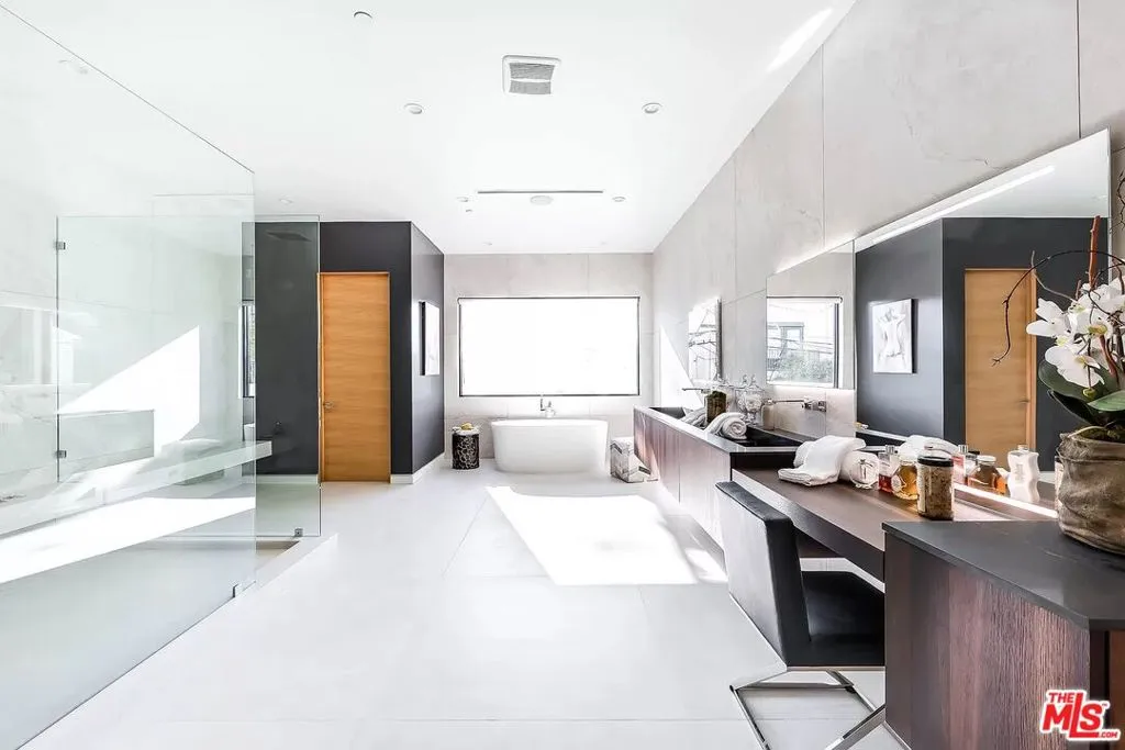 Perfectly located in the heart of West Hollywood, fall in love with this custom designed four bed, four and one-half bath, newer build Contemporary home. Expansive open floor plan with European oak wood floors, high ceilings, and luxurious finishes throughout. The spacious entry hall, highlighted by a floating staircase, is bordered by an elegant formal dining room on one side and a beautiful enclosed outdoor patio on the other. The Italian-designed kitchen features quartz countertops, a center island with an integrated breakfast table, and top-of-the-line Miele appliances. The family room, with its stunning fireplace and expansive pocket sliding glass doors, seamlessly connect to an impressive backyard, perfect for indoor/outdoor entertaining. The main floor also offers a downstairs en-suite and a media room. Upstairs, the primary bedroom features a fireplace, balcony with views of the pool, and walk-in closet. The opulent primary bathroom includes a dual vanity, soaking tub, and rain shower. Two additional suites well-appointed for a guest-room or home office, each with its own private balcony. Backyard features an enclosed cabana, pool, and zero-edge spa. With a state-of-the-art security, cameras and surround sound system, the home is operated by a Control4 system personalized to your lifestyle providing unparalleled convenience. Enjoy a 2-car garage, close proximity to Melrose Place, fine dining and shopping, and West Hollywood living at its finest.