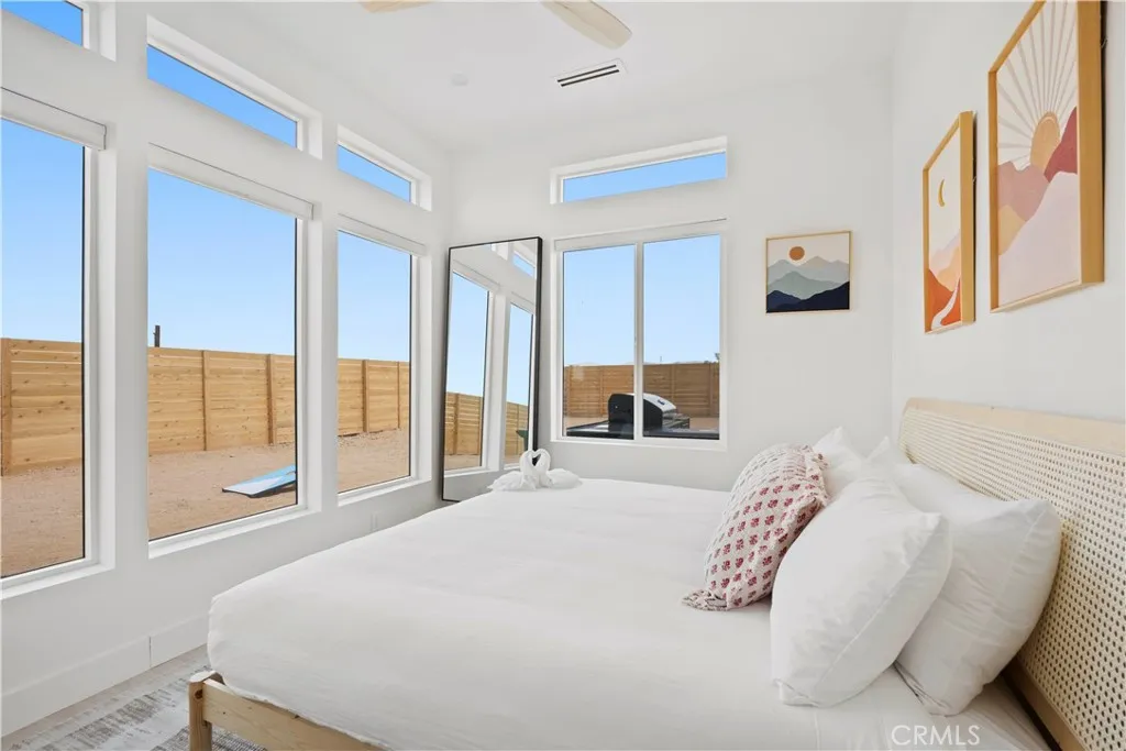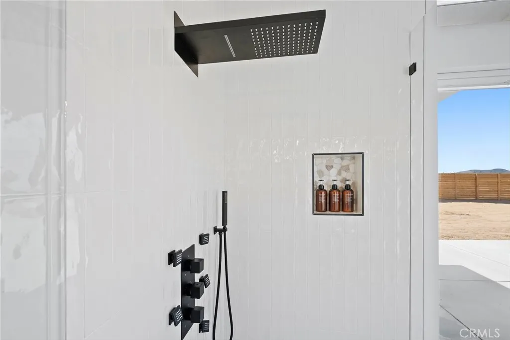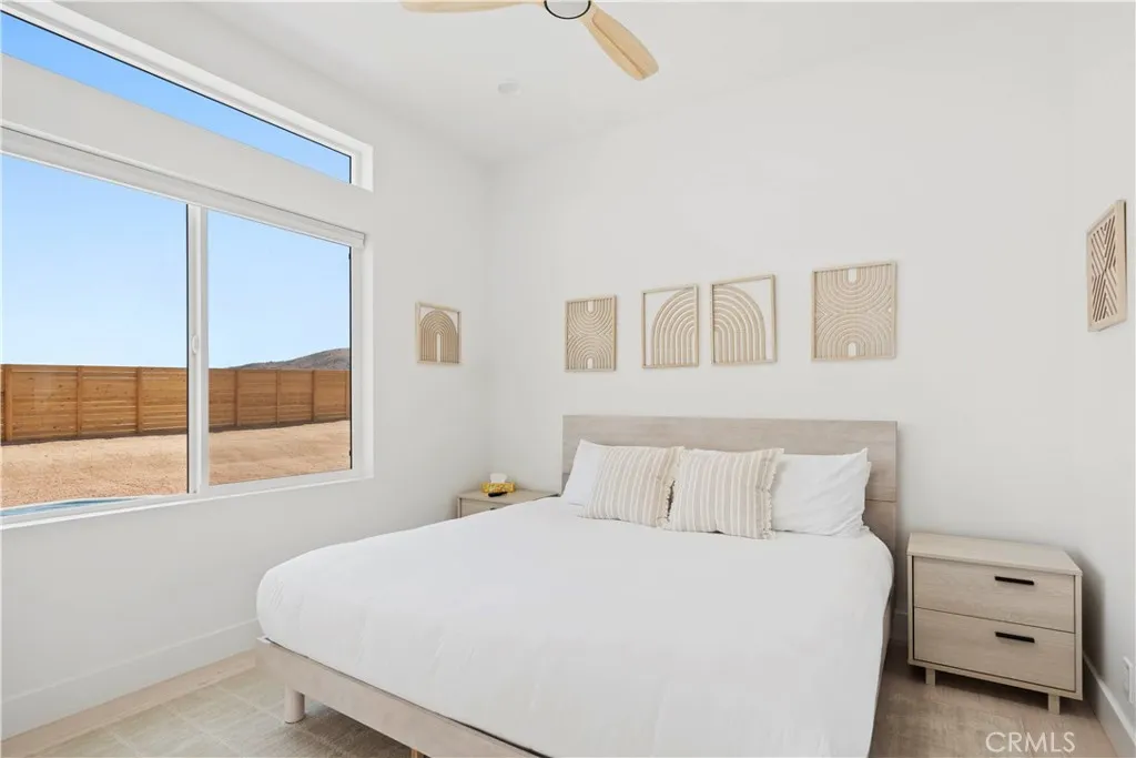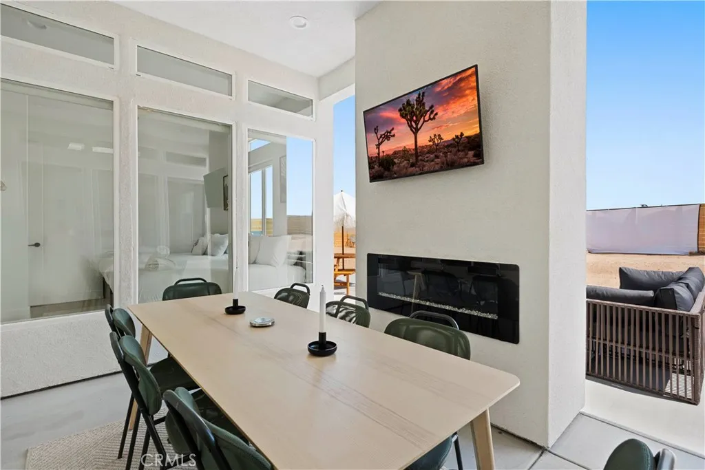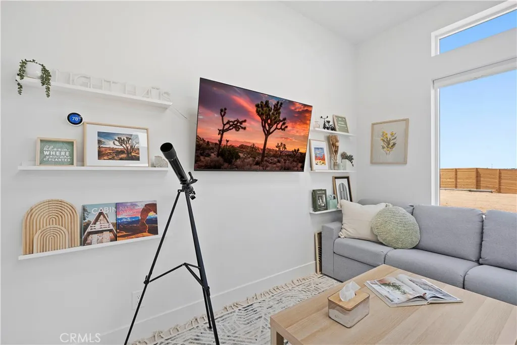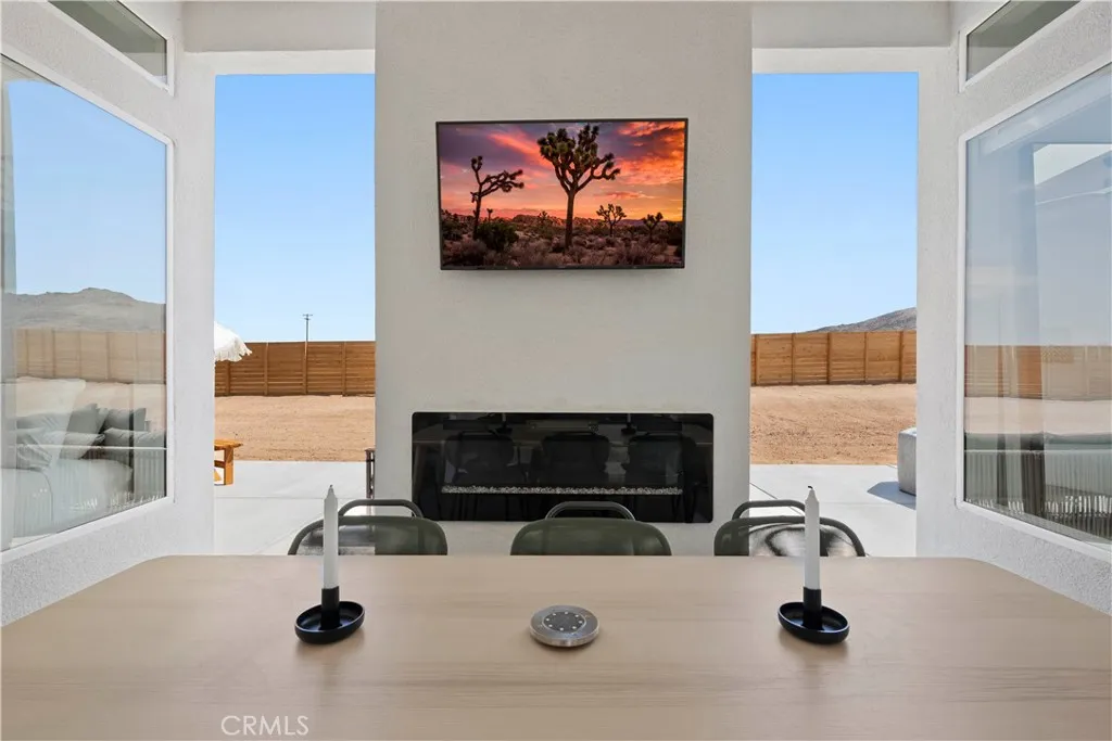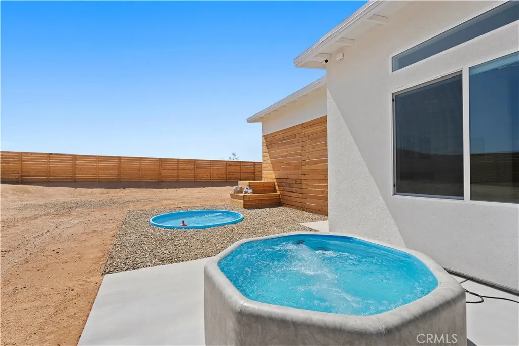 Architect-designed contemporary residence built in 2024, with custom detail throughout. The home features 10-foot ceilings, expansive windows, skylights, and an open floor plan. Interior living space totals 1,043 sq ft, complemented by a California room offering over 110 sq ft of indoor/outdoor dining and living space with an electric fireplace. Set on 2.5 acres, the property provides a rare sense of openness, with approximately one-third enclosed by 6-foot-high fencing for privacy. An automatic gate opens to a concrete driveway leading to an attached carport. Interior finishes include recessed lighting, linear air distribution, and a custom entertainment wall with floating shelving. The kitchen is designed for both function and aesthetics, featuring new stainless steel appliances, a 12-foot peninsula with breakfast bar seating, custom cabinetry extending to the ceiling, open shelving, a vent hood, and tiled accent walls. The home offers generously sized bathrooms with a modern aesthetic, including tile extending to the ceiling and 8-foot glass shower enclosures. The primary suite includes a large private bath with a round soaking tub, glass-enclosed shower with black wall-mounted shower fixtures, ceiling-height tile, and a dual-basin vanity. Bedrooms feature large windows with privacy shades. Additional amenities include a photovoltaic solar system with 15 panels and a Tesla battery capable of powering the home during electrical outages. Exterior features include a concrete patio, an in-ground stock tank pool with a full filtration system discreetly housed beneath a custom wooden bench, and an outdoor rain-style shower. Located in the Hidden River neighborhood, known for architecturally distinctive homes, with convenient access to restaurants, cafés, the farmers market, and Joshua Tree National Park. Property is partially occupied. Please do not disturb occupants.