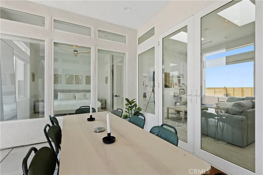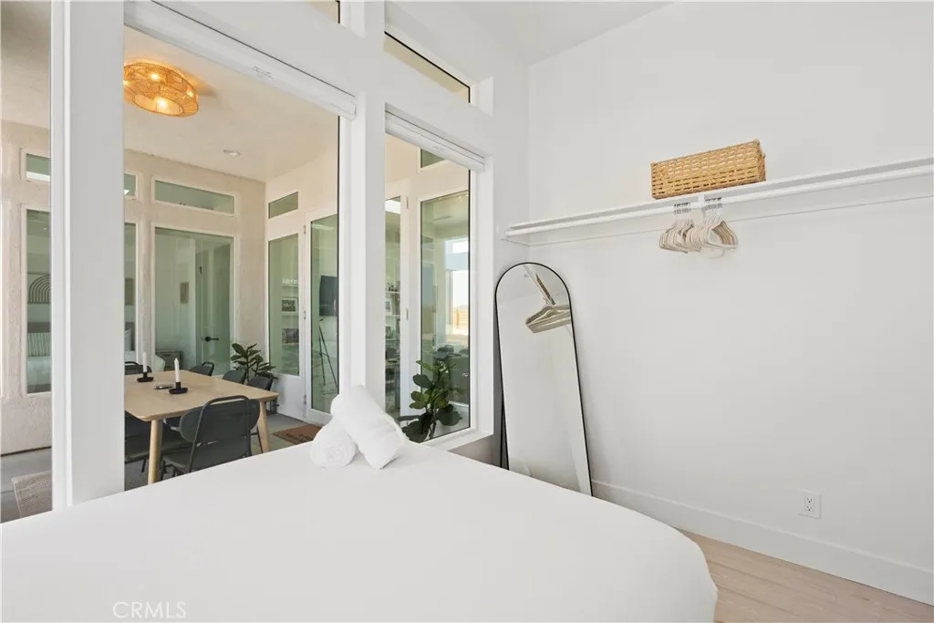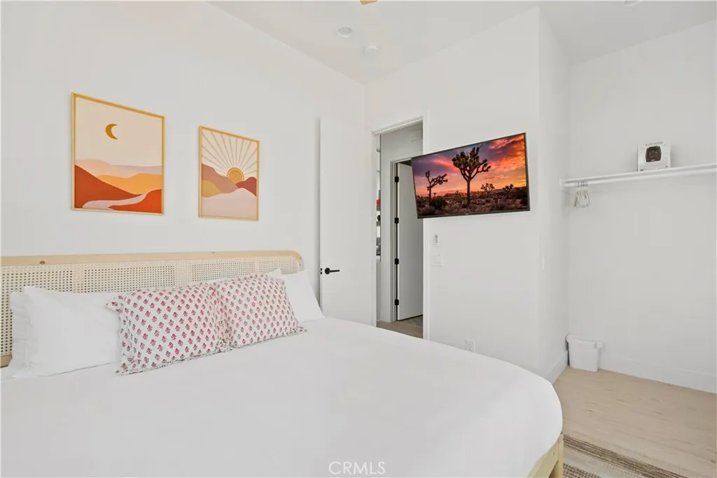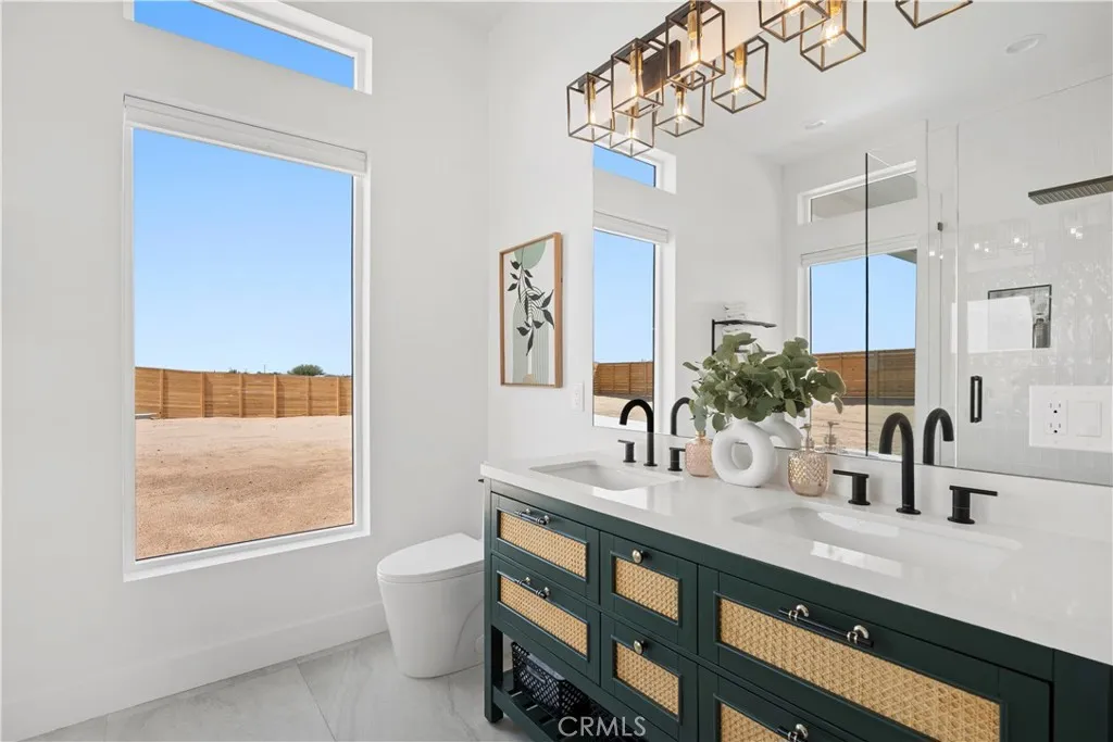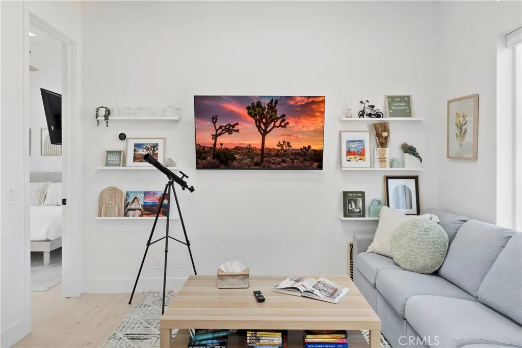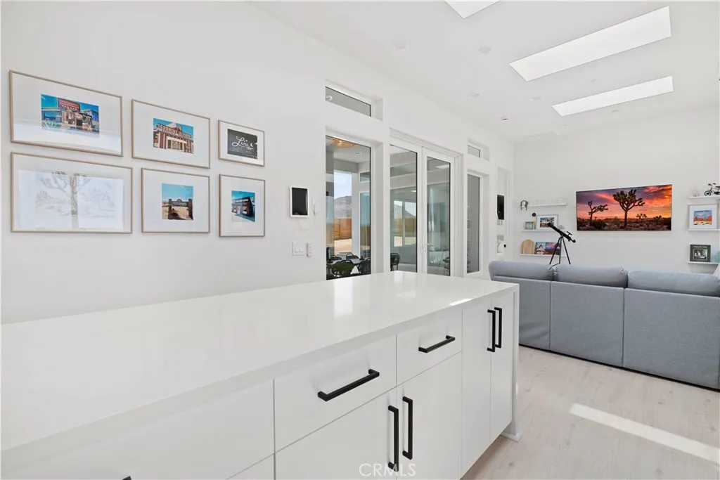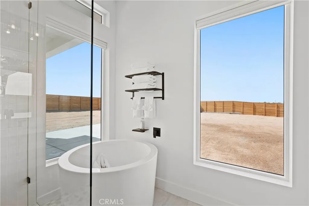 Architect-designed contemporary residence built in 2024, with custom detail throughout. The home features 10-foot ceilings, expansive windows, skylights, and an open floor plan. Interior living space totals 1,043 sq ft, complemented by a California room offering over 110 sq ft of indoor/outdoor dining and living space with an electric fireplace. Set on 2.5 acres, the property provides a rare sense of openness, with approximately one-third enclosed by 6-foot-high fencing for privacy. An automatic gate opens to a concrete driveway leading to an attached carport. Interior finishes include recessed lighting, linear air distribution, and a custom entertainment wall with floating shelving. The kitchen is designed for both function and aesthetics, featuring new stainless steel appliances, a 12-foot peninsula with breakfast bar seating, custom cabinetry extending to the ceiling, open shelving, a vent hood, and tiled accent walls. The home offers generously sized bathrooms with a modern aesthetic, including tile extending to the ceiling and 8-foot glass shower enclosures. The primary suite includes a large private bath with a round soaking tub, glass-enclosed shower with black wall-mounted shower fixtures, ceiling-height tile, and a dual-basin vanity. Bedrooms feature large windows with privacy shades. Additional amenities include a photovoltaic solar system with 15 panels and a Tesla battery capable of powering the home during electrical outages. Exterior features include a concrete patio, an in-ground stock tank pool with a full filtration system discreetly housed beneath a custom wooden bench, and an outdoor rain-style shower. Located in the Hidden River neighborhood, known for architecturally distinctive homes, with convenient access to restaurants, cafés, the farmers market, and Joshua Tree National Park. Property is partially occupied. Please do not disturb occupants.