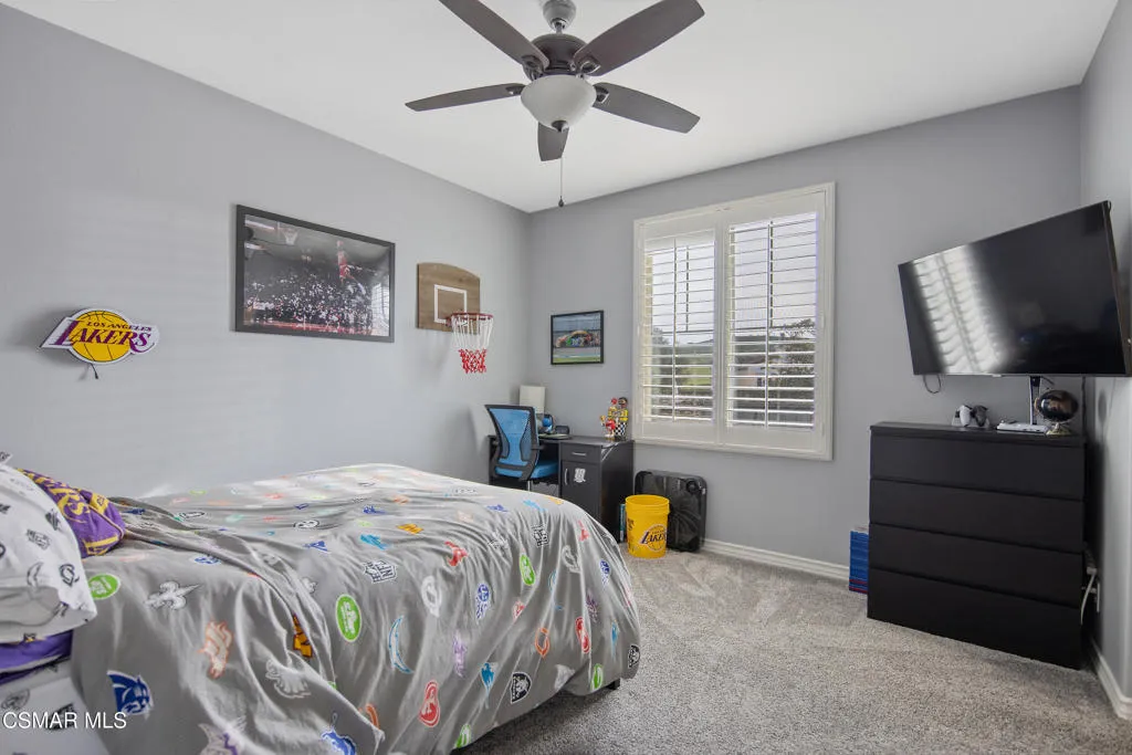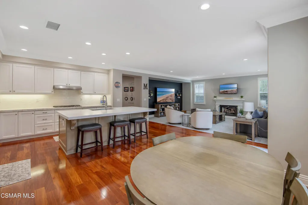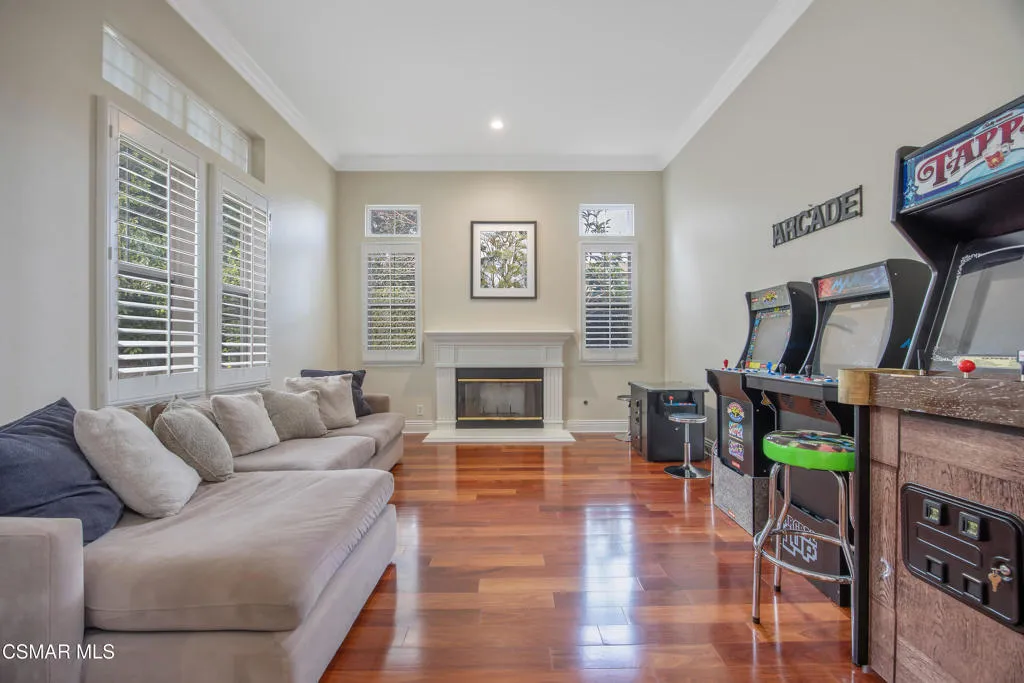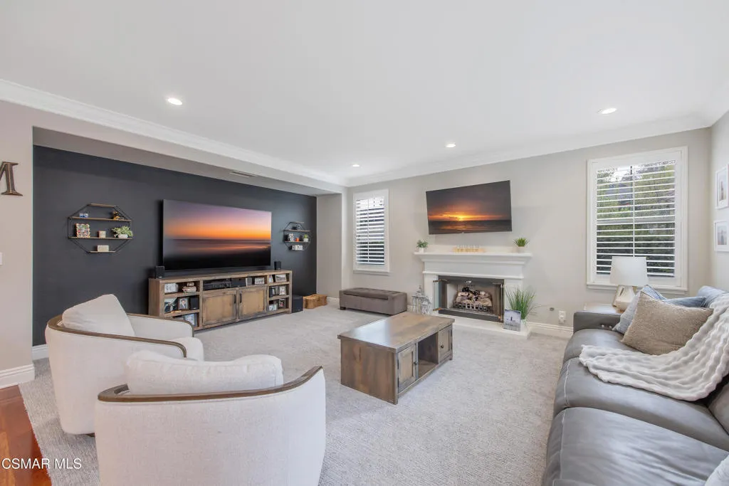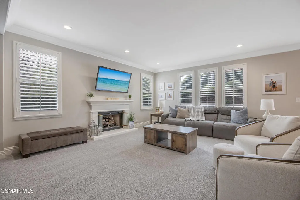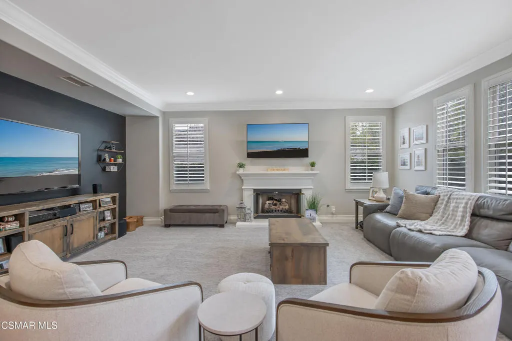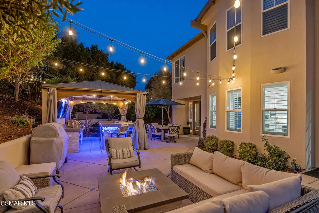 Welcome to 1101 Via Hispano, a stunning residence tucked behind the gate guarded prestigious Estancia community in Dos Vientos. Perfectly positioned on a private corner lot at the end of a quiet cul-de-sac, this exceptional home offers the rare combination of privacy, elegance, and resort-style living in one of Newbury Park's most sought-after neighborhoods. This home has over 4,300 square feet of living space on an over 11,700 square foot lot.A dramatic two-story foyer with soaring ceilings sets the tone the moment you step inside, filling the home with natural light and a sense of grandeur. Plantation shutters throughout add timeless style while framing every space with warmth and sophistication.Designed for both everyday comfort and upscale entertaining, the thoughtfully designed floor plan features five spacious bedrooms, a private executive office, and an expansive upstairs bonus room. Just off the entry, the formal dining room showcases French doors that open directly to the yard, creating seamless indoor-outdoor flow and the perfect backdrop for gatherings. A charming front courtyard patio offers an inviting space for morning coffee or evening relaxation.The first-floor executive office, complete with French doors leading to a covered porch, provides a quiet and inspiring work-from-home environment. Nearby, the living room boasts soaring ceilings and a cozy fireplace, creating an elegant yet welcoming setting.At the heart of the home is the beautifully updated kitchen, designed to impress even the most discerning chef. Featuring a massive quartz center island with bar seating, quartz countertops throughout, stainless steel appliances, an adjacent breakfast area, and a generous walk-in pantry, this space effortlessly combines function and style. The open-concept layout flows into the great room/family room with fireplace, making it the ultimate hub for connection and entertaining.A desirable first floor bedroom suite provides comfort and privacy for guests or multi-generational living and features a recently updated full bathroom. There is also a convenient first floor powder bathroom. Upstairs, retreat to the luxurious primary suite, a true sanctuary complete with a sitting area and its own fireplace. The spa-inspired primary bath features dual sinks, a large walk-in shower, and an oversized walk-in closet. The upper level also includes a spacious bonus room with access to a private balcony overlooking the courtyard below -- perfect for a media room, playroom, or second lounge.Three additional bedrooms complete the second floor, including a junior primary suite with its own freshly remodeled private bath. Two bedrooms share a connected freshly remodeled bath with separate sink areas and a shared shower/tub configuration, offering both convenience and privacy.Step outside and experience your own backyard oasis. The fully private yard is lushly landscaped and designed for year-round enjoyment. The outdoor living pavilion features a solid covered roof, built-in bar seating, BBQ, sink, two burners, two flat-screen TVs, ceiling fan, and heaters -- ideal for hosting unforgettable gatherings. Relax around the firepit seating area or enjoy the expansive grassy lawn, which includes architectural plans for a future pool and spa.Mature fruit trees including lemon, avocado, fig, kumquat, and grapevines enhance the garden setting, while low-voltage lighting and a raised patio create a warm evening ambiance.Additional highlights include a three-car garage with epoxy flooring and built-in cabinetry, offering both durability and abundant storage. Just off the garage, the large laundry room has a sink. As part of the highly desirable Dos Vientos community, residents enjoy access to parks, scenic hiking trails, tennis courts, baseball and volleyball fields, basketball courts, and a top-rated elementary school -- all just moments from home.1101 Via Hispano is more than a house -- it's a private retreat designed for living beautifully.