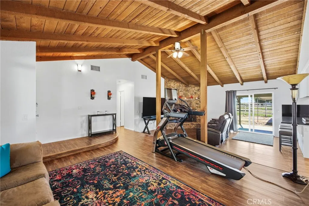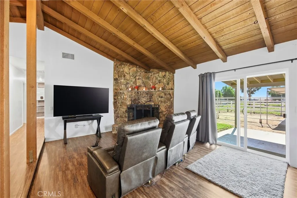 Looking for that horse property? This single level ranch style home has so much to offer for the horse lover. Beautiful vaulted wooden ceilings, step down open family room with wood burning fireplace, Family dining area, open kitchen with upgraded appliances, quartz counters, gas cooktop, breakfest bar to enjoy conversations with family and friends. Newly installed gas oven and dishwasher. Custom dark laminate flooring throughout. 2 spacious bedrooms, one has custom built in bookshelves, plus spacious main bedroom. Completely upgraded guest bath with new shower/tub, upgraded vanity, flooring and lighting. Main bathroom has walk in shower and upgraded vanity. Newly installed, upgraded windows and slider. Rear yard has 1 - 24x24 - 3 rail plus gate panel and 1 - 24x24 - 4 rail with 12x24 shelter and gate panel pipe corrals. Large turn out area, Nice shade trees, wash rack all completly fenced. Plenty of room for that horse trailer and RV 3 car garage. Large front yard with open porch. Space that you can enjoy!