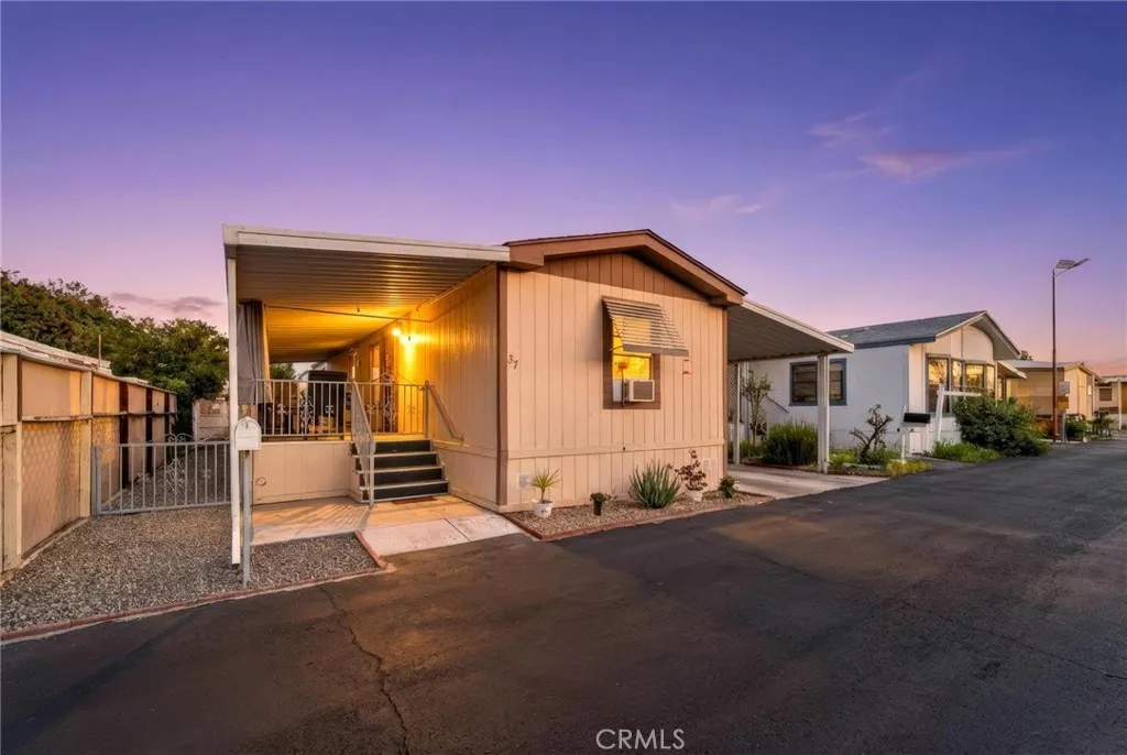 This perfect 2 bedroom 2 bathroom mobile home is located in Juniper Terrace 55+ senior community. Ready for new owners! Home has been loved and taken care of. Light and bright open concept with laminate floors. Each bedroom is ample in size and are on opposite sides of the home. Outside patio is open to outside living, enjoy a cup of coffee or glass of wine on porch. Carport could accommodate 3 cars. Shed stays.