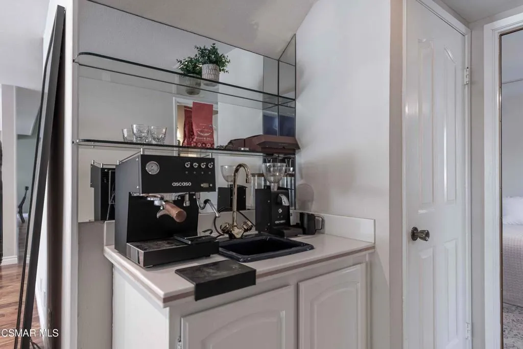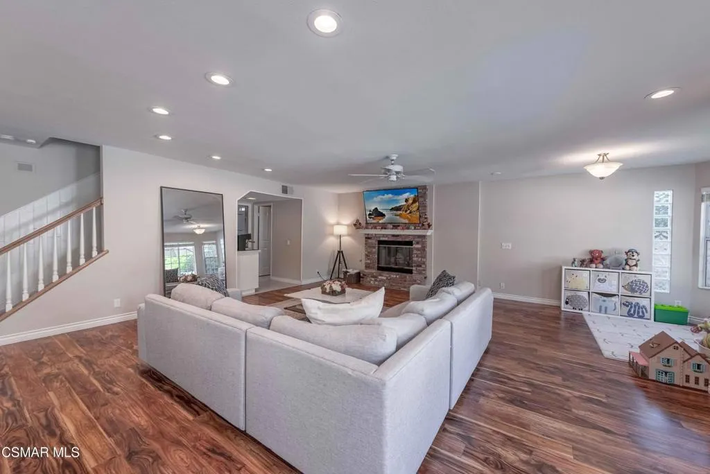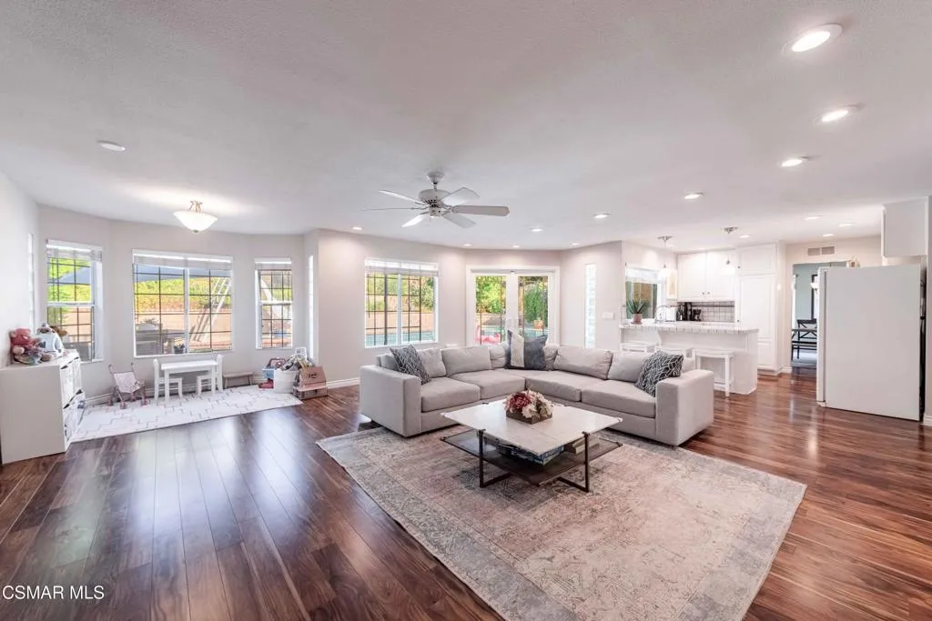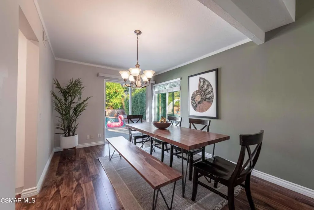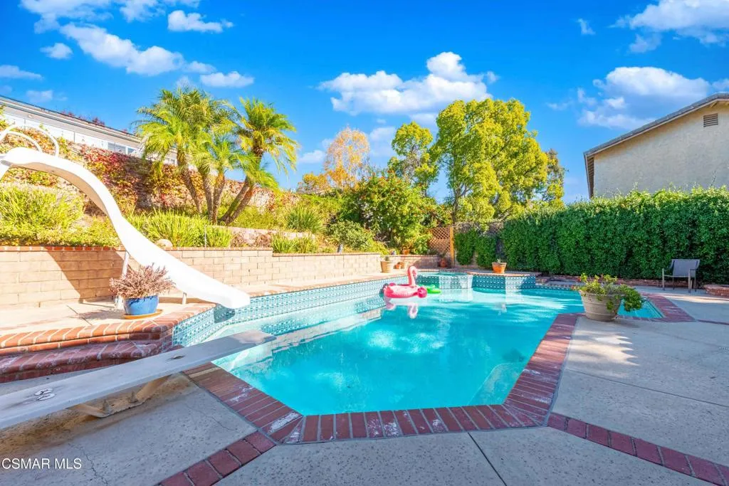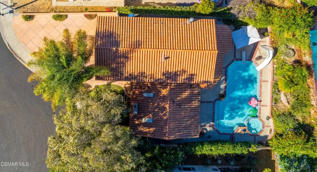 Move right into this beautiful home superbly located on a quiet culdesac in a wonderful area of Thousand Oaks. Situated at the edge of the beautiful Sapwi Trails Community Park, hiking and biking are just steps away. This home does not disappoint with it's well-thought out floorplan and cheerful ambiance that includes vaulted living room ceiling with skylights; french doors, and plantation shutters. As the largest floorplan in the tract, this home boasts an additional added 220 sq ft of living area in the family room, where you need it the most! Kitchen adjoins with white cabinetry and a view out to the scenic backyard. There's a breakfast bar featuring pendent lighting for casual meals, as well as a formal dining room with slider for moving the party outside for some al fresco dining. Rounding out the downstairs is a coffee or wet bar for enhanced entertaining and convenient powder room. There's also direct access to the former garage, turned into flex space. Currently outfitted as a guest/office space, plus laundry area, plus separate storage, it could easily be turned back into a two car garage or possible ADU. As you head upstairs you will find 4 comfortably sized bedrooms. The three secondary bedrooms share the hall bath outfitted with white subway tile while the spacious primary bedroom features delightful mountain views and is equipped with a large well organized wardrobe closet and upgraded bath. Once outside, the backyard beckons you to stay and play. Vacation at home in large sparkling pool and soothing spa, Dine under the stars or enjoy the lush landscaping, where butterflies and hummingbirds come to visit. The perfect balance of indoor comfort and outdoor enjoyment. Welcome home to SoCal living at its best!