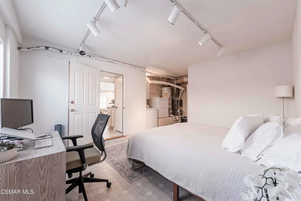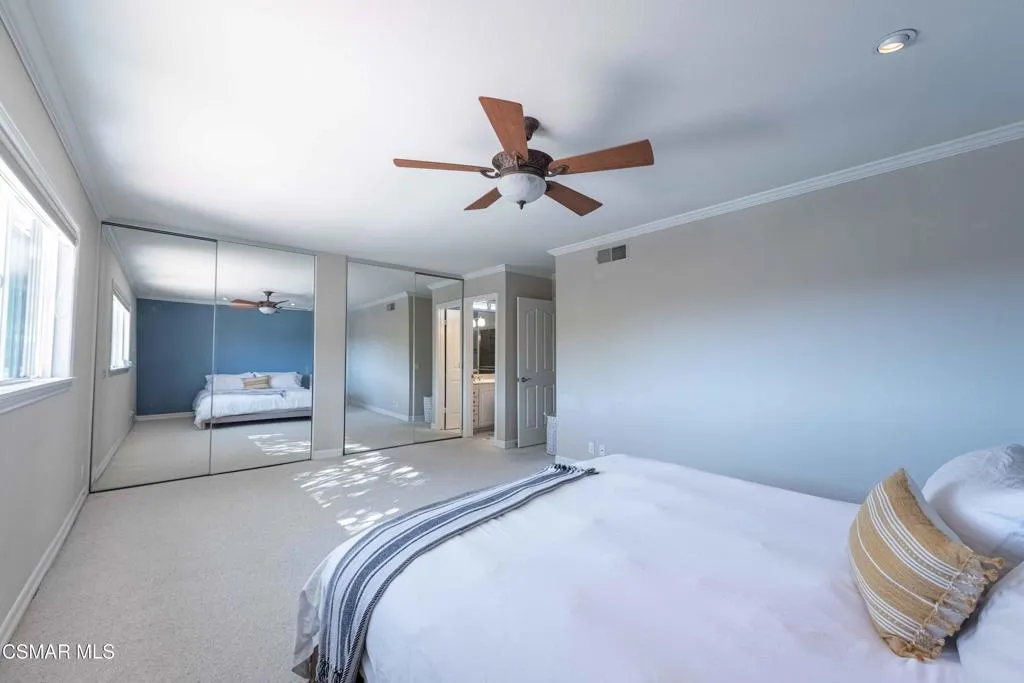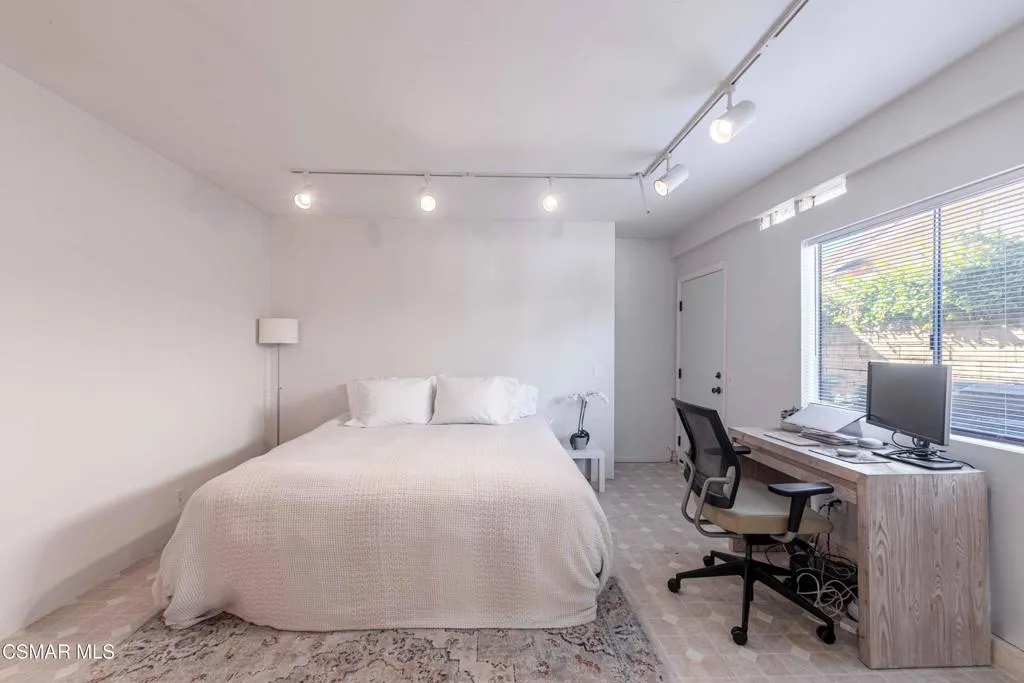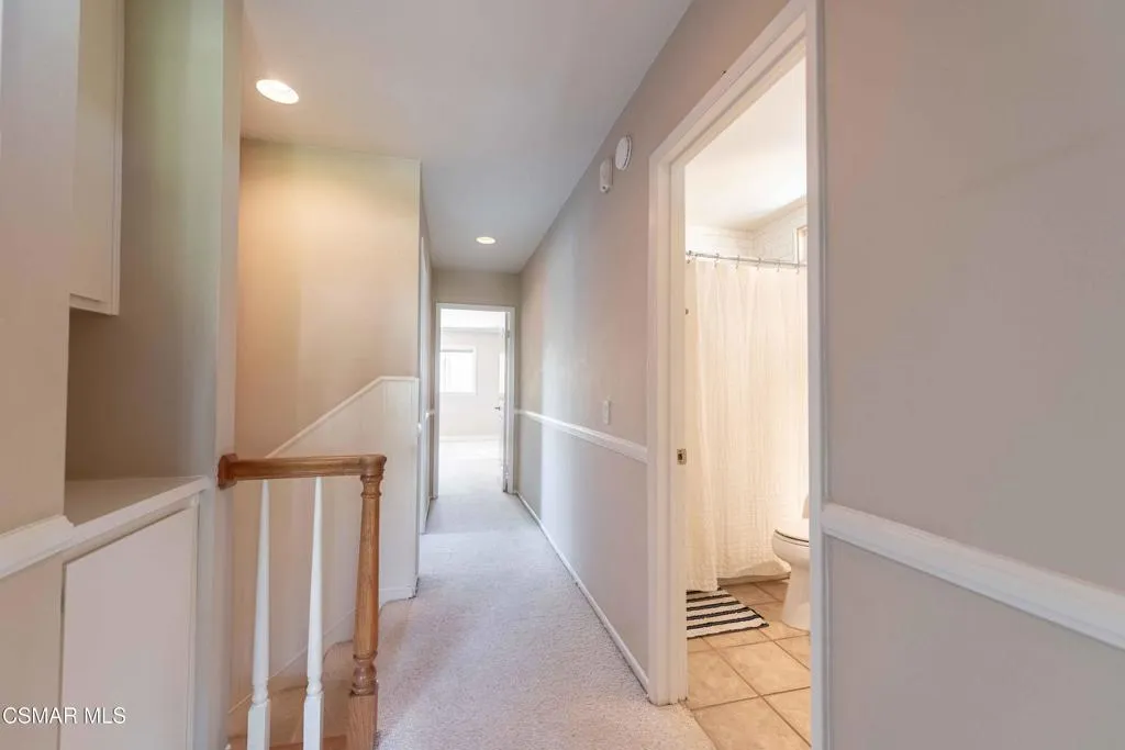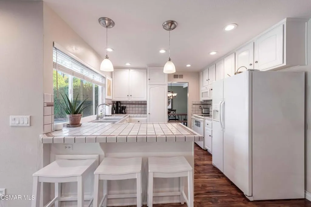 Move right into this beautiful home superbly located on a quiet culdesac in a wonderful area of Thousand Oaks. Situated at the edge of the beautiful Sapwi Trails Community Park, hiking and biking are just steps away. This home does not disappoint with it's well-thought out floorplan and cheerful ambiance that includes vaulted living room ceiling with skylights; french doors, and plantation shutters. As the largest floorplan in the tract, this home boasts an additional added 220 sq ft of living area in the family room, where you need it the most! Kitchen adjoins with white cabinetry and a view out to the scenic backyard. There's a breakfast bar featuring pendent lighting for casual meals, as well as a formal dining room with slider for moving the party outside for some al fresco dining. Rounding out the downstairs is a coffee or wet bar for enhanced entertaining and convenient powder room. There's also direct access to the former garage, turned into flex space. Currently outfitted as a guest/office space, plus laundry area, plus separate storage, it could easily be turned back into a two car garage or possible ADU. As you head upstairs you will find 4 comfortably sized bedrooms. The three secondary bedrooms share the hall bath outfitted with white subway tile while the spacious primary bedroom features delightful mountain views and is equipped with a large well organized wardrobe closet and upgraded bath. Once outside, the backyard beckons you to stay and play. Vacation at home in large sparkling pool and soothing spa, Dine under the stars or enjoy the lush landscaping, where butterflies and hummingbirds come to visit. The perfect balance of indoor comfort and outdoor enjoyment. Welcome home to SoCal living at its best!
