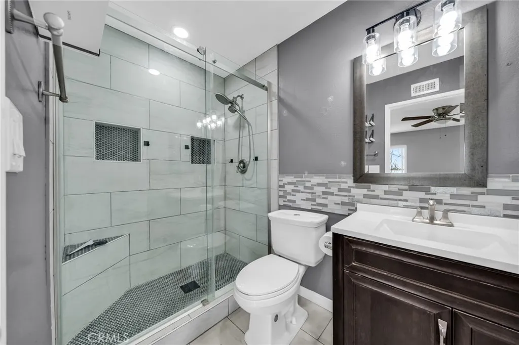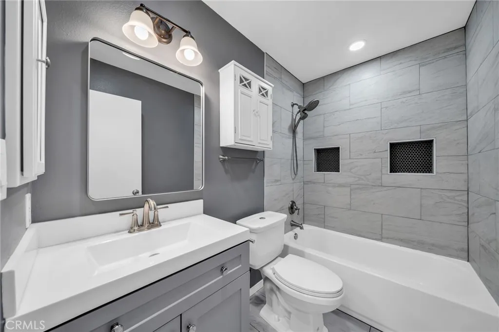 Located in the highly desirable Cypress Village community, this sought after Jamestown model offers 3 bedrooms, 2.5 bathrooms, 1,435 sq. ft of well designed living space with thoughtful renovations throughout, reflecting true pride of ownership. An inviting front courtyard welcomes you into a light filled interior. The living room features recessed lighting, dual pane windows, a sliding glass door, and a cozy gas fireplace. Porcelain tile flooring extends throughout the downstairs living areas, while luxury vinyl flooring enhances the upstairs bedrooms. Timeless interior paint and smooth ceilings add to the home’s clean, modern feel. The kitchen and bathrooms were remodeled approximately one year ago and include modern countertops, an updated backsplash, stainless steel appliances, and upgraded finishes. Upstairs, the primary suite offers abundant natural light, a spacious closet, and an updated ensuite bathroom with a walk in shower. Two additional bedrooms and a full guest bathroom complete the upper level.