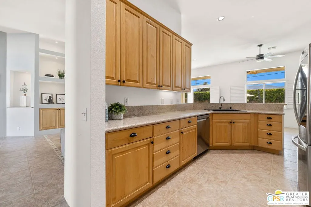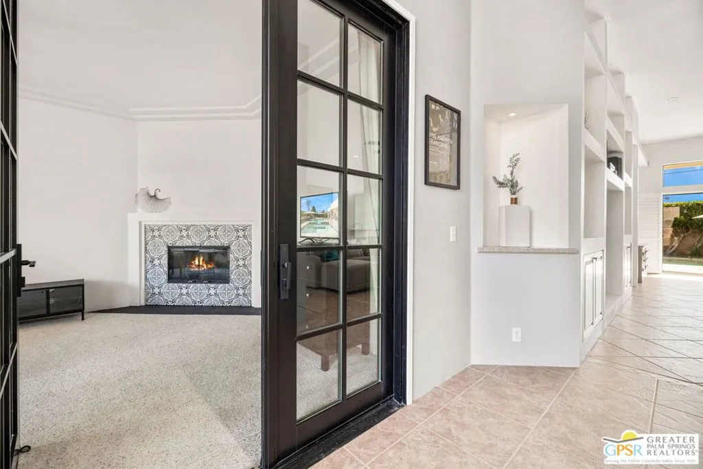 Positioned to capture breathtaking mountain views to the south and west, this contemporary Palm Desert residence features a thoughtful layout with strong sightlines to the pool and surrounding mountains. A courtyard entry opens to a light-filled, open-concept living room framed by clerestory windows and striking floor-to-ceiling built-ins, perfect for entertaining and everyday living, while the pool and mountains are visible from the main spaces with the option to expand sightlines by selectively lowering the hedge. The kitchen flows seamlessly to a breakfast area and flexible dining space, while bedrooms are well separated for privacy, including a primary suite that opens to the pool and spa with mountain views, dual vanities, and a walk-in closet, and guest bedrooms that share an updated bath on the opposite wing. A bonus family room with a fireplace near the front of the home is currently used as a fourth bedroom. Outdoors, a covered entertaining area includes a built-in barbecue, bar sink, refrigerator, and burner, complemented by RV parking behind a large side gate, a three-car garage with finished floors and built-in cabinetry, rooftop solar, and a newer 2023 HVAC system, all on fee simple land. Centrally located near the best of Palm Desert and Indian Wells with The Golf Center at Palm Desert next door and CV Link nearby for cyclists, this home offers privacy, flexibility, and stunning desert views.