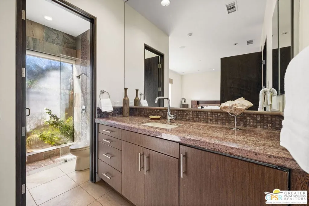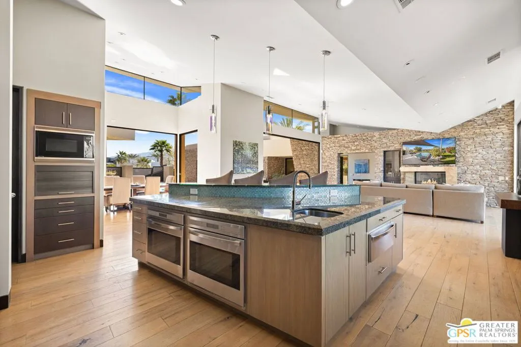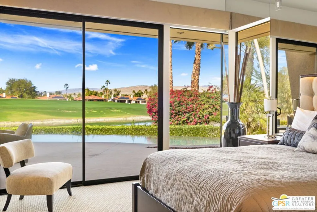 Designed and constructed by Patel Design Group, this fully furnished architectural estate is set on an expansive 28,000 sq ft lot behind the gates of Westgate at Mission Hills Country Club, offering panoramic lake and fairway views across the Pete Dye Course. With TWO PRIVATE POOLS and nearly 4,900 sq ft of living space, the residence delivers a rare blend of scale, privacy, and resort-style living. Soaring 16-foot ceilings, clerestory windows, and walls of glass define the main living areas, filling the home with natural light while electronic shades and integrated LED lighting provide comfort and control. Two fully retractable sliding glass doors create seamless indoor/outdoor flow to both the front and rear entertaining spaces. Designed for hosting at any scale, the home features a dramatic great room, formal dining area, and a step-down wet bar that anchors the entertaining experience. The chef's kitchen is equally impressive, appointed with a Wolf appliance suite including dual ovens, dual dishwashers, a warming drawer, and a 60-bottle wine cooler - ideal for both everyday living and events. Outdoor living is a true highlight. The private south-facing yard features one pool, while the rear of the property showcases a striking north-facing infinity-edge pool overlooking the lake and fairway. A built-in BBQ island with granite counters and generous seating completes the outdoor experience. The residence offers six bedrooms and seven baths, including four private ensuites in the main house and an attached two-bedroom casita with its own entrance, living room, kitchenette, and two baths - perfect for guests, extended family, or multi-generational living while maintaining privacy. Additional features include a three-car garage, refined natural stone finishes, and thoughtful architectural detailing throughout. Offered fully furnished, this is a rare opportunity to own a turnkey, resort-style estate within one of Mission Hills' most exclusive enclaves. Sophisticated, private, and designed to impress. This is elevated desert living at its finest.