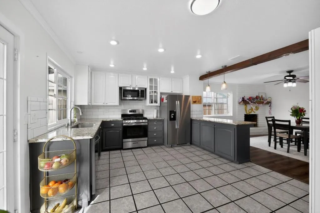 Welcome to this charming 3-bedroom, 2-bath home located in the City of Manteca. Boasting 1,521 sq. ft. of thoughtfully designed living space, this residence offers a functional and open layout perfect for modern living. At the heart of the home is a beautifully updated kitchen featuring two-toned cabinetry, granite countertops, a stylish tile backsplash, and Whirlpool stainless steel appliances. The kitchen island with a sitting area flows seamlessly into the family room, creating an inviting open-concept space ideal for entertaining and everyday living. Durable laminate and tile flooring extend throughout the home, combining easy maintenance with timeless appeal. Cozy up to the gas fireplace during cooler months, adding warmth and character to the living area. Central air conditioning and heating provide year-round comfort. Convenience is enhanced by a 220V electrical hookup in the garage, making laundry and other household tasks effortless. Step outside to a professionally landscaped backyard featuring elegant pavers and a covered pergola, offering a serene space to relax and enjoy warm summer days. Experience comfortable living and thoughtful design in this inviting Manteca Home.