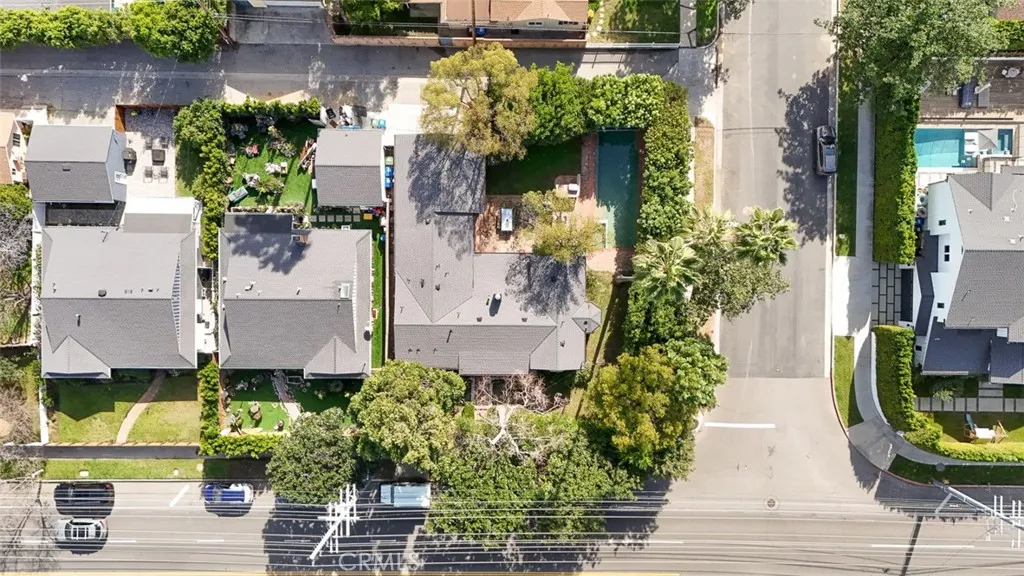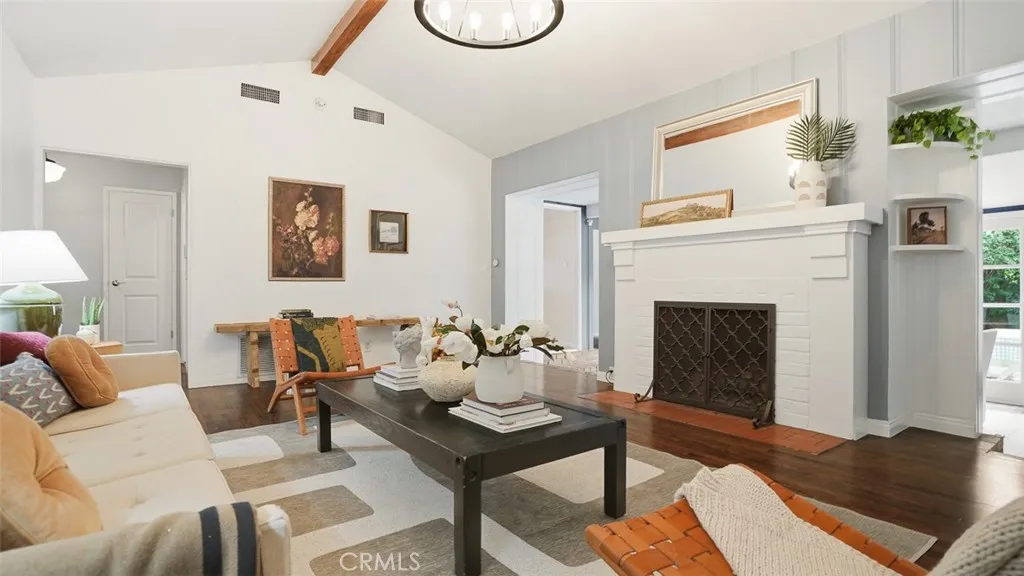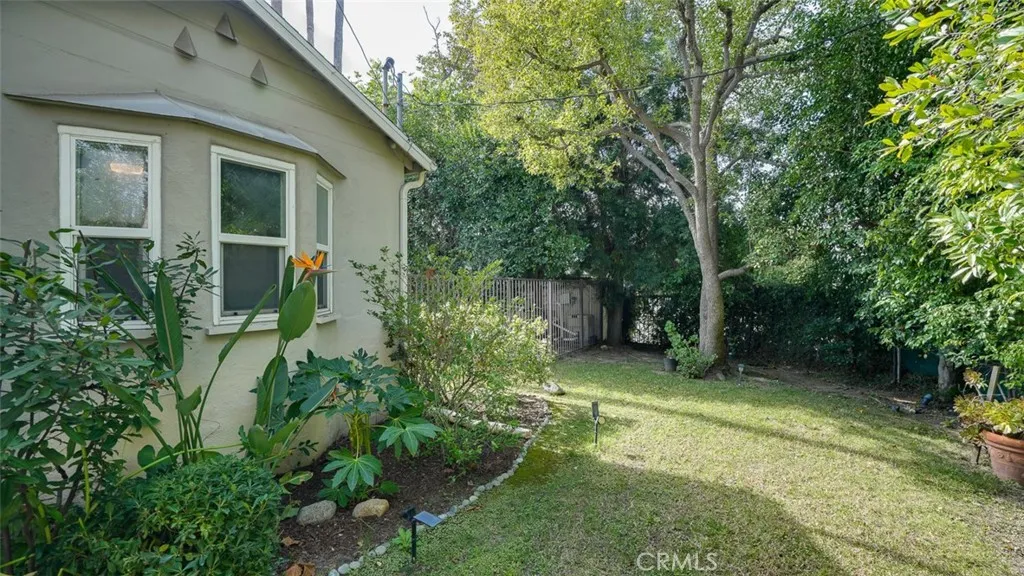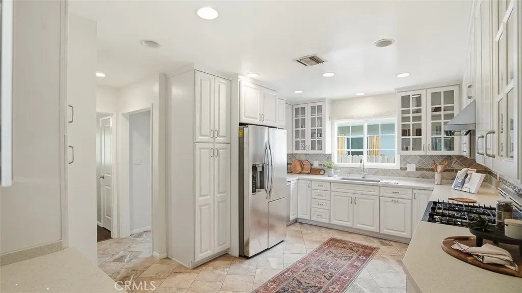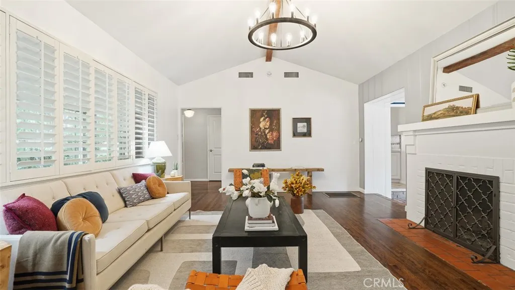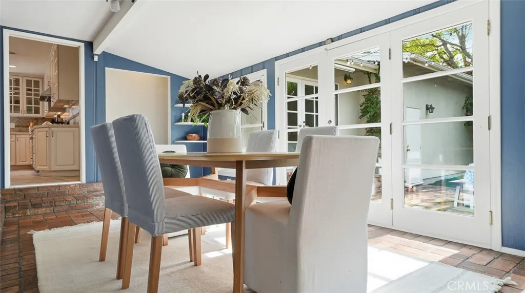 Bathed in natural light, the thoughtfully designed floor plan blends classic charm with modern updates. A vaulted living room with beamed ceiling anchors the home, flowing seamlessly into a dining room that opens directly to the expansive backyard. The updated kitchen features Caesarstone countertops, stainless steel appliances, recessed lighting, and clean, timeless finishes. The spacious primary suite is a true retreat, complete with dual walk-in closets, French doors going out to the backyard, and a spa-inspired bath complete with soaking tub. Two generous secondary bedrooms and updated baths are thoughtfully positioned in a separate wing, while a detached office provides an ideal work-from-home setup or creative studio.