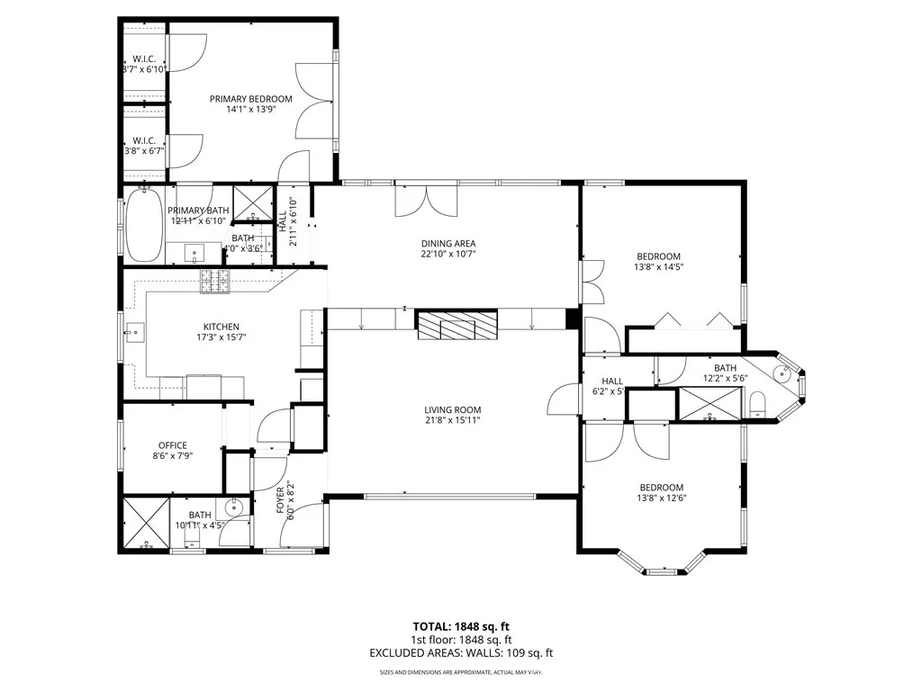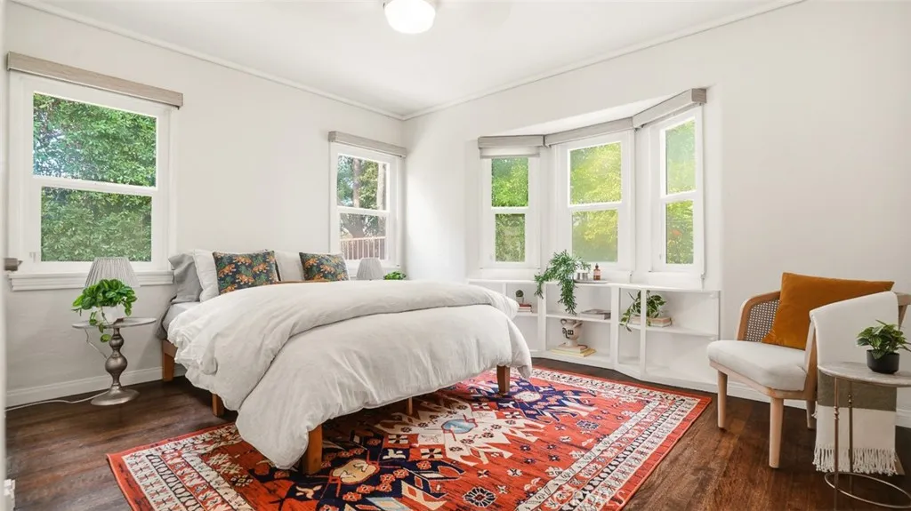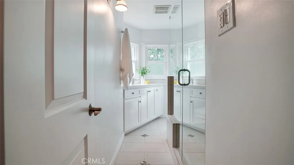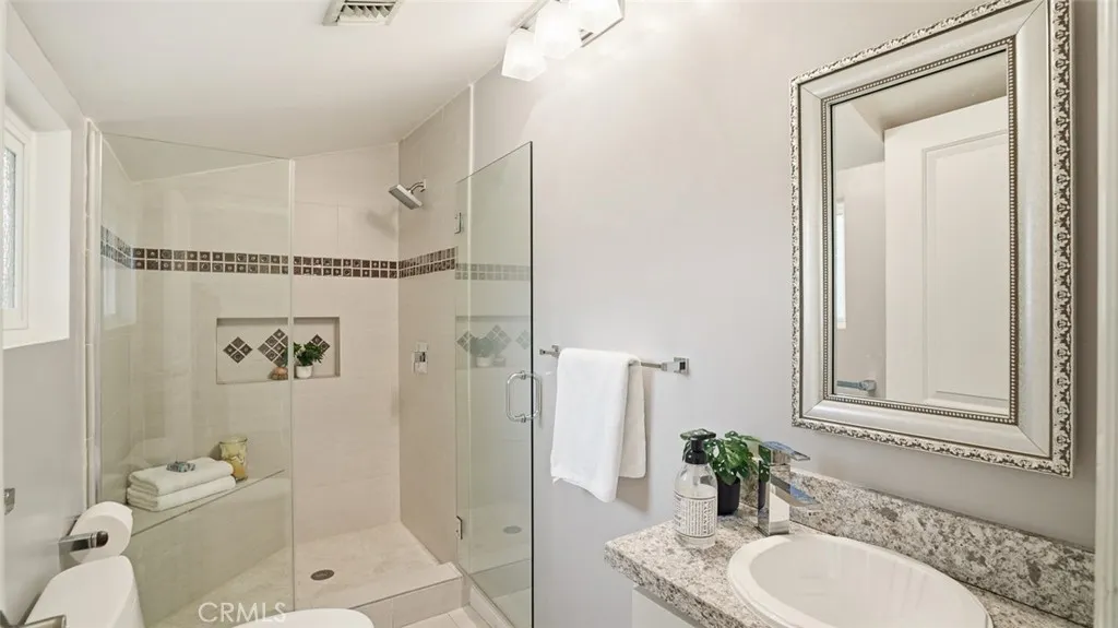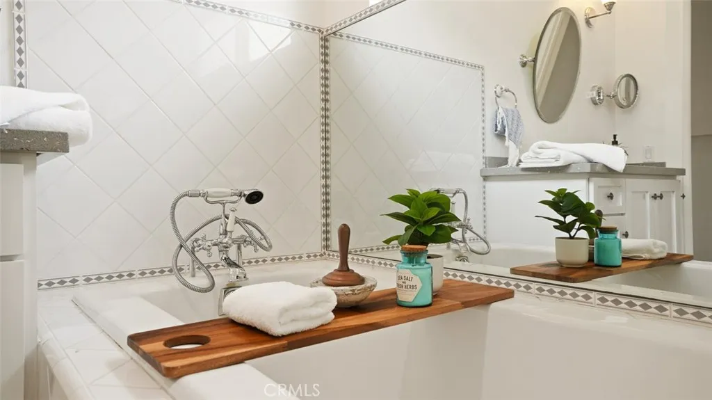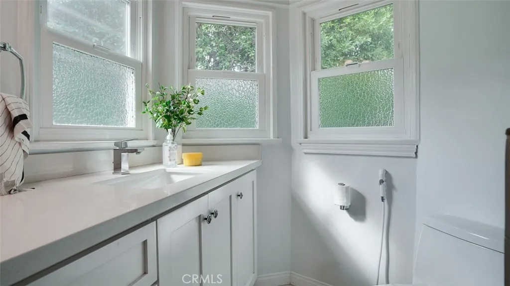 Bathed in natural light, the thoughtfully designed floor plan blends classic charm with modern updates. A vaulted living room with beamed ceiling anchors the home, flowing seamlessly into a dining room that opens directly to the expansive backyard. The updated kitchen features Caesarstone countertops, stainless steel appliances, recessed lighting, and clean, timeless finishes. The spacious primary suite is a true retreat, complete with dual walk-in closets, French doors going out to the backyard, and a spa-inspired bath complete with soaking tub. Two generous secondary bedrooms and updated baths are thoughtfully positioned in a separate wing, while a detached office provides an ideal work-from-home setup or creative studio.