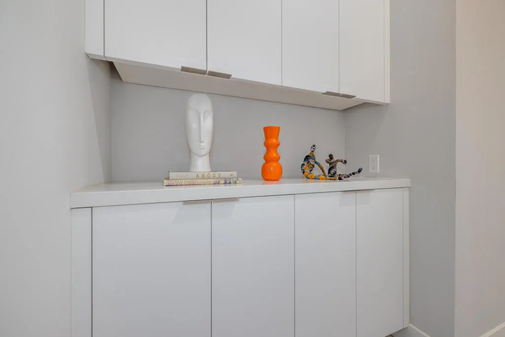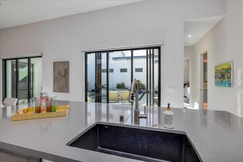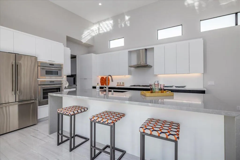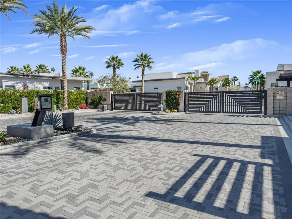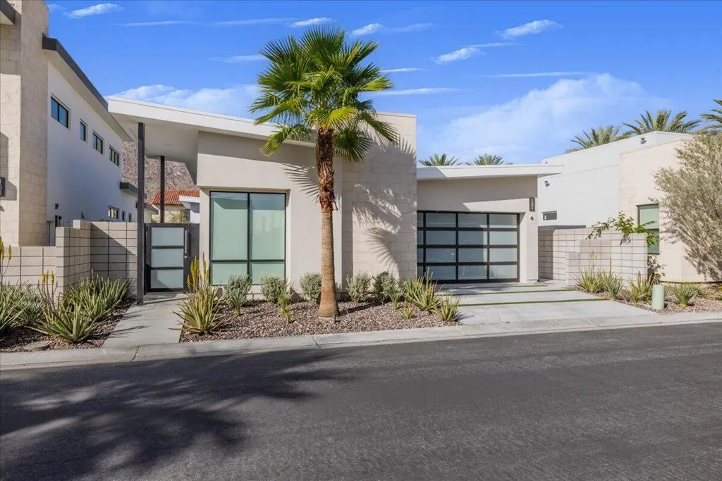 Iconic mid-century design meets modern luxury in The Vue, a gated enclave in the heart of central Palm Springs. Completed in 2023, this single-story architectural residence offers refined design, seamless indoor-outdoor living, and timeless desert appeal. The home's striking butterfly roof sets the tone, while an open-concept layout is flooded with natural light from expansive clerestory windows. Thoughtfully designed for both entertaining and everyday comfort, the residence features 2 spacious bedrooms, 2.5 bathrooms, and a versatile office/den.The chef's kitchen commands attention with premium Thermador appliances, quartz countertops, and a dramatic waterfall island, flowing effortlessly into the living area for a clean, contemporary aesthetic. Dual multi-slide glass doors open to a private backyard retreat with a covered patio ideal for dining and relaxation. A south-facing cocktail pool with Pebble Tec finish and three cascading waterfalls delivers a true resort-style experience, complemented by stunning views of the San Jacinto Mountains. Notable upgrades include built-in speakers with Sonos system, custom electric blinds throughout, a hardwired alarm system, and owned solar panels, blending luxury with energy efficiency. Just minutes from Palm Springs' top restaurants, shopping, and iconic hotels, this is a rare opportunity to own a nearly new architectural home in one of the city's most desirable locations.