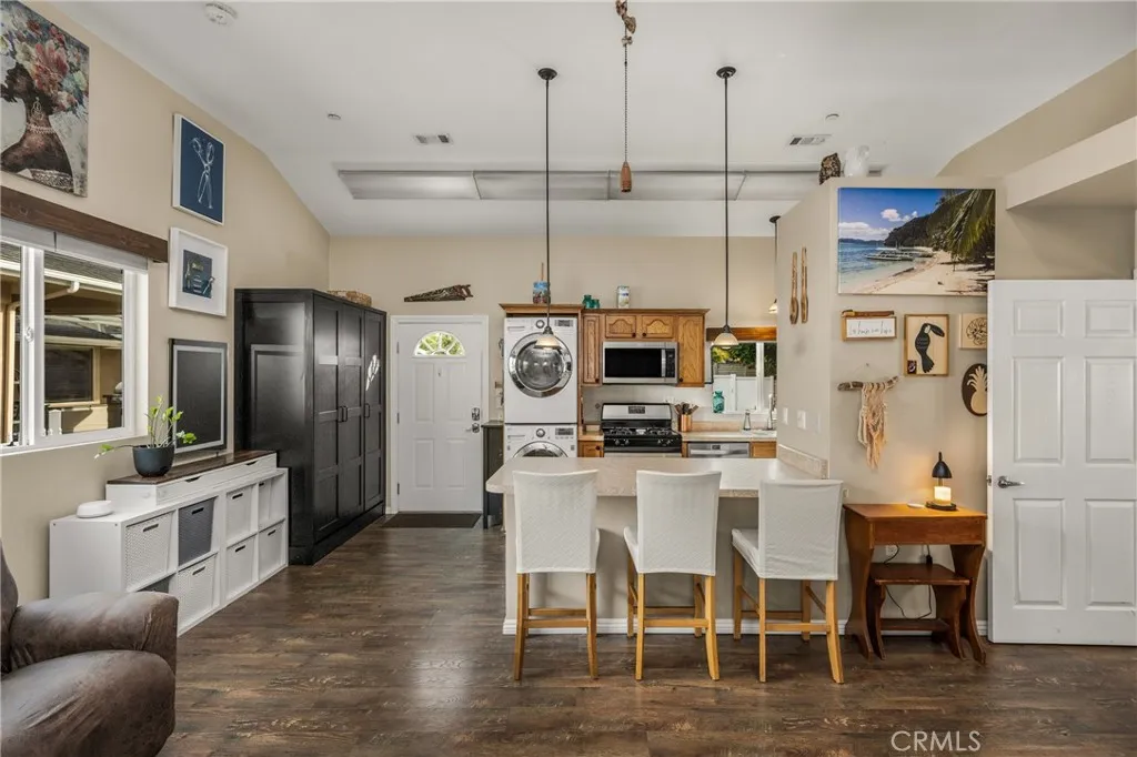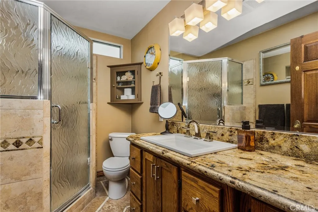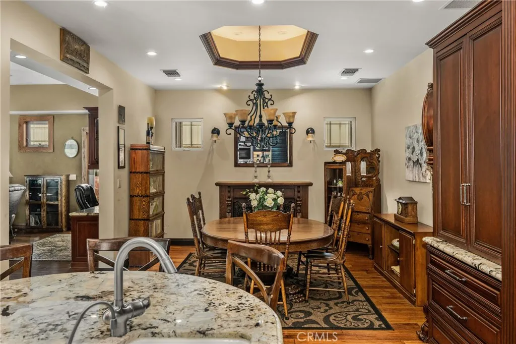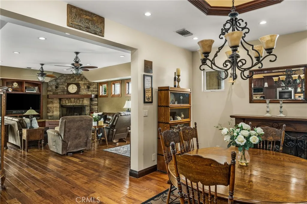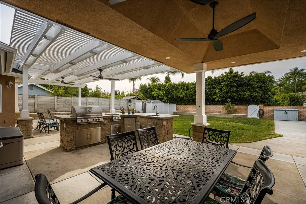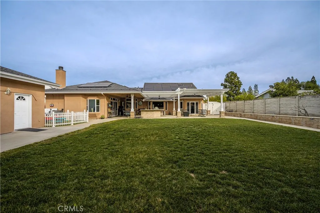 This 5 bed, 3 bath home with a 2 bed 1 bath ADU and RV parking on an oversized lot with solar panels is perfect for multigenerational living and is in one of Yorba Linda’s most desirable neighborhoods! Main lives like a single level with the primary suite, two bedrooms/one bath on the first floor and two beds/one bath upstairs. The detached ADU offers potential for income, and the RV driveway has electricity and dump station. For those warm Summer nights, the extended roof patio spans the front of the home and your lawn will always look mowed with the manicured artificial turf. The RV gate is 17 ft wide and the driveway is over 60ft long and 18ft wide from eves to wall along side the 3 car garage. Inside, views to the backyard, vaulted ceilings, and a warm wood floor greet you. The classic kitchen is beautifully appointed with top-of-the-line appliances including a Sub Zero refrigerator, Dacor 5 burner stove, Miele double ovens and warming drawer, Kitchenaide stainless dishwasher and fridge with panel doors matching the cherry cabinets with beading. A Farmhouse sink and solid maple pullout drawers including a spice rack, and two lazy Susans with many soft close drawers make this kitchen as functional as it is beautiful. The spacious island showcases Splendor granite, a separate sink and seating for three. The ample cabinetry also offers a coffee cabinet and Splendor backsplash diamond cut outs. An abundance of lighting tops it off. The large dining area can accommodate a 12 ft table and has fireplace. Everyone will come hang out in the huge room with the stone covered fireplace and hearth. The windows and the sliding glass door to the outdoor kitchen bring lots of light. Built in cabinets and desk span one whole wall. Step out to the patio where you'll find an outdoor kitchen that was recently constructed with concrete counters, a Blaze BBQ, 2 burner stove, sink and garbage disposal. Green grass, avocado trees, and the ADU are surrounded by concrete and slump stone walls. The 920 foot ADU hosts 2 bedrooms and 1 bath with kitchen overlooking a very spacious gathering area, and outside is a gated artificial turf yard. Step back into the primary room doors in the main house to find a spacious room with a wall of closets, walk in shower in the primary bath and down the hall 2 bedrooms with wood floors and the hall bath with tub. Up stairs you’ll find 2 more bedrooms and a hall bath with a shower. Shopping, theatre, Yorba Linda lakebed and great schools.