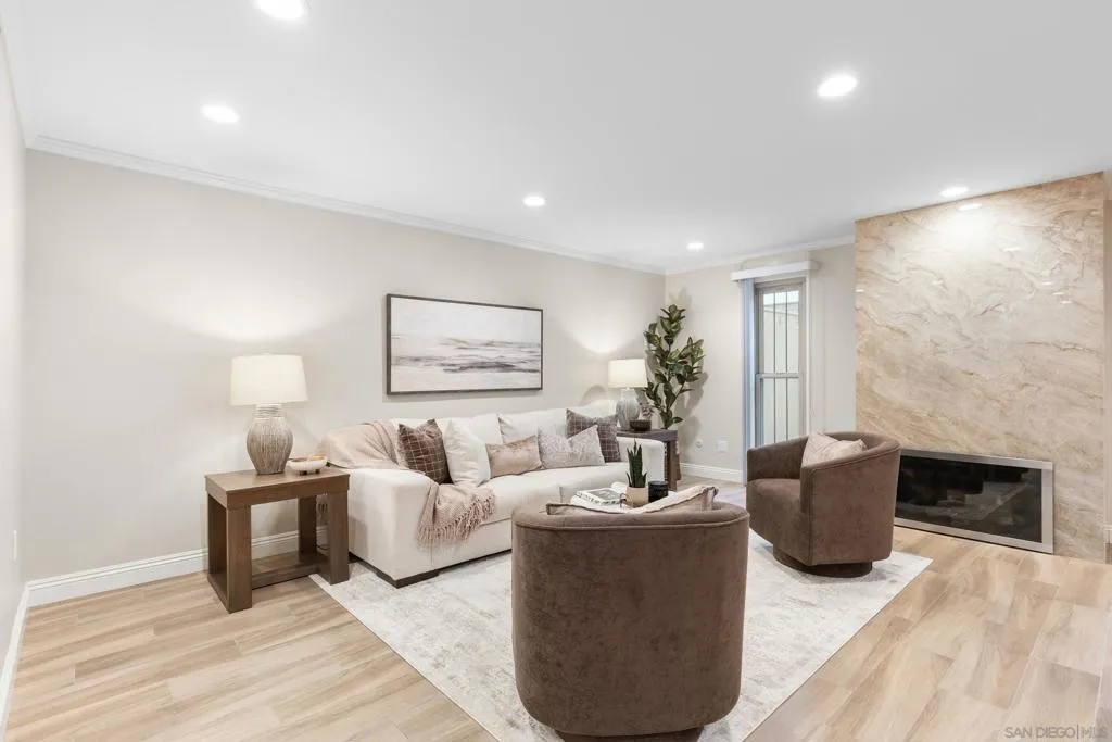 Welcome to this move-in ready, beautifully remodeled townhome in the highly sought-after Orleans East community. Just minutes from the beach, this stunning home showcases high-quality designer upgrades throughout. Be prepared to be wowed by the bright, airy open-concept floor plan, enhanced by elegant crown molding and sophisticated recessed lighting, creating a truly refined, designer-inspired feel. The home features 2 bedrooms and 1.5 baths, highlighted by a generously sized primary bedroom complete with its own private balcony. The main level boasts stylish tile flooring, a modern kitchen adorned with striking quartzite countertops, and premium Jenn-Air stainless steel appliances. An electric fireplace insert adds warmth and ambiance, delivering the perfect blend of comfort and contemporary style. Step outside to a large private patio — ideal for relaxing, entertaining, or enjoying San Diego’s beautiful climate. Everyday living is effortless with an attached direct-entry two-car garage plus additional driveway parking. Residents enjoy the community pool, while the prime location offers outstanding proximity to major freeways (5, 8, 805, and 163), along with easy access to the shops, dining, and vibrant coastal lifestyle of Point Loma and Ocean Beach. VA approved complex