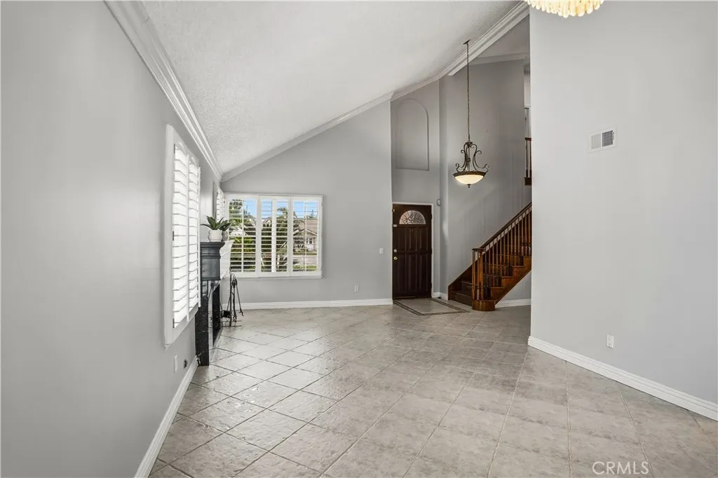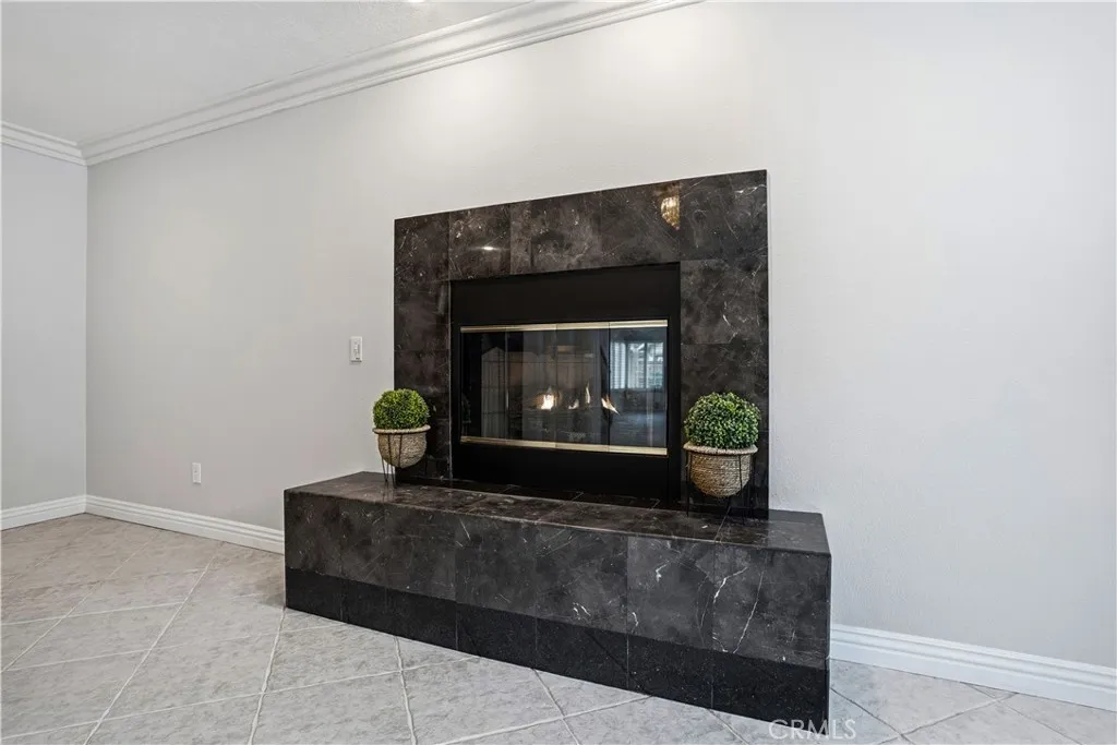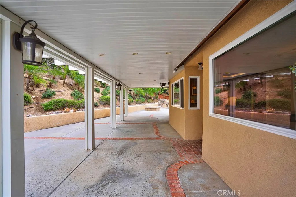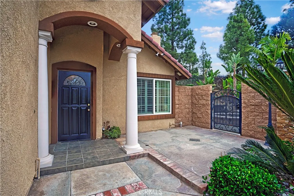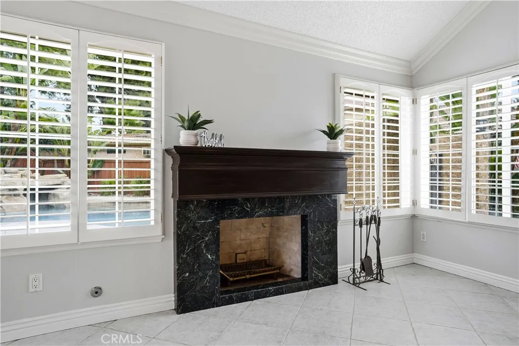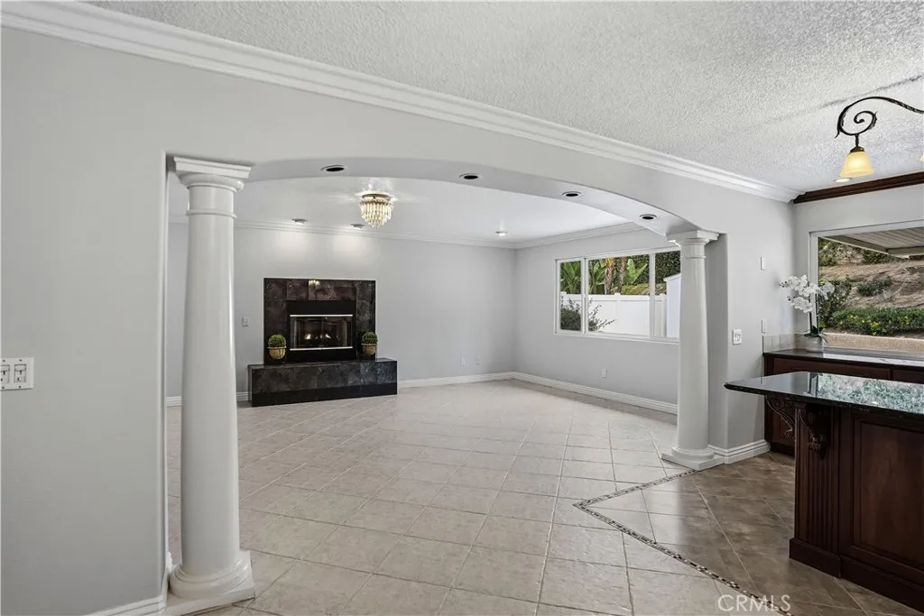 Eye-catching curb appeal includes white Roman column trim framing the garage, a travertine entry step, and classic Roman pillars flanking the front door and front patio area. Inside, the beautifully rebuilt kitchen showcases rich dark wood cabinetry, a striking granite island, glass-front display cabinets, and extended pantry storage with custom pull-out shelving. New windows provide views of the finished backyard and expansive concrete patio with Alumawood cover and integrated lighting. Roman columns frame the transition into the added on family room, featuring a fireplace and custom wood built-ins ideal for entertaining.