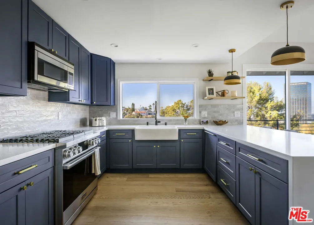 Perched above the trees south of the Boulevard, this newly remodeled Hollywood Hills home embraces light, space, and design with effortless confidence. Walls of glass frame sweeping canyon and city views, drawing the outdoors into daily life. The main level is designed around connection and light. The kitchen acts as the central bridge between the dining and family room, a seamless flow that encourages gathering and conversation. Nearly every room opens to a balcony, blurring boundaries and filling the home with air and light. The primary suite feels calm and elevated, featuring a large double walk-in closet and a spacious, spa-inspired bath with a soaking tub, standing shower, and double vanity. The lower level adds versatility with a private guest quarter that doubles as an office, studio, or gym. Outside, a newly refinished expansive deck is tucked among mature greenery, creating a secluded backdrop for outdoor dining and quiet moments. Modern comforts include a direct-access two-car garage with EV charging and updated systems throughout. Secluded yet connected just minutes from the energy of the Boulevard, yet a world apart. Public record shows 2324 sq ft. Vendor measurements are 2650 sq ft including the guest quarters.