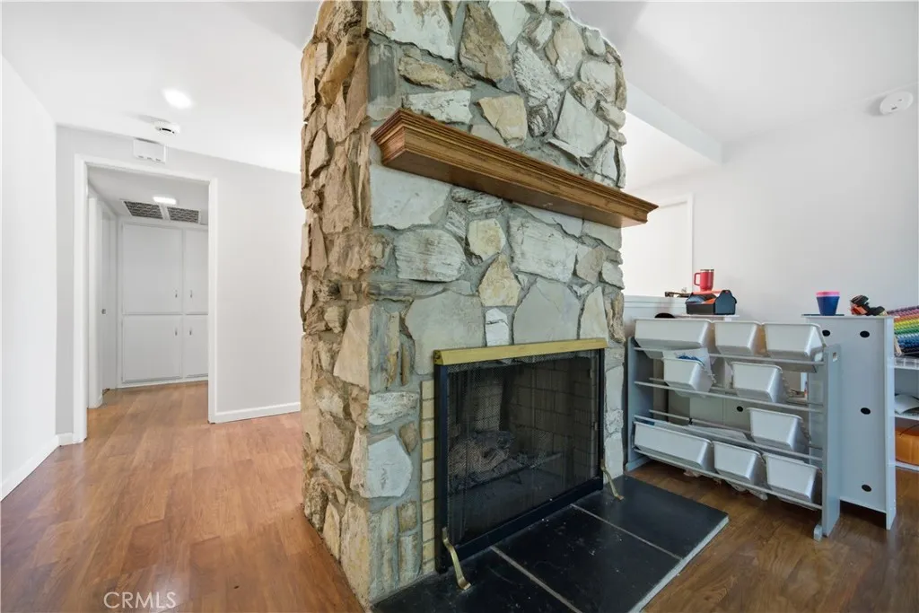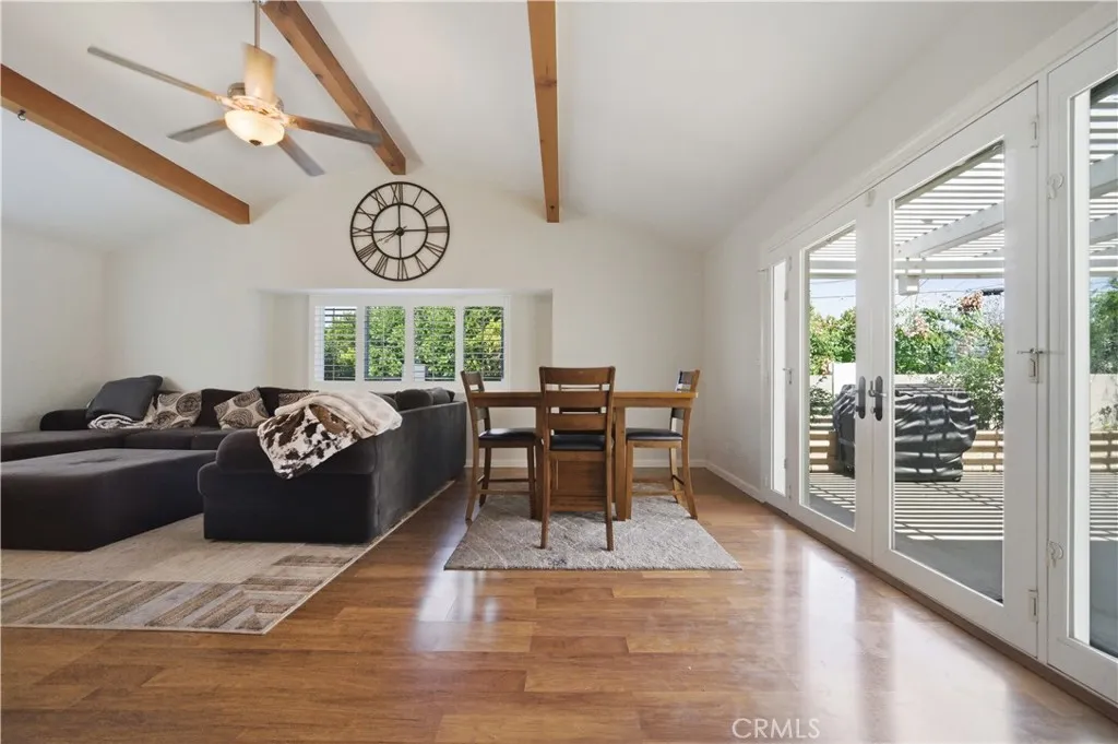 Welcome to this well maintained 4 bedroom, 2 bathroom home located in the Central Corona area. The home offers two separate living spaces, including a spacious family room with vaulted ceilings, exposed wood beams, and direct access to the backyard through French doors. One of the living areas features a stone fireplace, creating a warm focal point within the home.