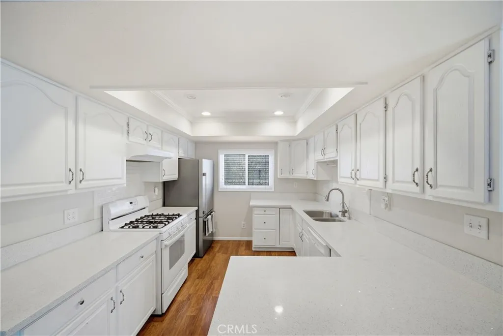 The kitchen includes white quartz countertops, ample cabinetry, recessed lighting, and a functional layout with generous counter space. The open flow between the kitchen and living areas provides flexibility for everyday living and entertaining.