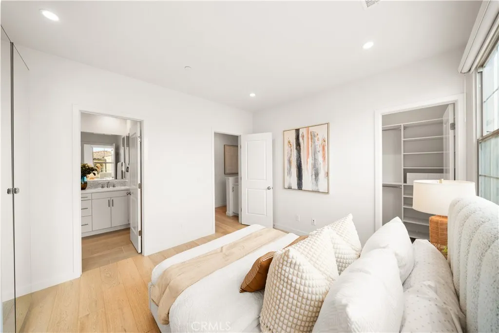 Situated in the serene hillside setting of Portola Springs, 184 Elkhorn is a beautifully maintained Brisa Plan 1 condominium in the heart of Irvine. The home showcases high-end engineered hardwood flooring throughout, creating a seamless and elevated feel, complemented by a bright, open layout designed for both comfort and functionality. The modern kitchen is thoughtfully appointed with quartz countertops, white shaker-style cabinetry, stainless steel appliances, and a generous island with bar seating, seamlessly connecting to the living and dining spaces filled with natural light. The seller has also installed a brand-new premium heated water purification system, along with a whole-house water softener system, ensuring improved water quality, reduced mineral buildup, and enhanced protection for plumbing and appliances. A private balcony off the dining area provides a pleasant extension of the indoor living space. The living room and bedrooms are enhanced with sleek motorized window shades, offering a modern, tech-forward touch while providing effortless light control and privacy. Upstairs, the residence offers two spacious en-suite bedrooms, including a well-designed primary suite with a walk-in closet, dual vanities, and a tiled walk-in shower. Additional highlights include upstairs laundry, high ceilings, recessed lighting, an energy-efficient whole house fan, and a tankless water heater. The direct-access two-car attached garage features built-in storage and is equipped with a Tesla-compatible EV charging outlet, making it ideal for electric vehicle owners. Residents of Portola Springs enjoy access to an impressive collection of resort-style amenities, including Olympic and junior Olympic swimming pools, clubhouses, tennis and sports courts, beach volleyball courts, parks, playgrounds, and miles of scenic walking and biking trails. Ideally located near the top of the community, this home is within walking distance to Loma Ridge Elementary School and Portola Springs Community Park, just minutes from Woodbury Town Center and Irvine Spectrum, and a short drive to Laguna Beach and John Wayne Airport.