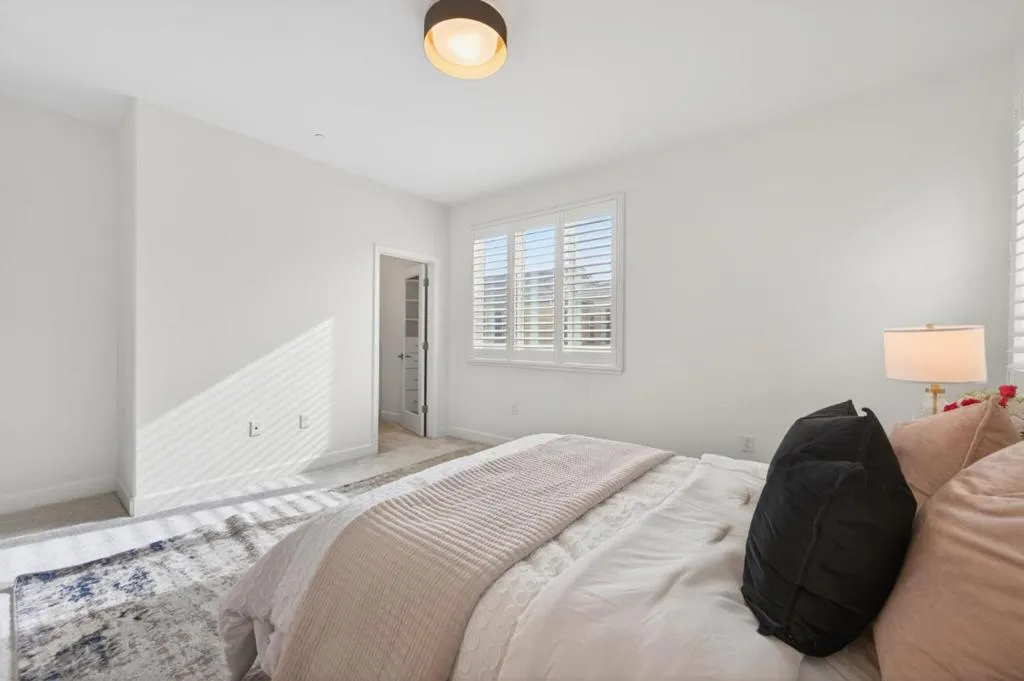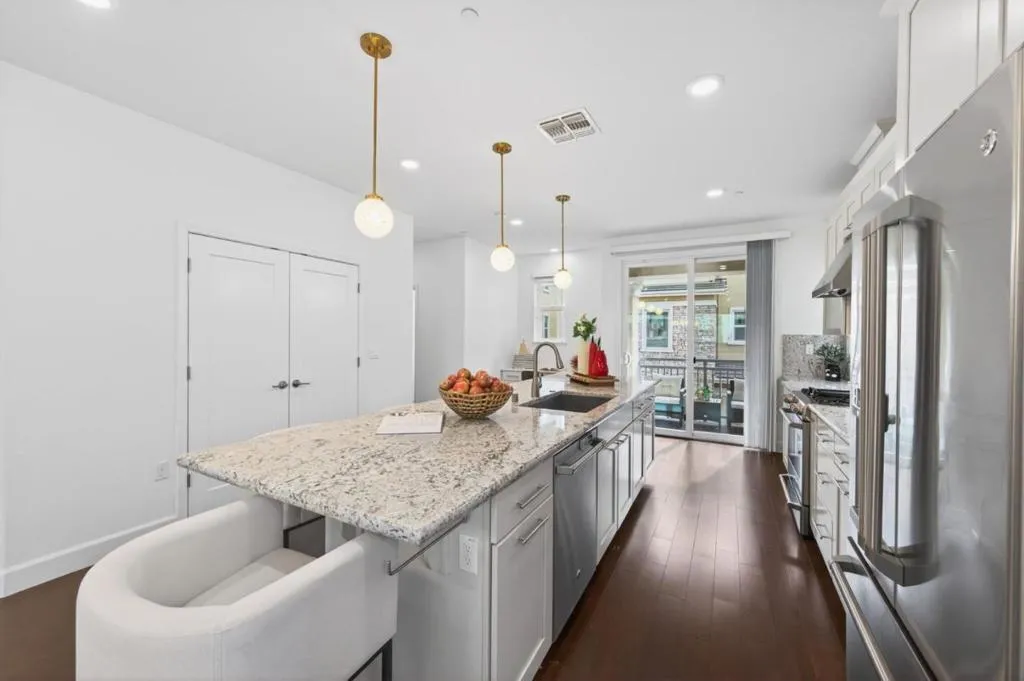 Discover elevated living at Avenue One. This turnkey, upgraded 4-bedroom, 3.5-bath end-unit townhome is just 9 years old and is located on the interior side of the community, offering a quieter setting away from freeway exposure. The sought-after floor plan features the community's largest kitchen island, paired with an expansive pantry. The light-filled open-concept living level flows from the kitchen to the living and dining areas and extends to a private balcony. Finishes include granite countertops, stainless steel appliances with a gas range, soft-close cabinetry, recessed lighting, custom fixtures, and built-in storage. A first-floor bedroom with a full bath offers flexibility for guests or a home office. Upstairs, the primary suite features dual vanities, a walk-in shower, a soaking tub, a walk-in closet, two additional bedrooms, and a side-by-side laundry. Additional highlights include wired AT&T Fiber internet, 3-zone HVAC with independent climate control including an Ecobee smart thermostat, smart-home features, and a two-car garage equipped with 240V EV-ready outlet. Residents enjoy a clubhouse with pool, spa, fitness center, BBQ areas, playground, gated dog park, nearby parks, and convenient access to Costco, Village Oaks, VTA Light Rail, and Highways 85 and 101.
